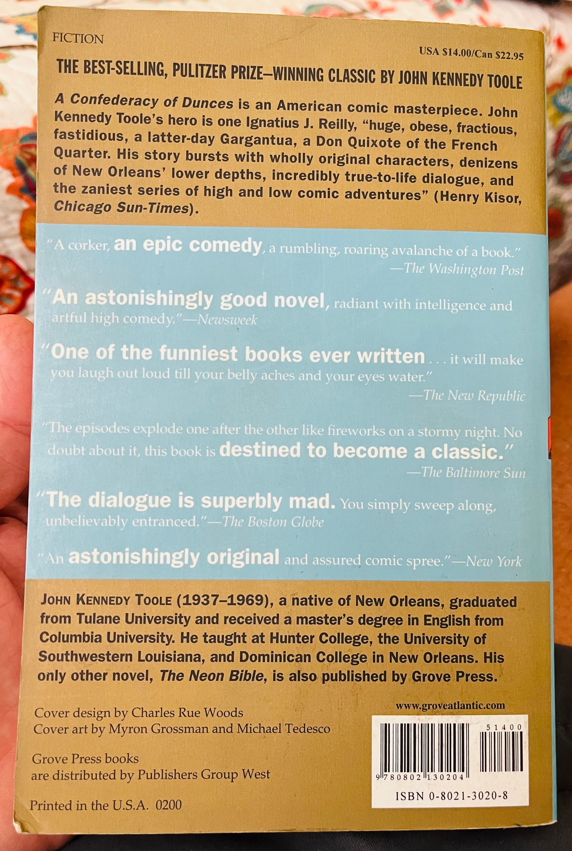 A bit about the author. He was considered a child progidy (a math whiz) starting high school at 12 and finishing at 16. At twenty-two, Toole became the youngest professor in the history of Hunter College. Sadly, he was dead by 31. His book has attained cult-like status over the years since first published more than 40 years ago.