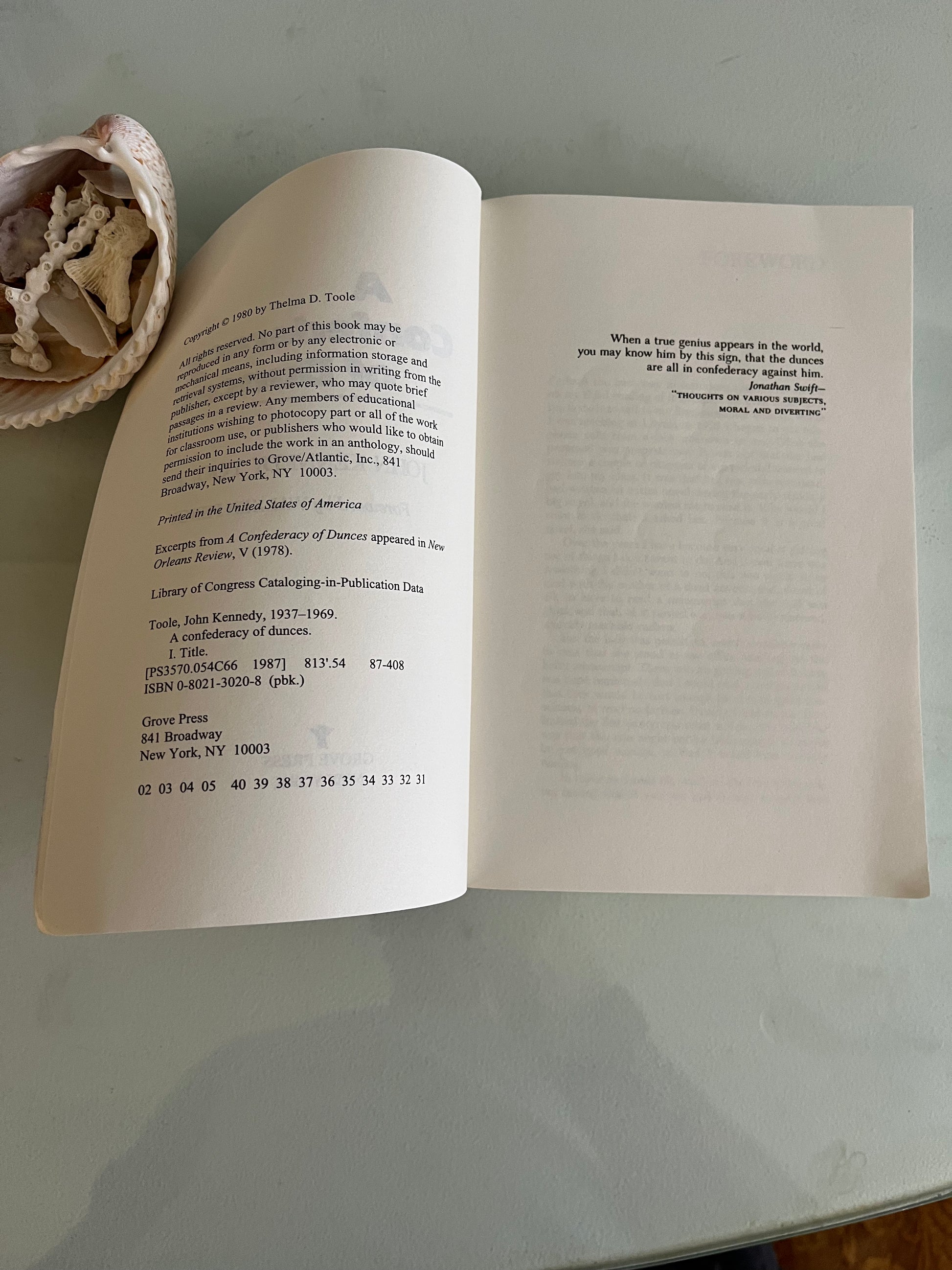 This was Toole's posthumously published first book. The book was published 12 years after the authors death. He was depressed over the fact that he could not get his work published. The title of the book was derived from a Jonathan Swift quote: "When a true genius appears in the world, you may know him by this sign, that the dunces are all in confederacy against him.” Many who have read the book assume that Ignatius J. Reilly, the main character, is Toole’s comically exaggerated alter ego.