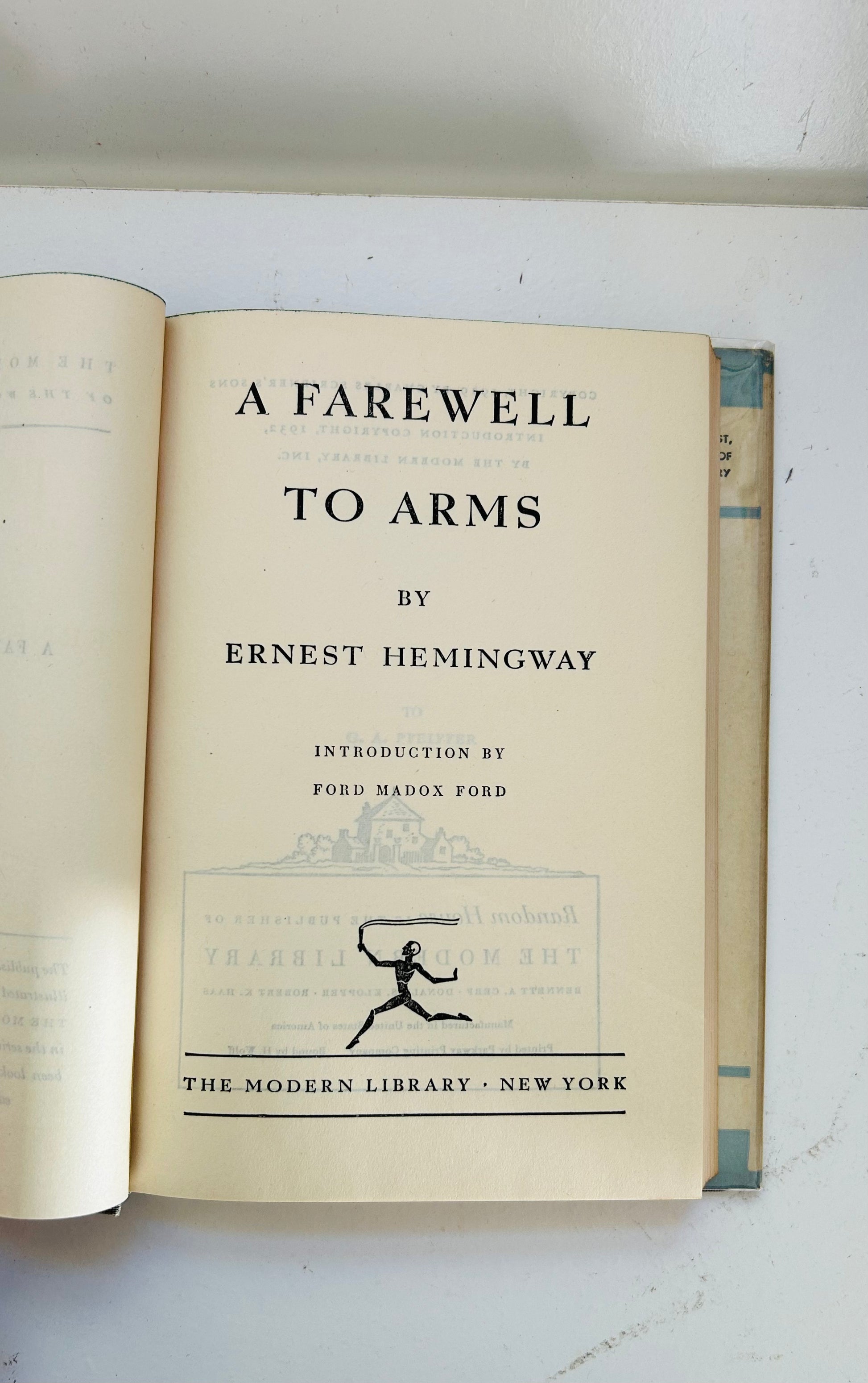 Ernest Hemingway. First edition thus. New York: The Modern Library, 1932. NAP. Both unclipped, scarce dust jacket, in a mylar protective wrapper, and hardcover are in Near Fine condition. No writing or markings found in this well-preserved edition, 355 pp. The introduction is written by Ford Madox Ford. Some minor chipping on top of spine, otherwise, one of the nicer DJ we've seen for this edition!