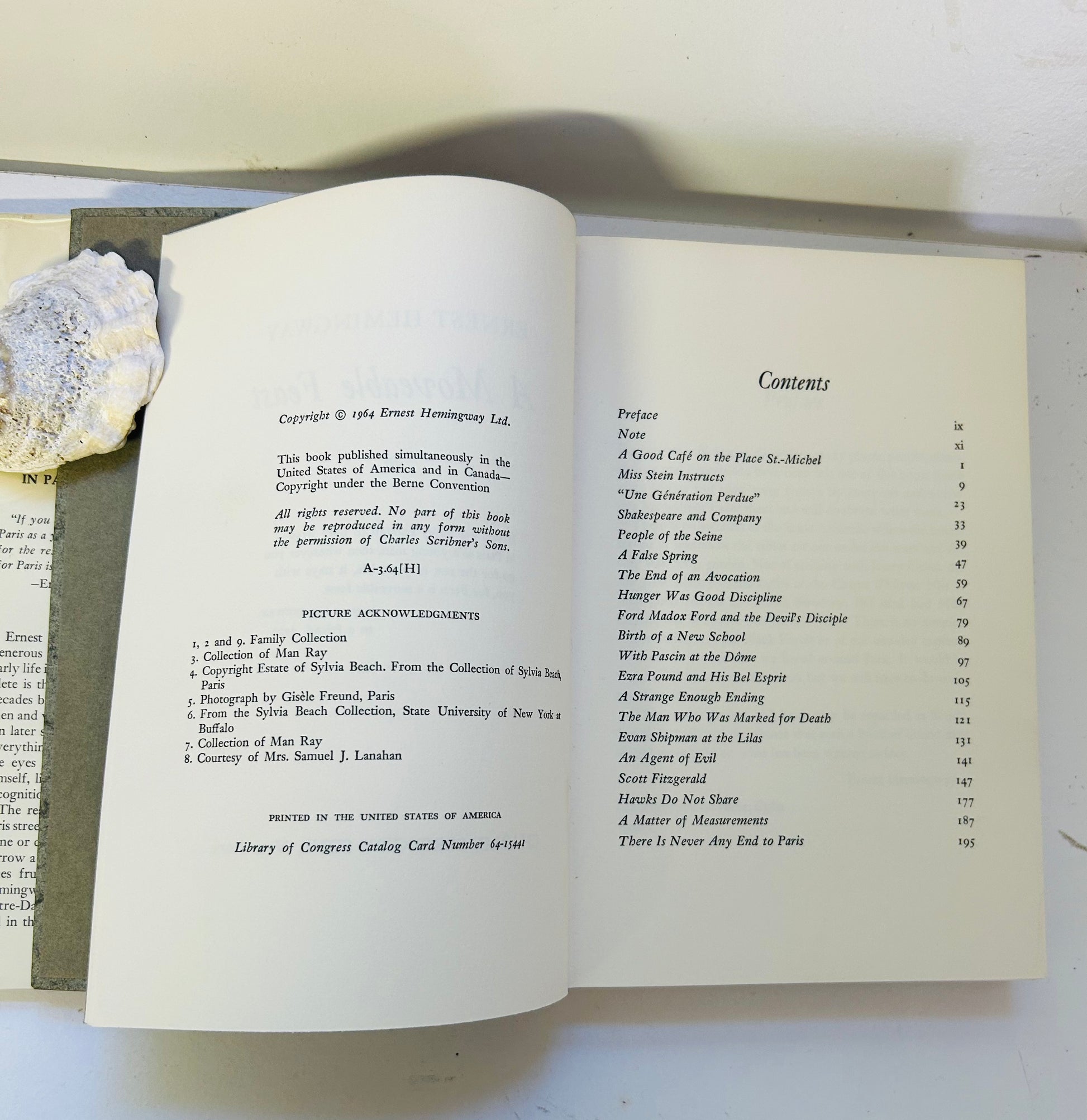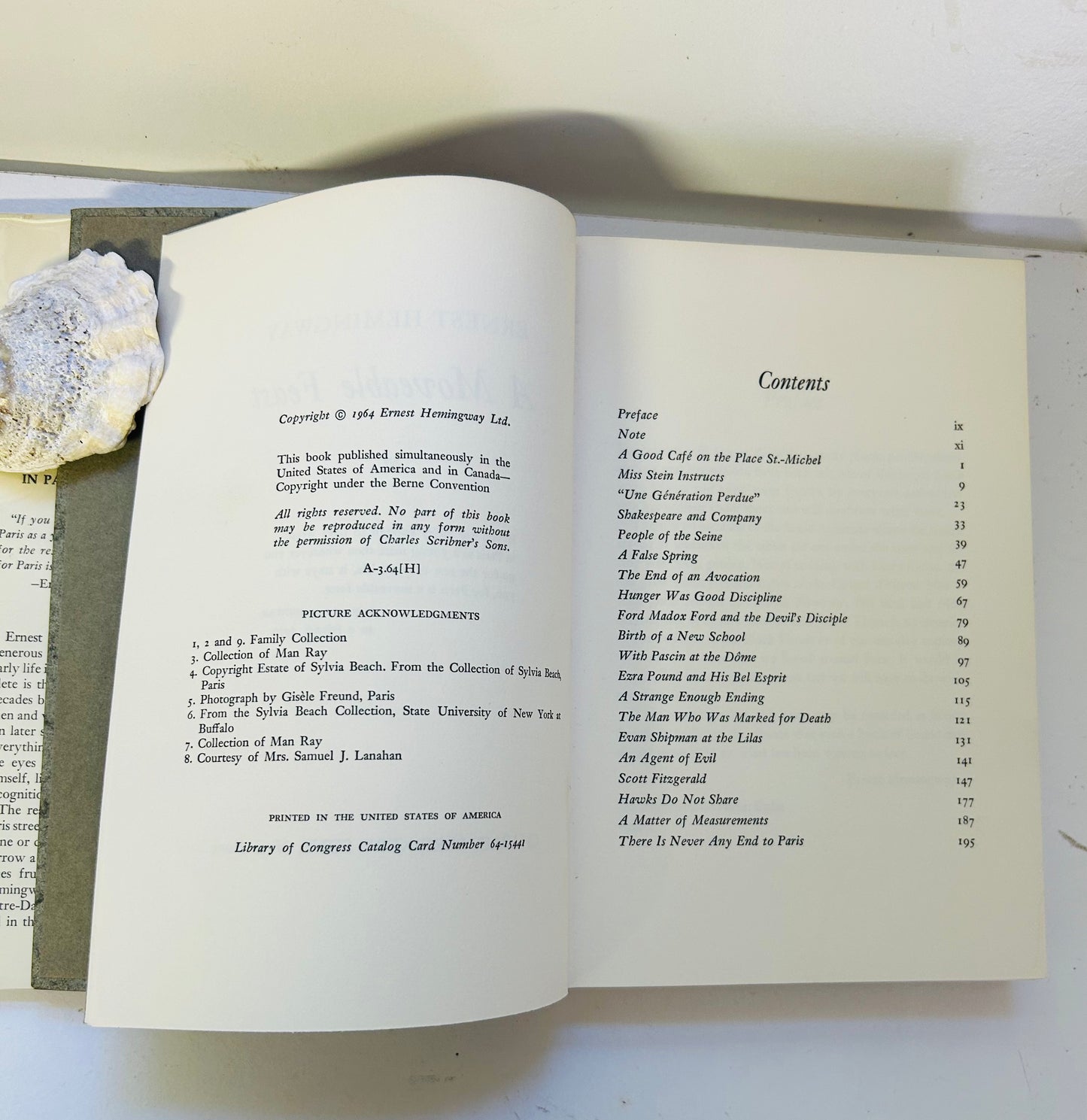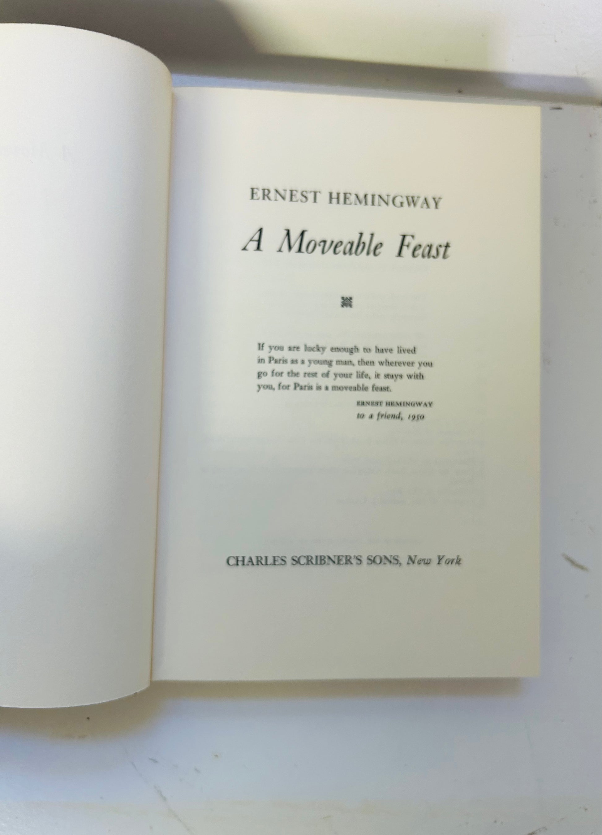Ernest Hemingway. First edition, first printing. Dust Jacket: Very Good+ An unclipped jacket with original price $4.95 on inside flap (was eventually changed to $3.95). There is some minor chipping on the spine. There are a small areas that have some chipping on the bottom front of the cover. Otherwise, the jacket is in great condition. In a mylar protective wrapper. Hardcover: Near Fine. New York: Charles Scribner's Sons, 1964. Has the appropriate publishing mark, A-3.64(H), denoting a first edition. No writing or markings in this well preserved edition, 211 pp. Grey speckled cloth with orange spine and gold lettering in cover and spine. Green endpapers and pastedowns. Contains black/white photographs.