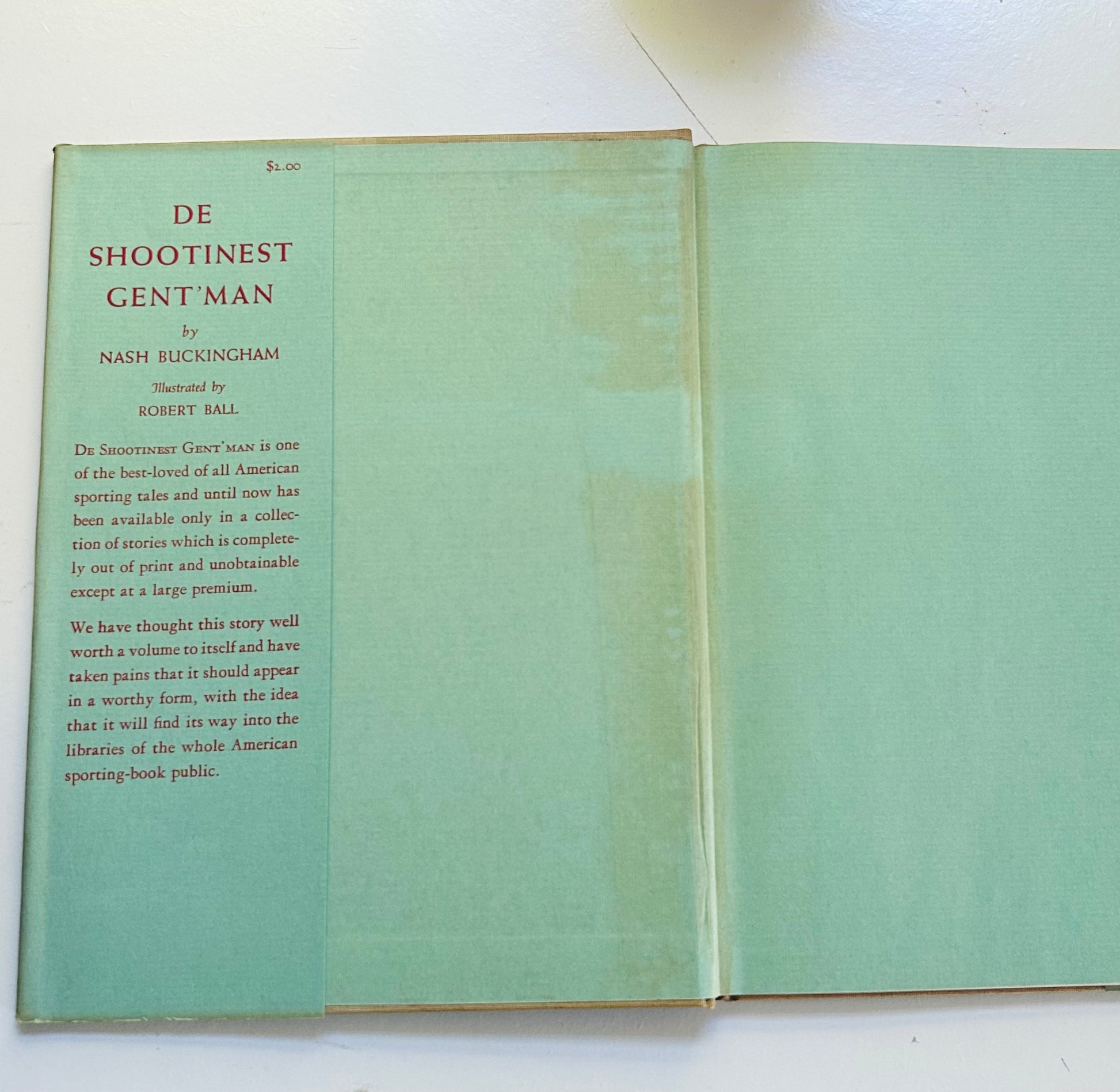 The title De Shootinest Gent’man is written in dialect—an affectionate, colloquial rendering of “The Shootingest Gentleman.” It reflects the Southern, storytelling tone of Nash Buckingham’s work, which often captures the culture of duck hunting in the Mississippi Flyway with rich, regional flavor. The title story and others in the collection are framed as tall tales or folk memoirs, often narrated in a rustic Southern voice.