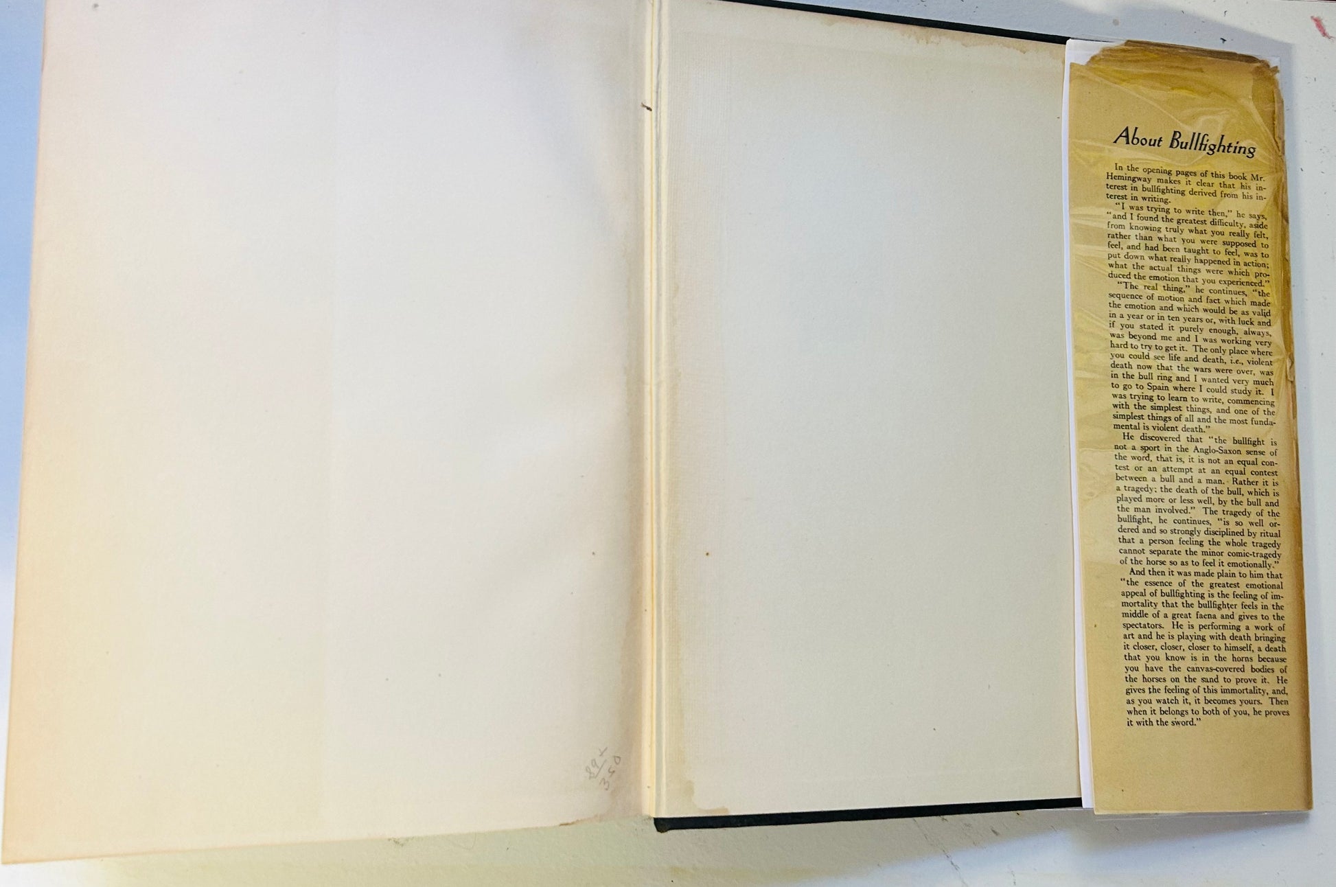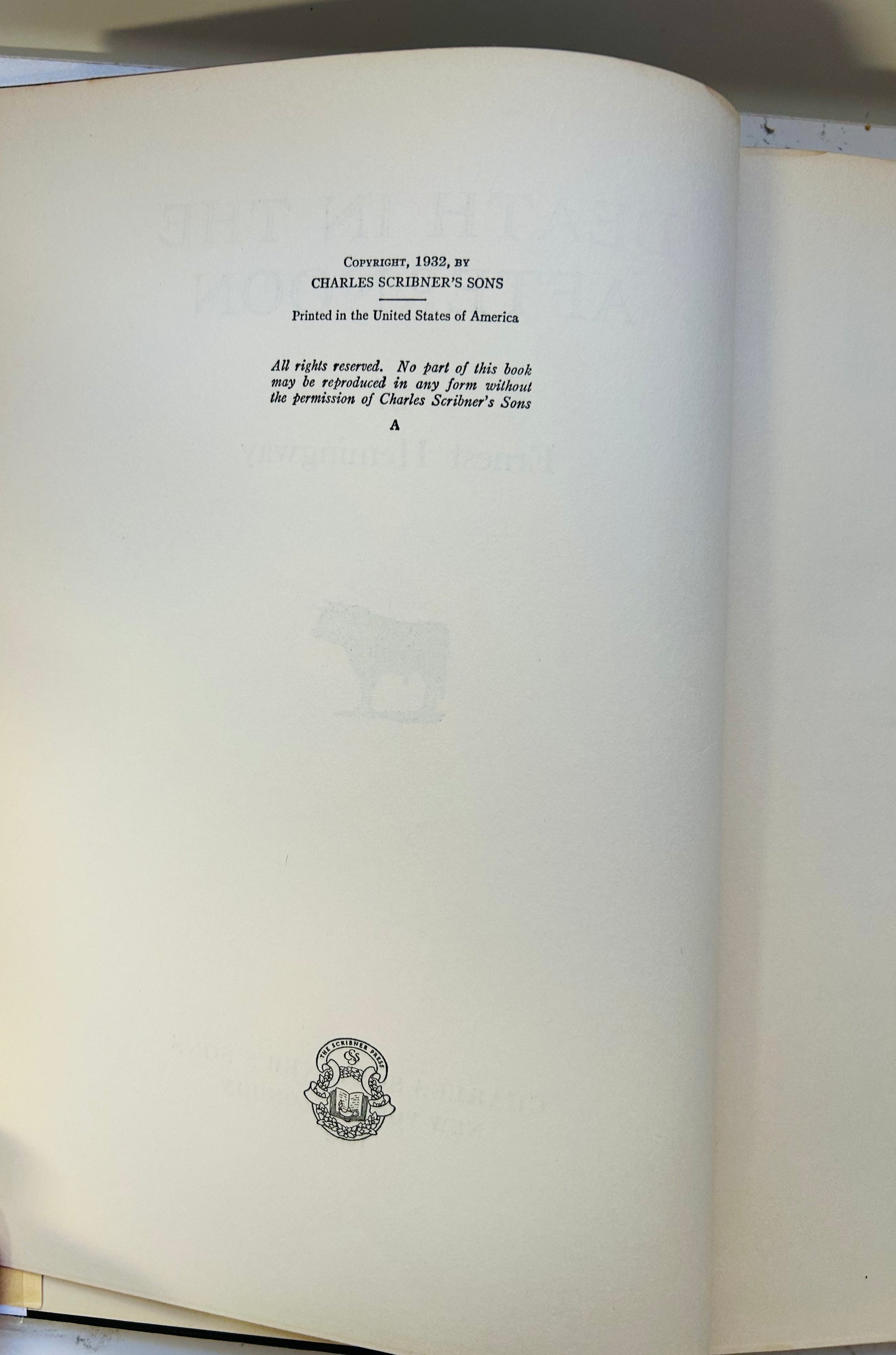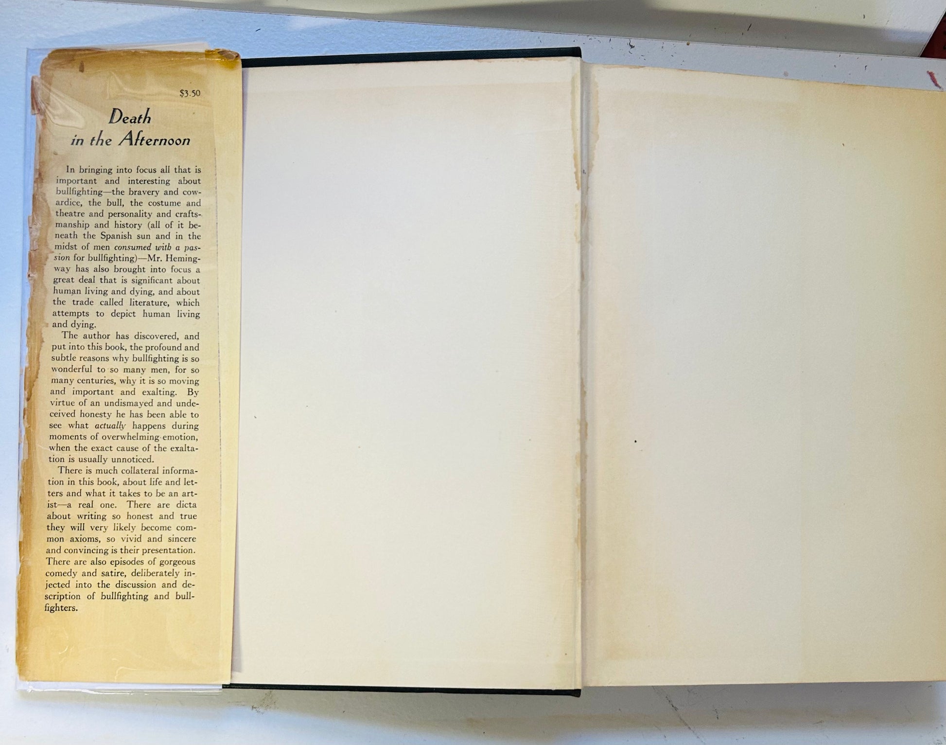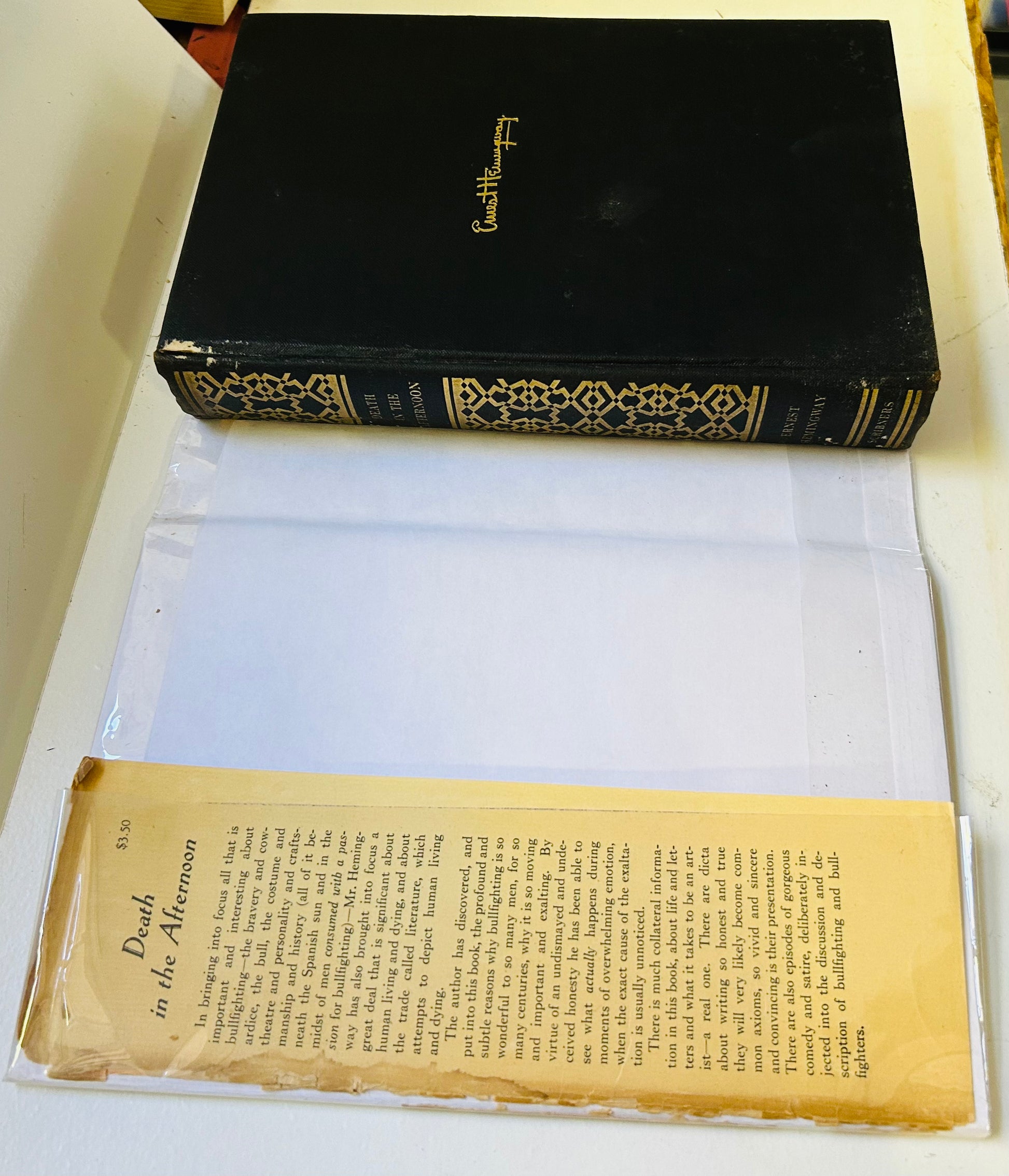 Ernest Hemingway. First edition, first printing. New York: Charles Scribner's Sons, 1932. Has both the Scribner seal and "A" on the copyright page. Both unclipped dust jacket and hardcover are in Very Good and Very Good+ condition respectively. This scarce original, first state, dust jacket, is in a mylar protective wrapper, and has the original price $3.50 on the inside flap. The jacket has chipping along most of the edges. There is also a piece missing from the top/bottom of the spine. In addition, there is some staining along the spine that branches outward on both the jacket and inside the book. No writing or markings found in the book, 517 pp. Contains black and white photographs. Frontpiece by Juan Gris and jacket illustration by Roberto Domingo.