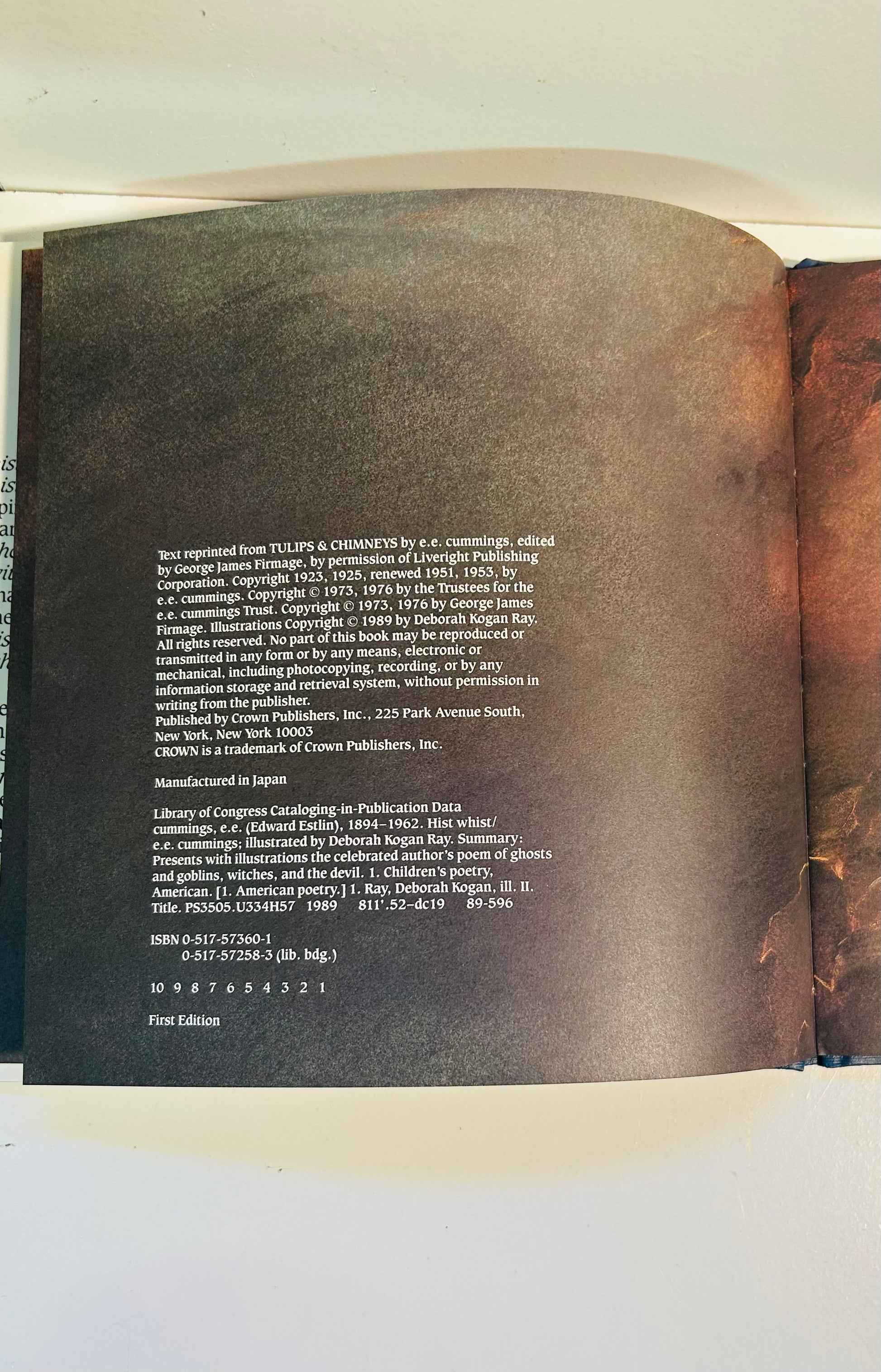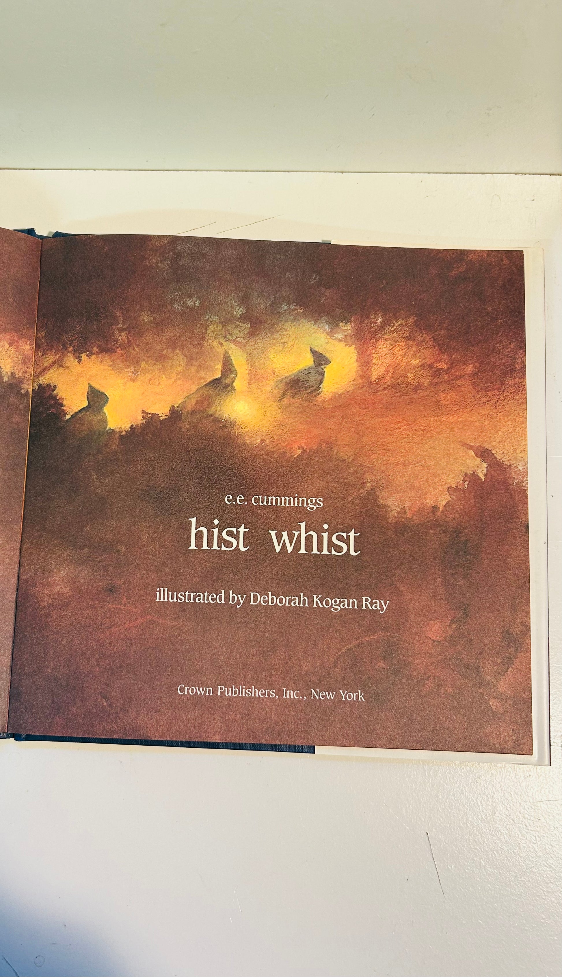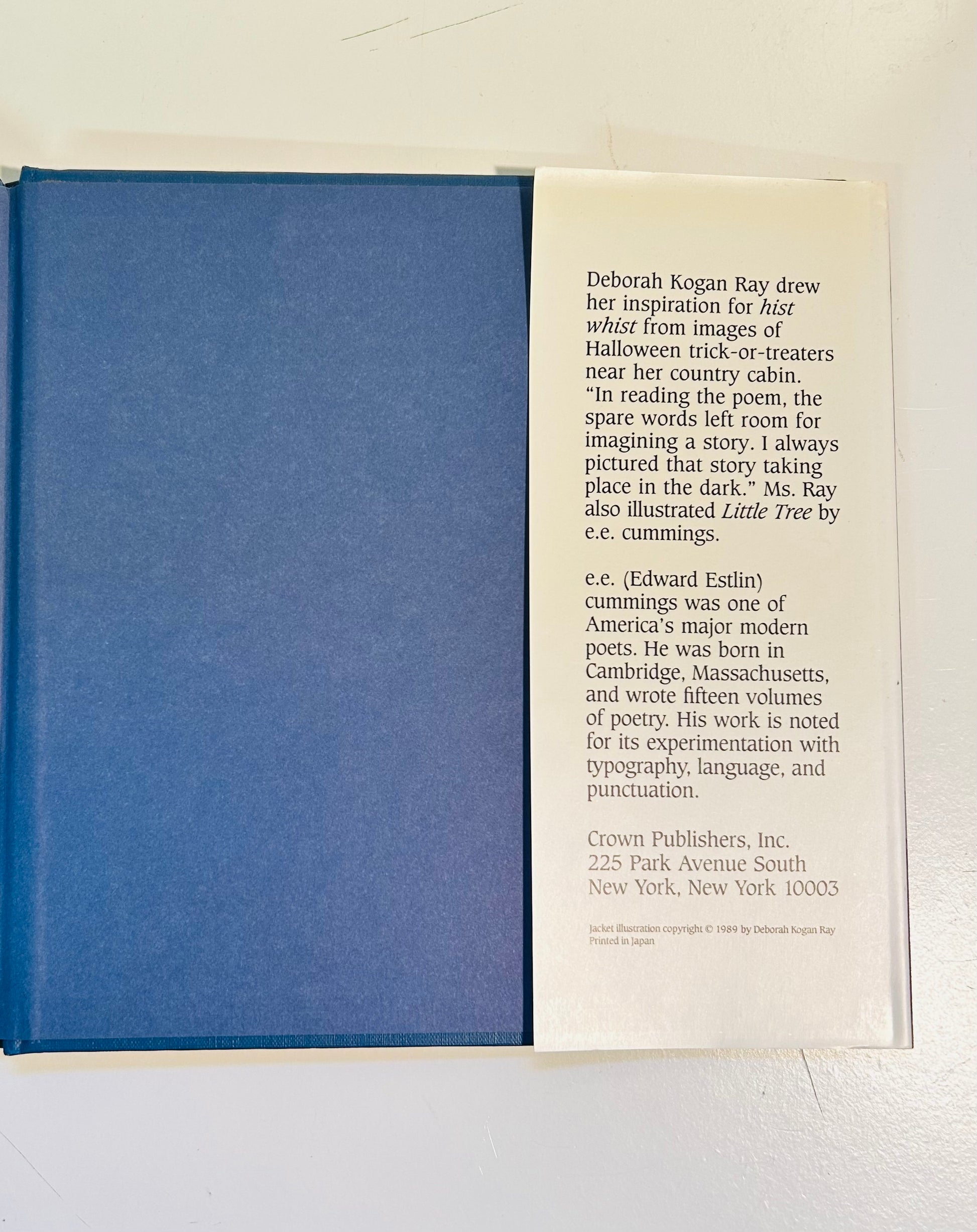 First printing of Hist Whist by e.e. cummings, published by Crown in 1989. Illustrated by Deborah Kogan Ray, this edition brings cummings’s hauntingly playful poem to life with rich, dreamlike watercolors. Originally appearing in Tulips and Chimneys (1923), “hist whist” captures the eerie charm of little “ghostthings” and “witches and tingling goblins.”
