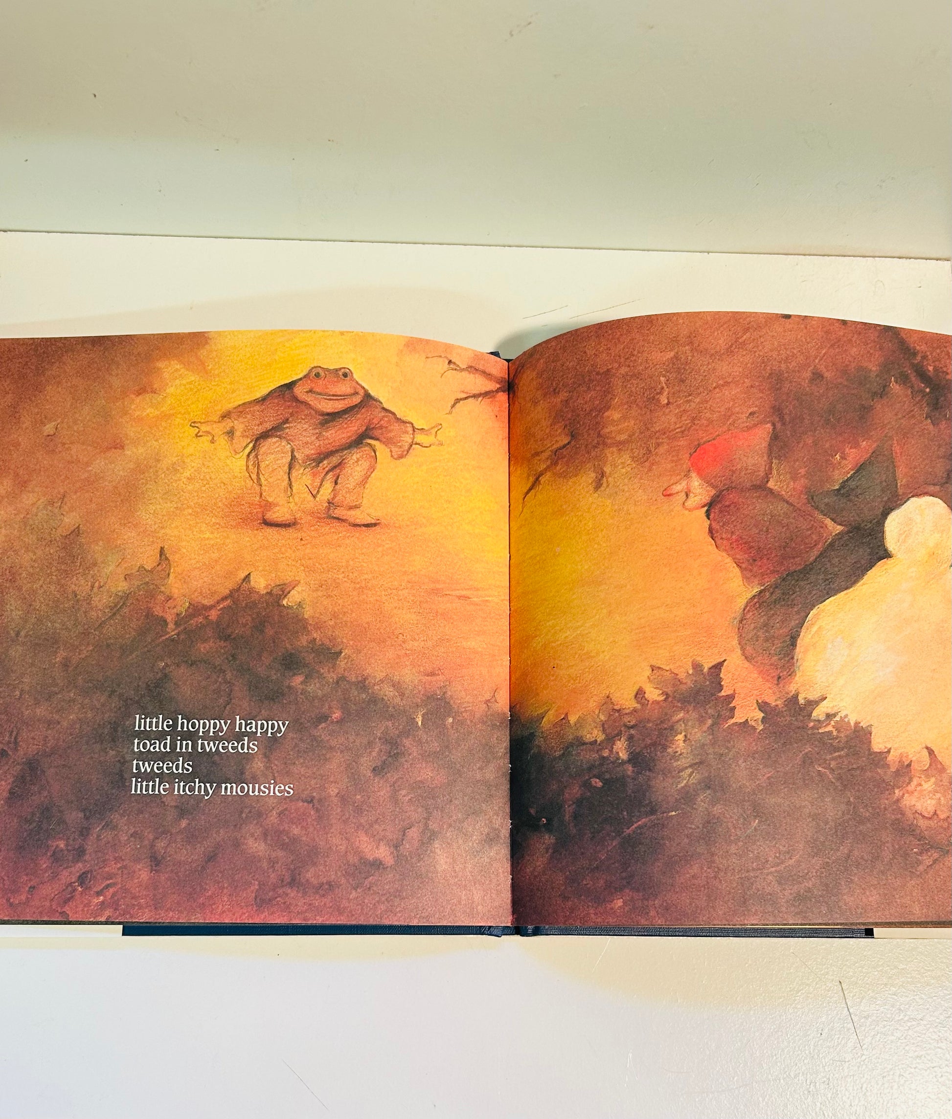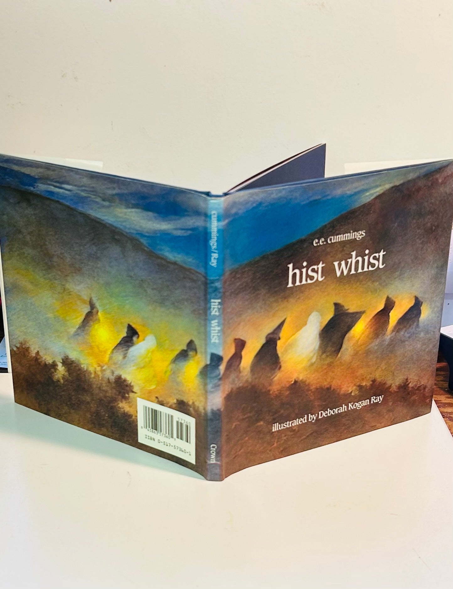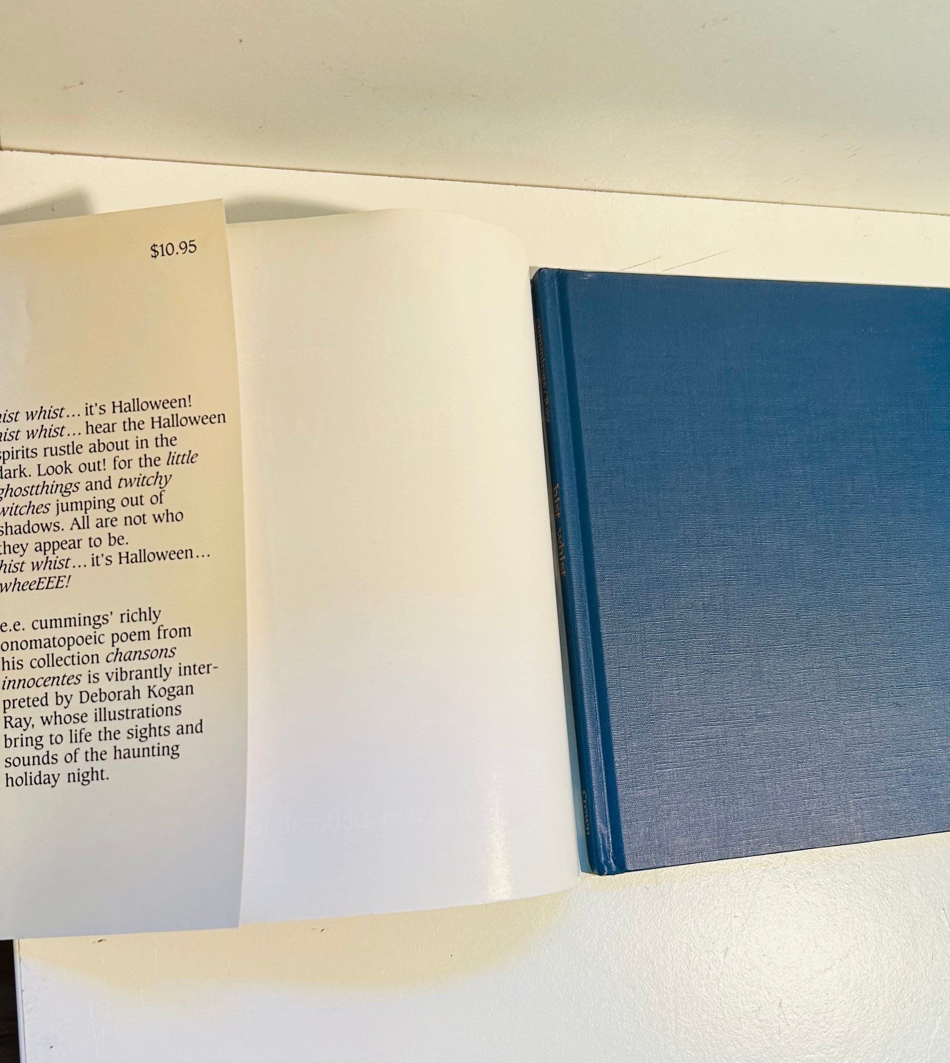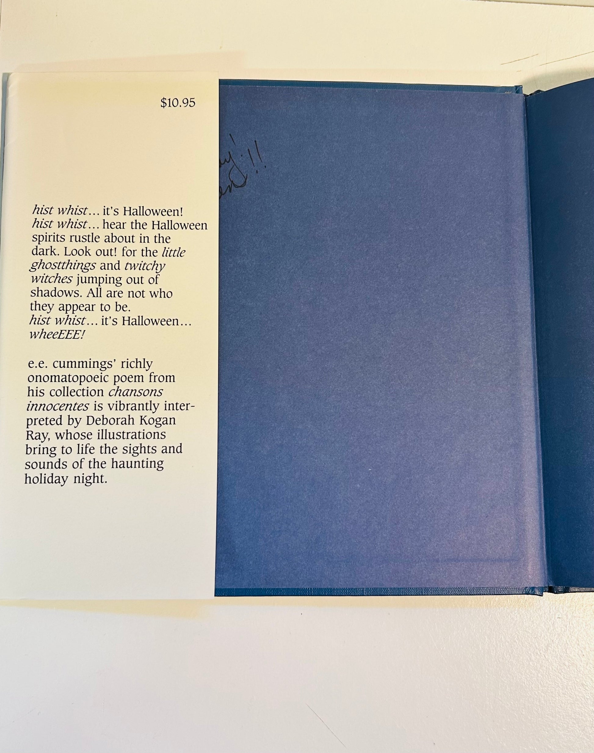 First printing of Hist Whist by e.e. cummings, published by Crown in 1989. Illustrated by Deborah Kogan Ray, this edition brings cummings’s hauntingly playful poem to life with rich, dreamlike watercolors. Originally appearing in Tulips and Chimneys (1923), “hist whist” captures the eerie charm of little “ghostthings” and “witches and tingling goblins.”