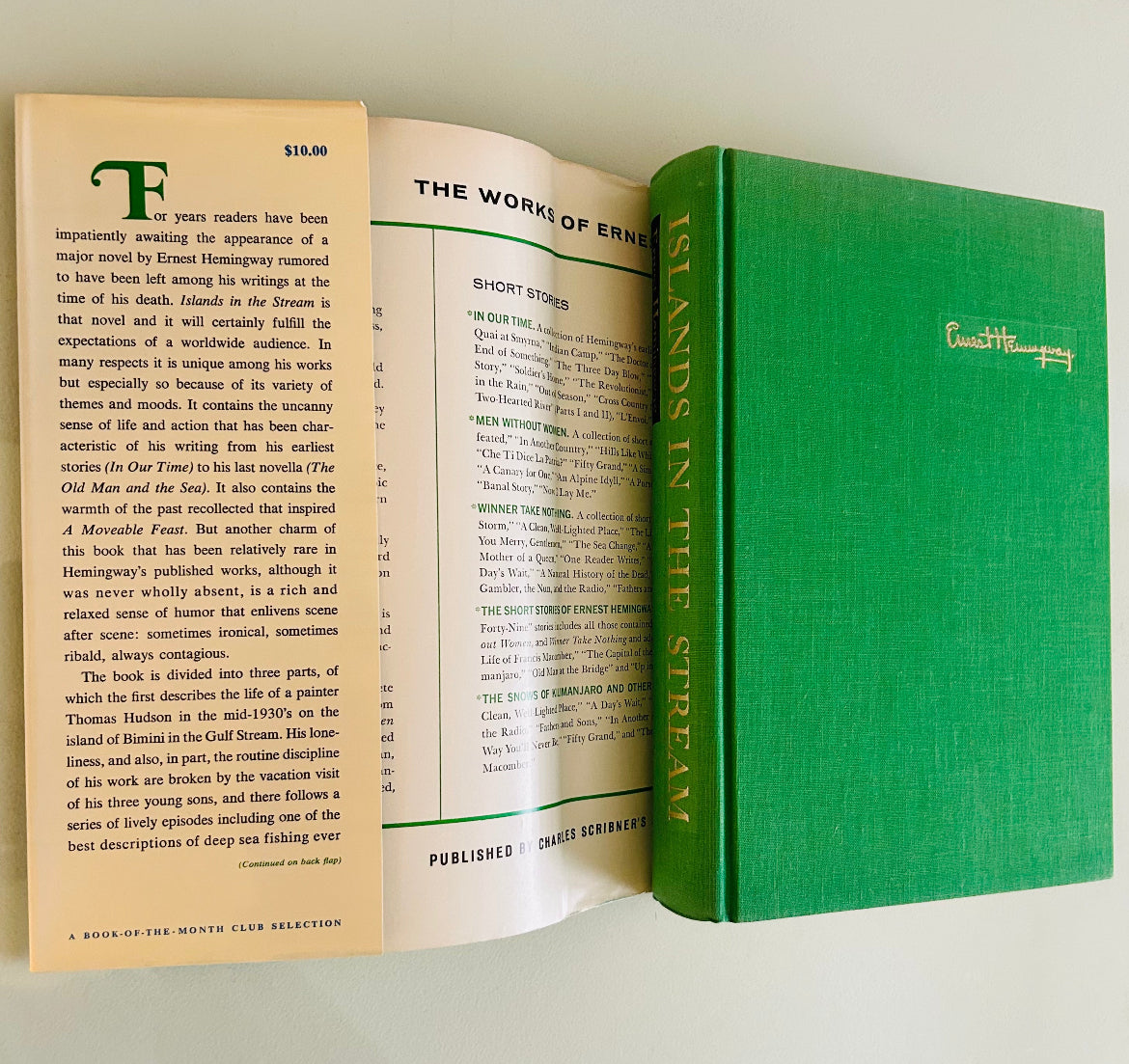 Ernest Hemingway. First American edition. New York: Charles Scribner's Sons, 1970. Unclipped dust jacket is in Very Good+ condition, with original price $10.00 on inside flap. Has a small missing piece on back of jacket. Jacket design by the great Paul Bacon. The hardcover is in Near Fine condition, other than a former owner inscription, the book is very clean. No other writing or markings found in the book, 466 pp. Has the first state dust jacket and A-9.70(V) on copyright page.