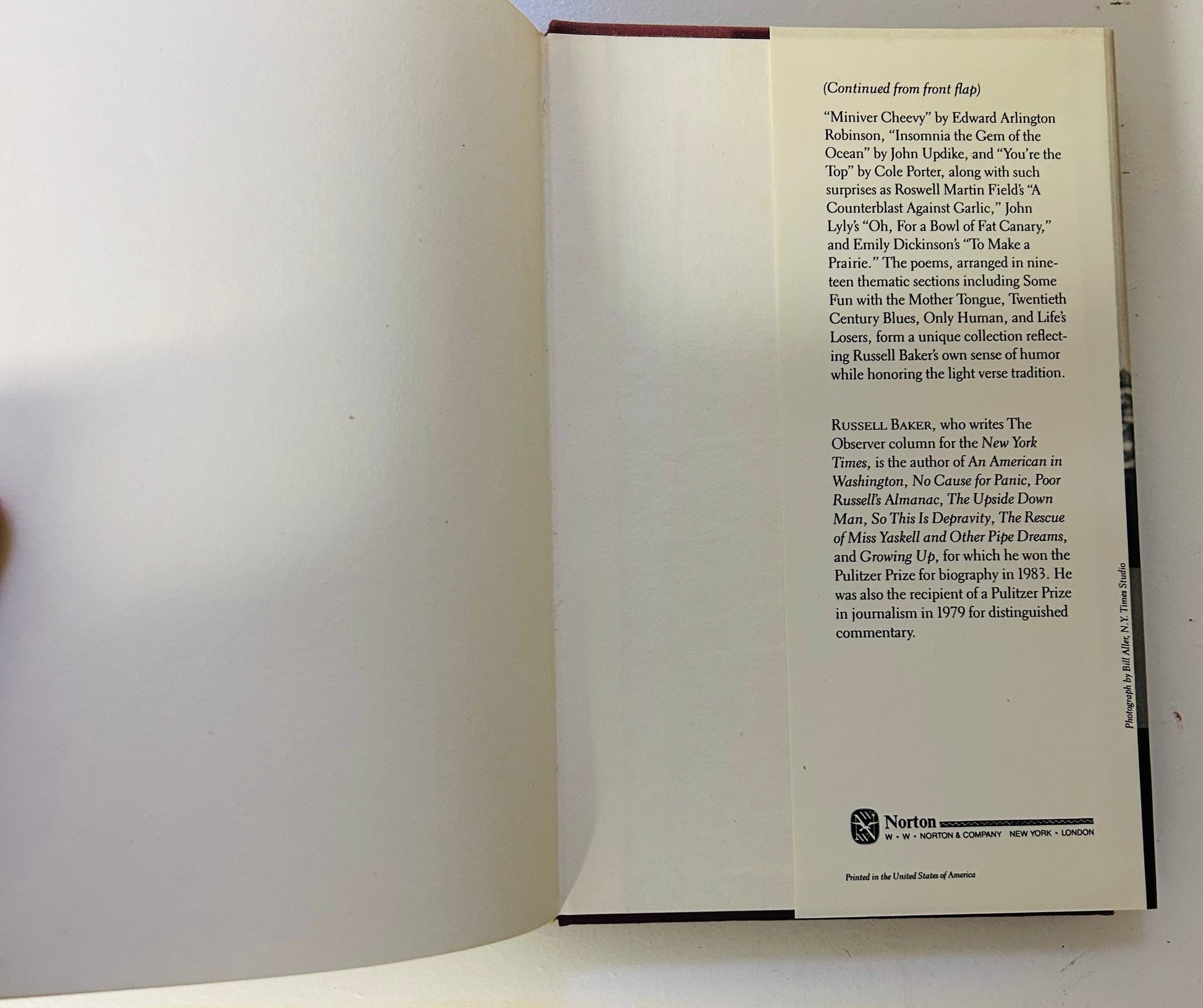 This collection of over 400 poems which Baker has selected to delight, amuse, surprise, and sometimes even shock you. He likens this collection to an amusement park and has chosen the best work of writers who are well known for their light verse, as well as verse by lesser known poets and some famous poets who are not ordinarily thought of as writing in a light vein. Russell Baker wrote for The Observer column for the NEW YORK TIMES and is the recipient of a Pulitzer Prize in journalism.