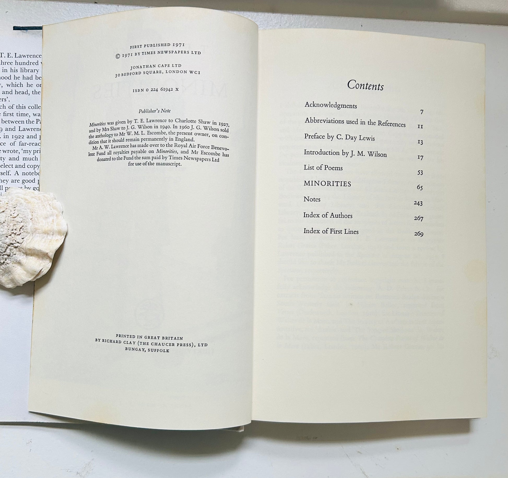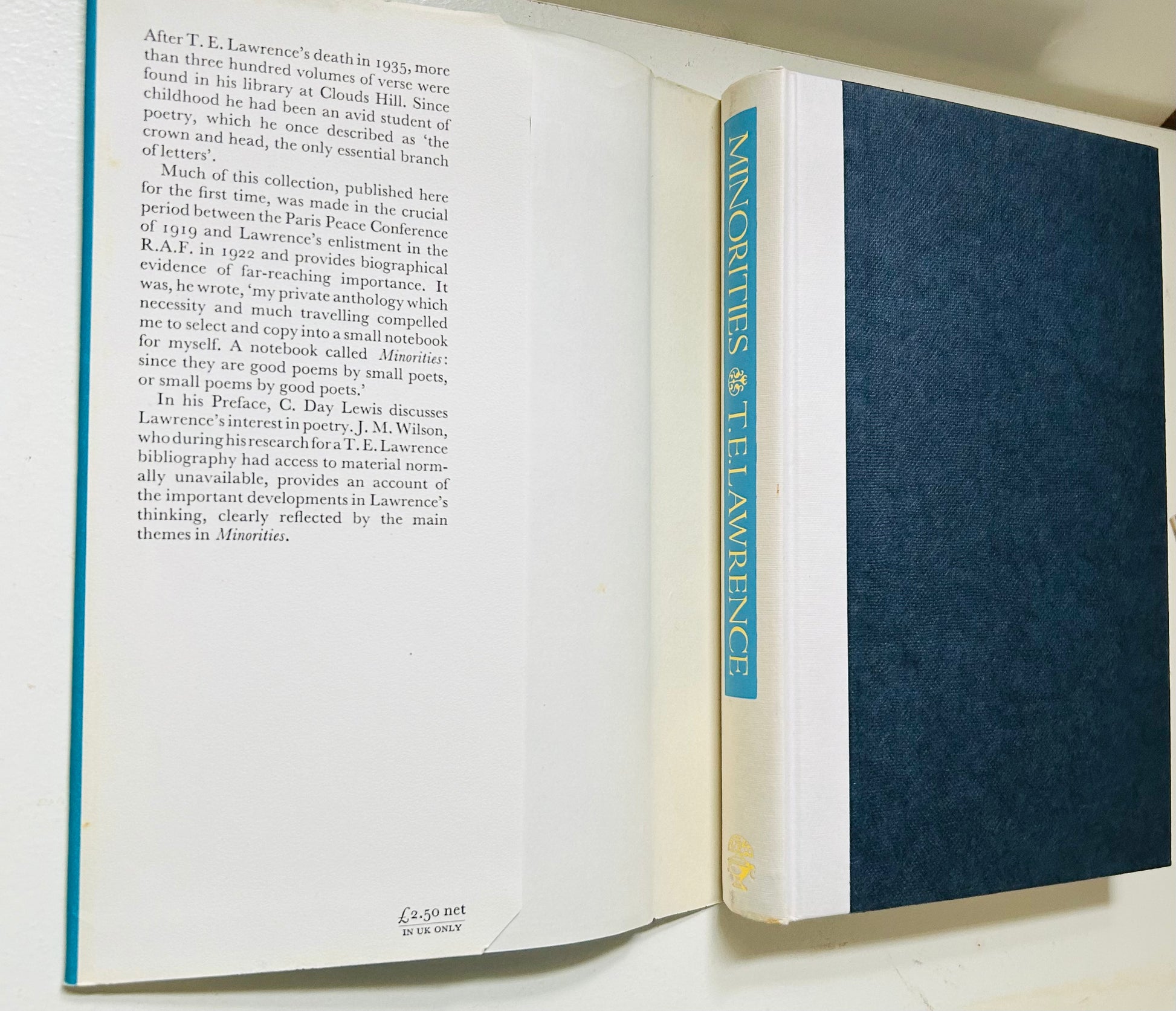 T.E. Lawrence. First U.K. edition, first printing. London: Jonathan Cape, 1971. Both unclipped dust jacket and hardcover are in Near Fine condition. No writing or markings the books, 272 pp. Edited by J.M. Wilson and a four-page Preface by C. Day Lewis. Edited for this publication by the T.E.L. biographer and researcher Jeremy Wilson.