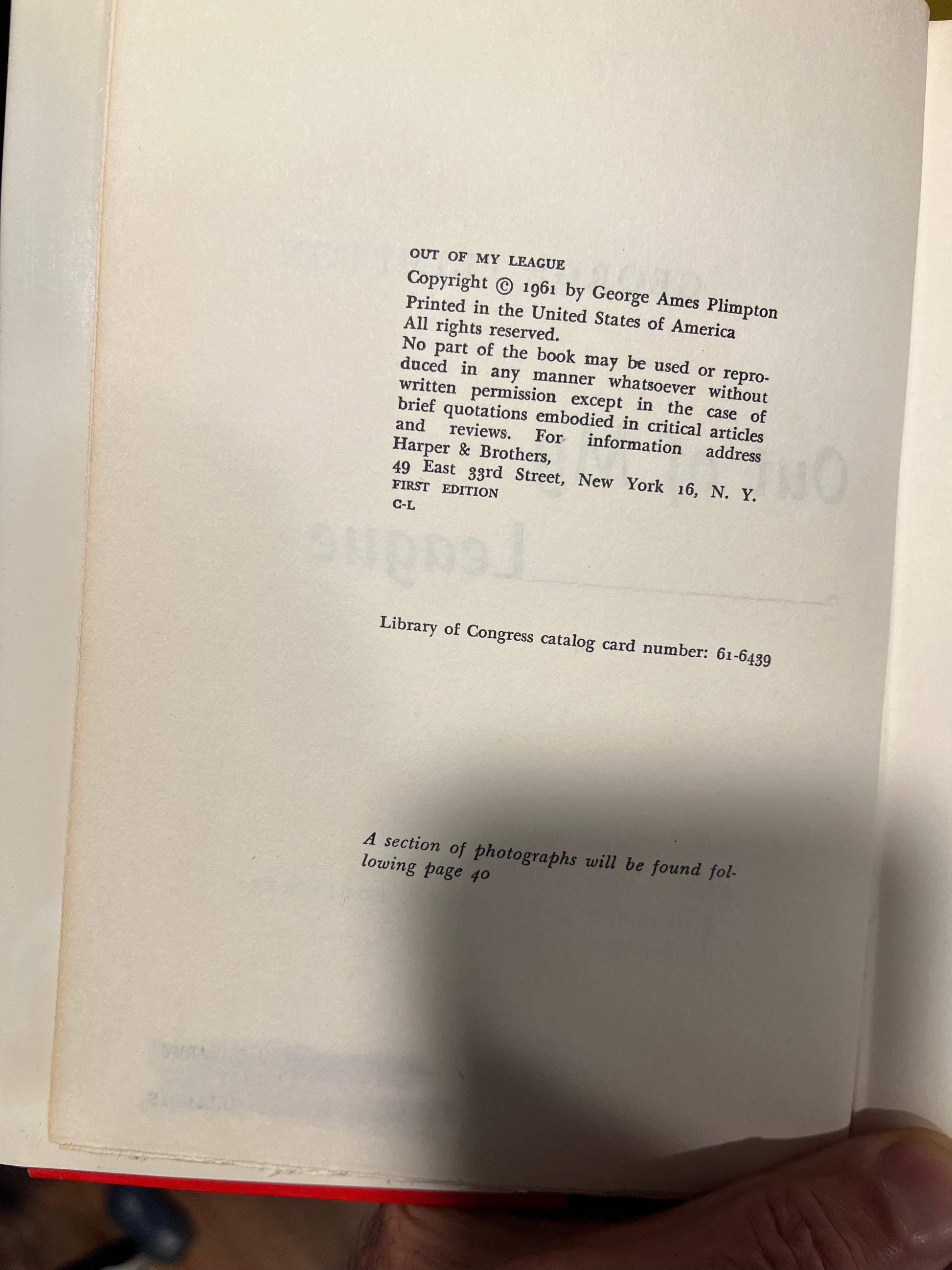George Plimpton. Stated first edition. New York: Harper and Brothers Publisher. A Very Good hardcover in a Very Good unclipped, dust jacket. No writing or markings in the book, 150 pp. Ernest Hemingway testimonial on the front cover. There are four, small black marker smears on the first few pages of the book otherwise, no other writing.
