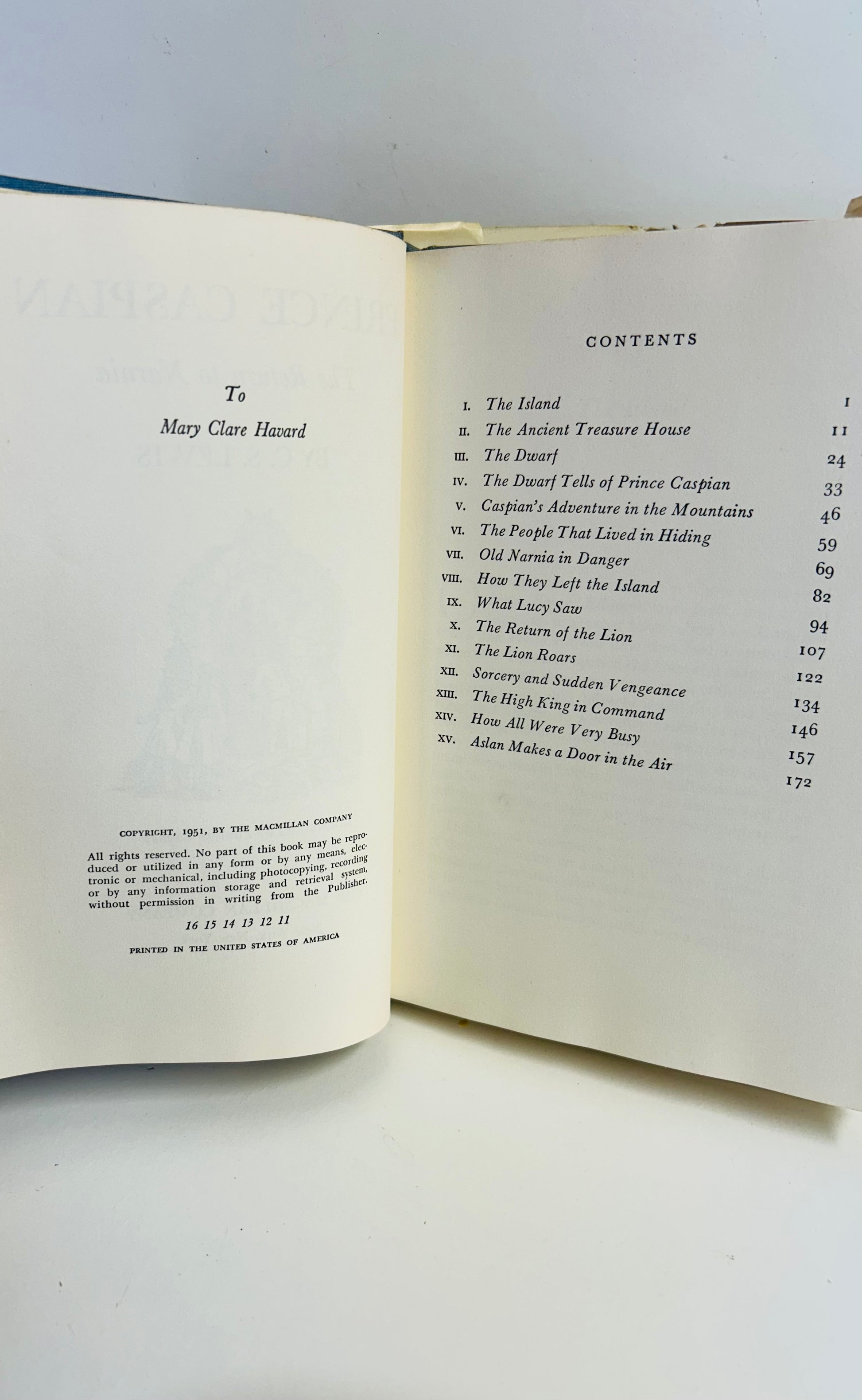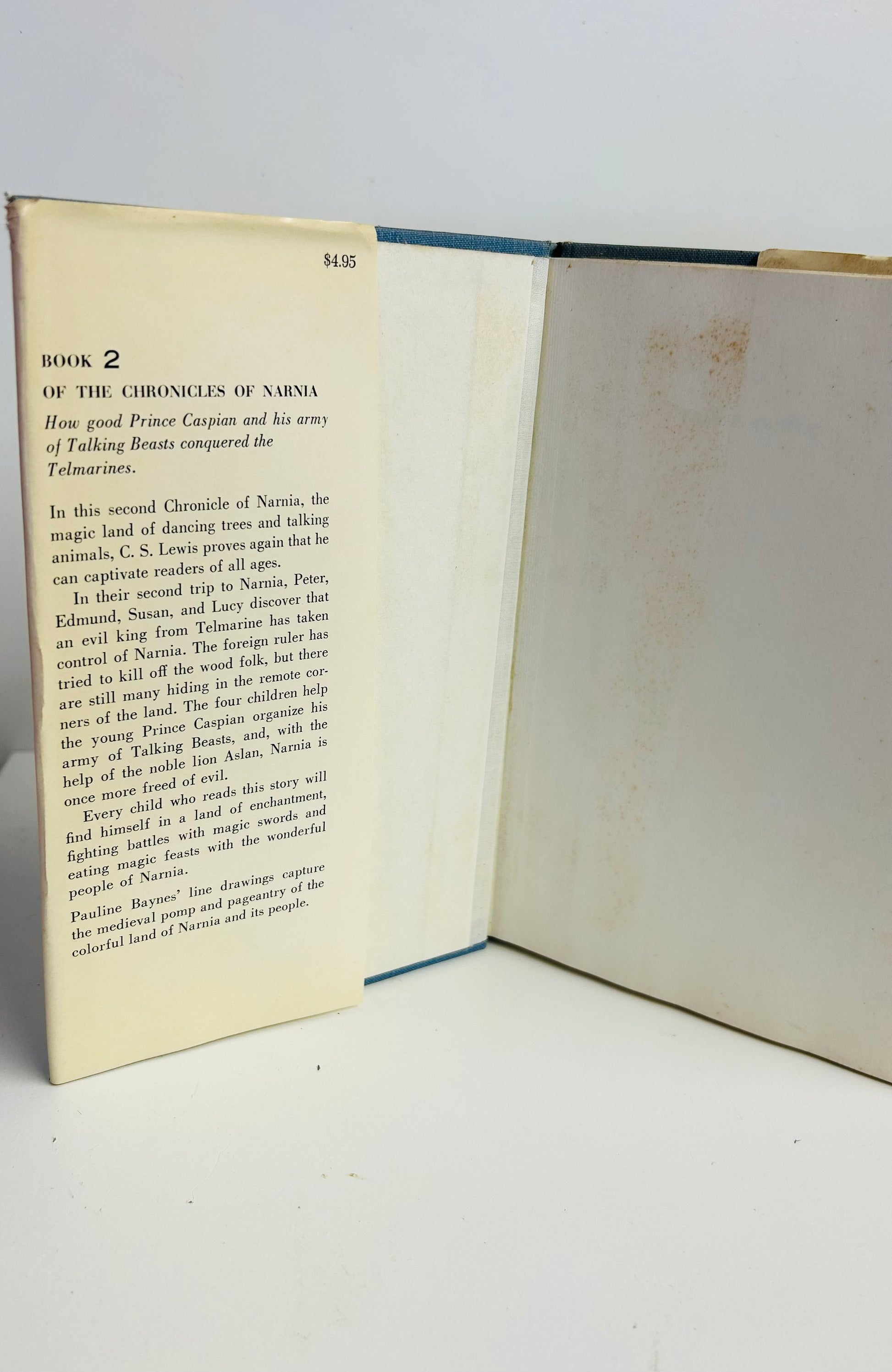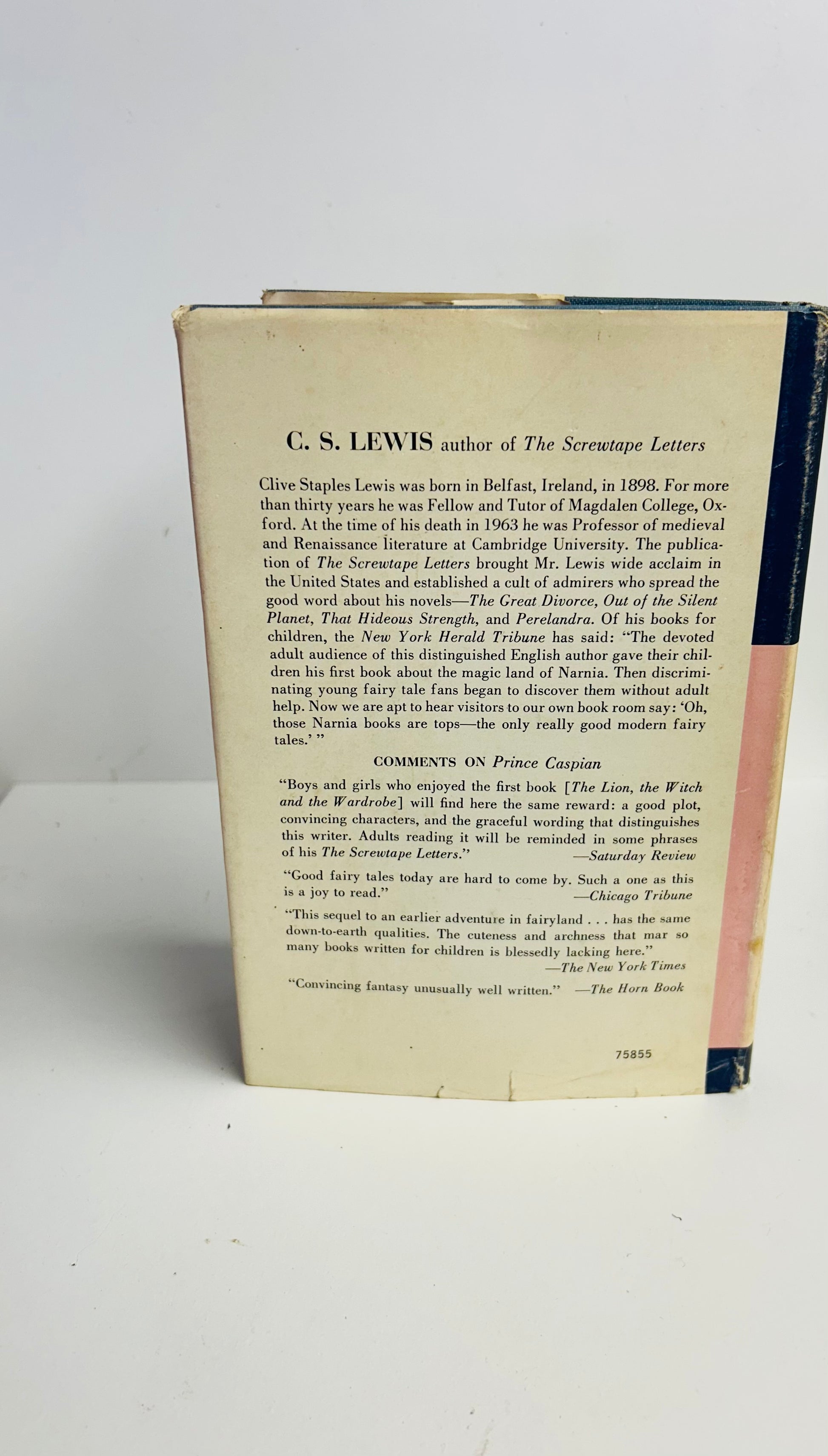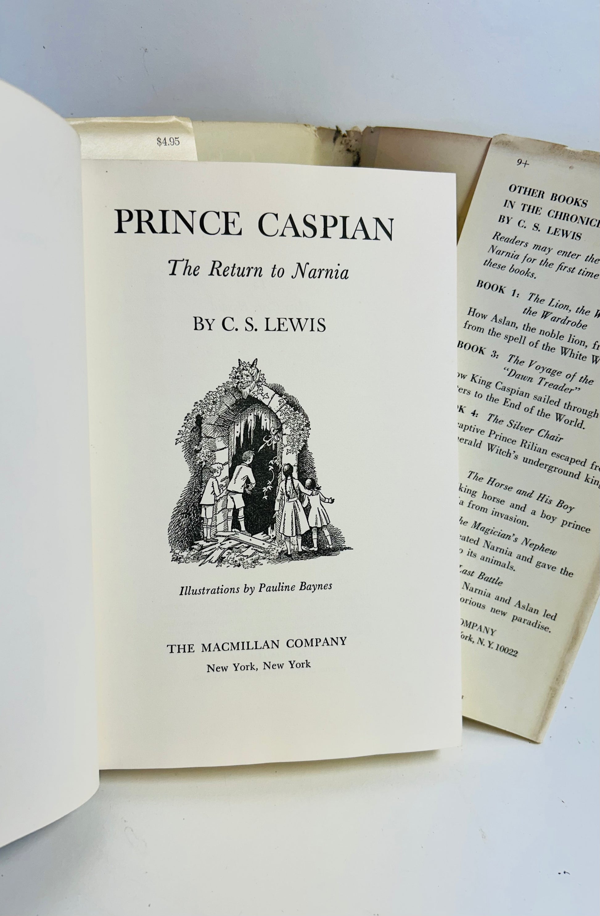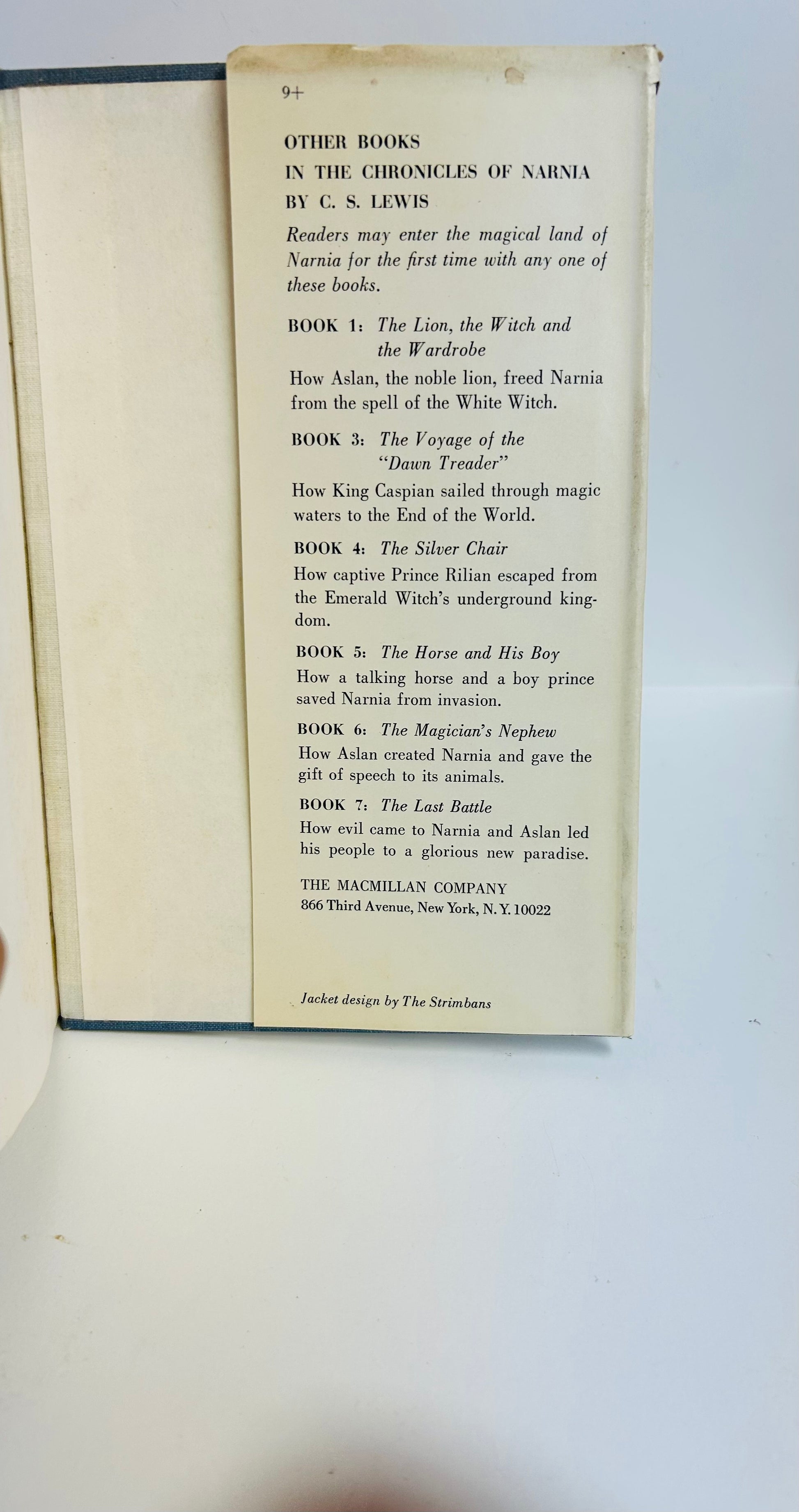 C.S. Lewis. First American edition, later printing. New York: The Macmillan Company, 1951. NAP. Both unclipped dust jacket and hardcover are in Very Good condition. Original price $4.95 on inside flap. Dust jacket designed by The Strimbans. Illustrations by Pauline Baynes. Jacket has some foxing and chipping on spine. No writing or markings found in the book, 186 pp.