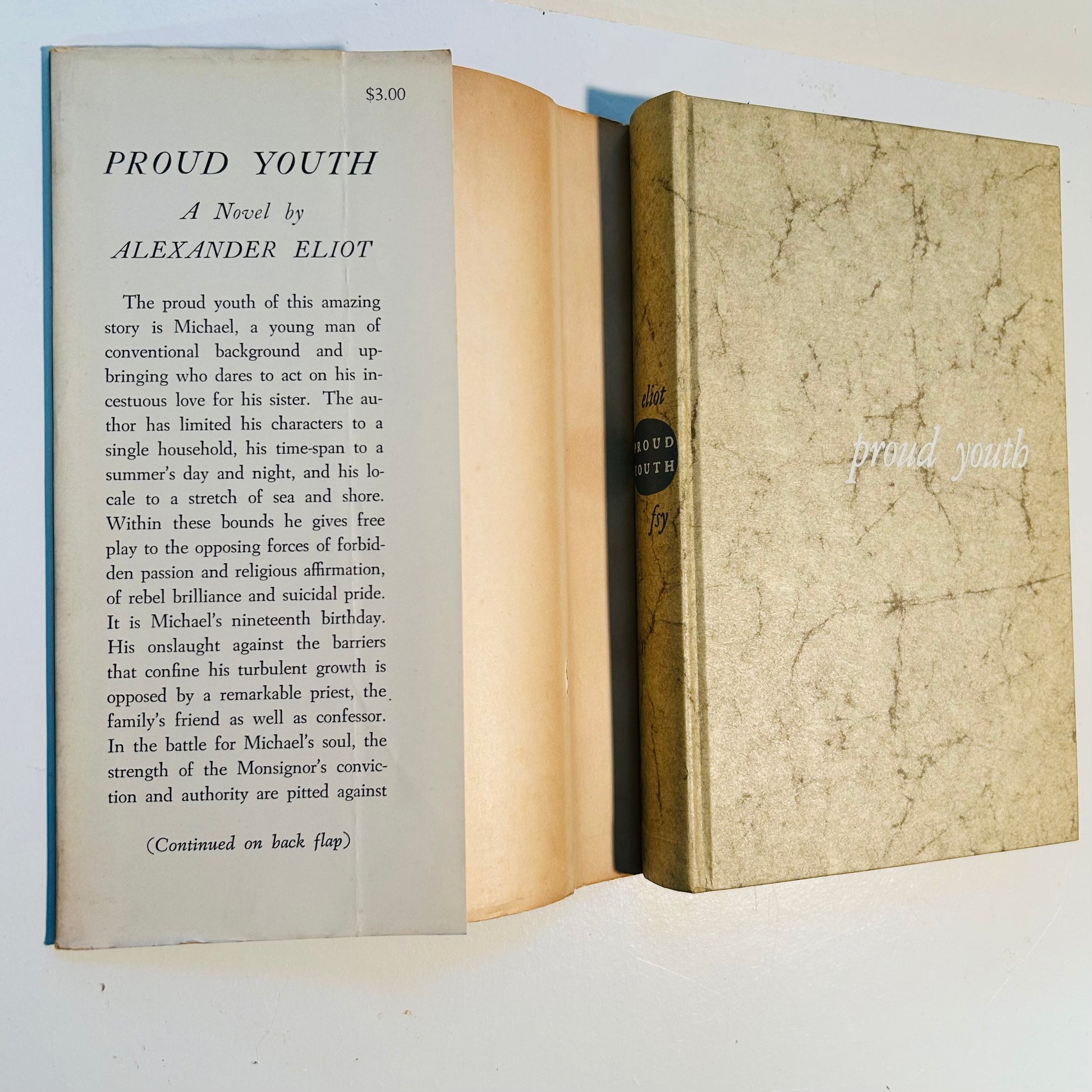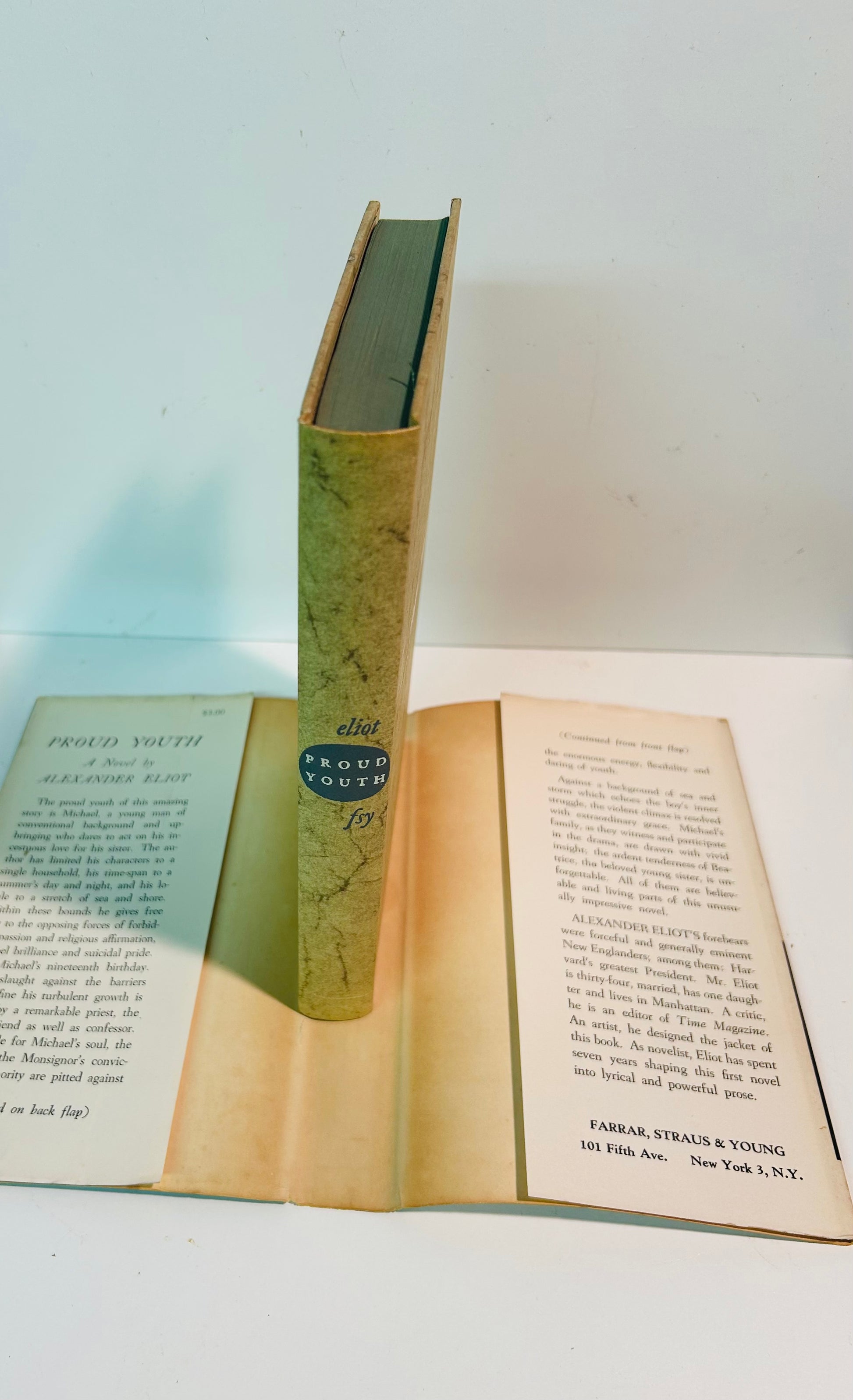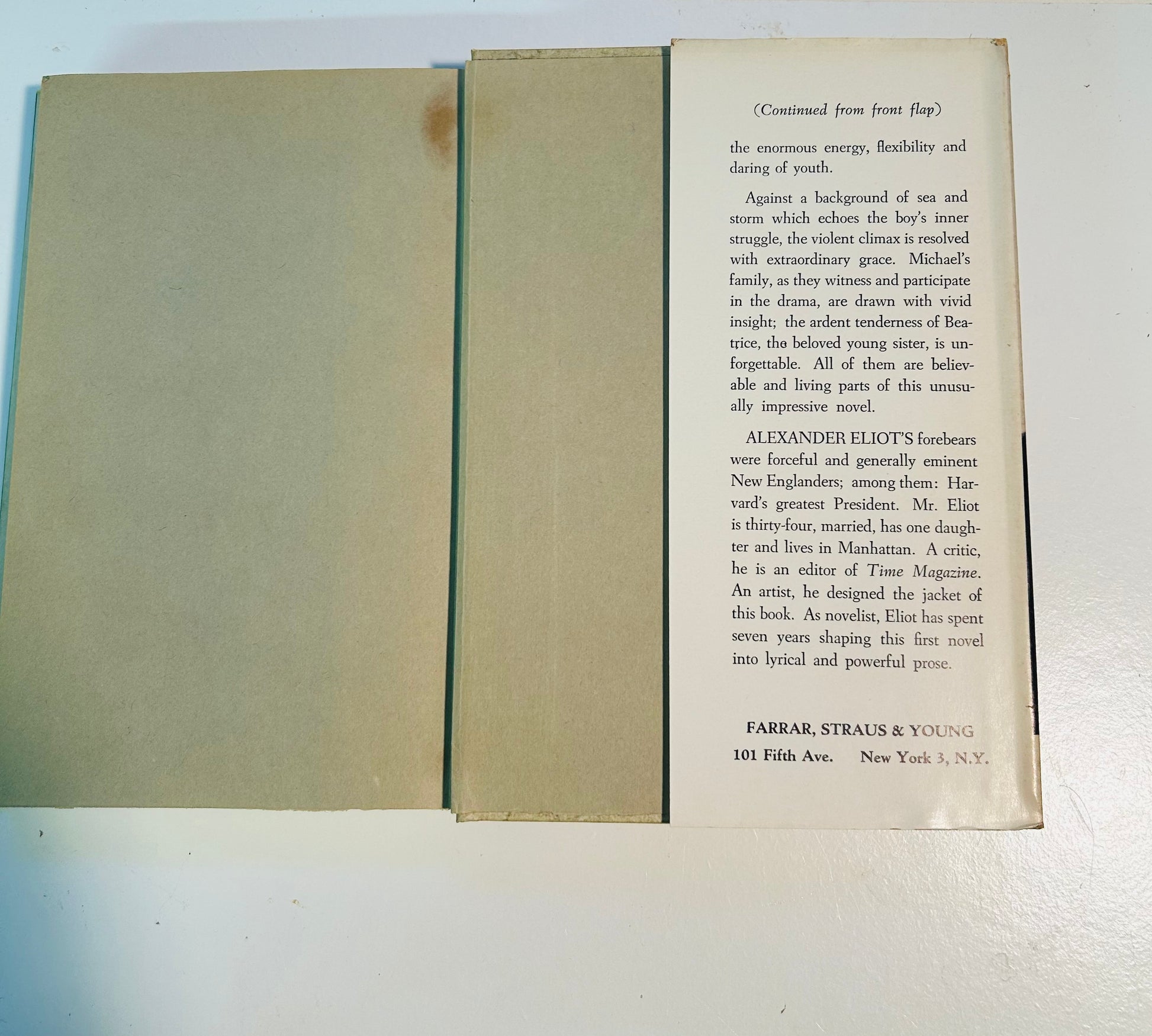 Alexander Eliot. First edition, stated first printing. New York: Farrah, Straus & Young, 1953. Both unclipped dust jacket and hardcover are in Very Good+ condition. Original price $3.00 on inside flap. No writing or markings found in this well-preserved edition, other than former owner signature on flyleaf, 222 pp. Marble coloured boards, top edge green. From the estate of Jack Lockhart, New York.