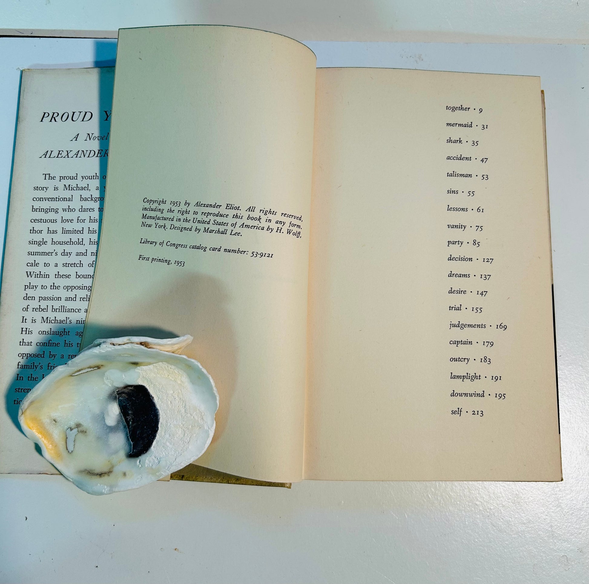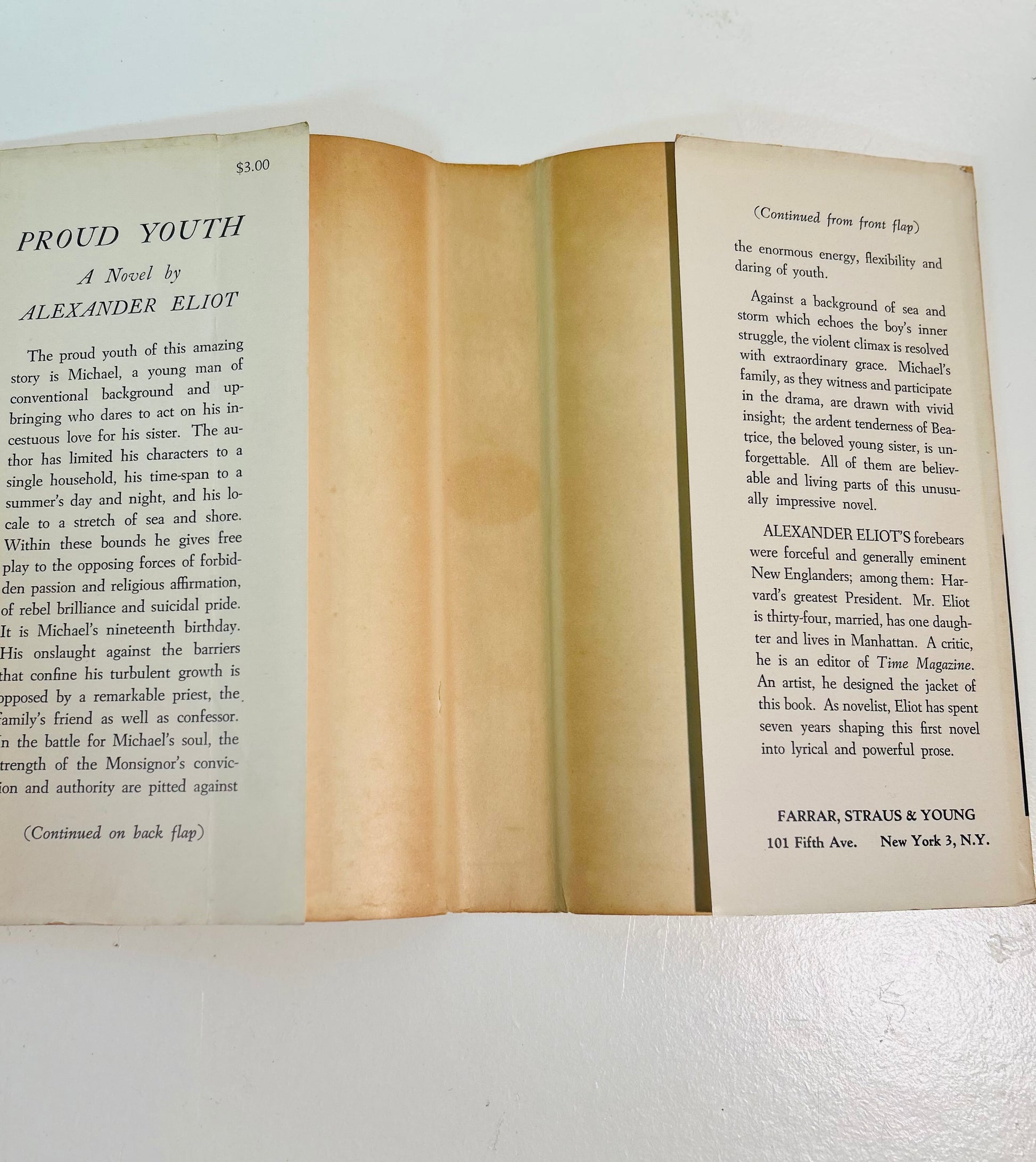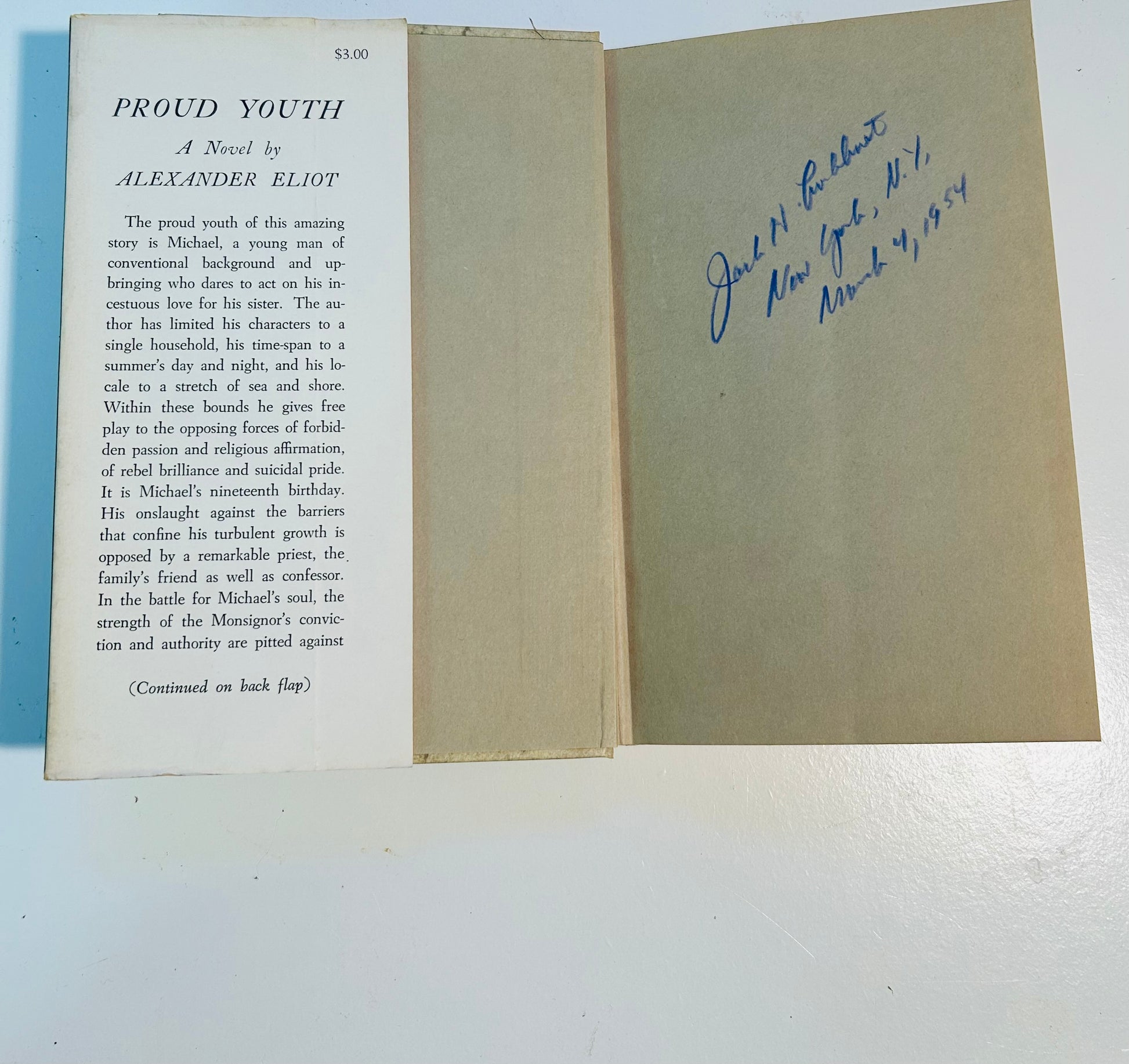 Alexander Eliot. First edition, stated first printing. New York: Farrah, Straus & Young, 1953. Both unclipped dust jacket and hardcover are in Very Good+ condition. Original price $3.00 on inside flap. No writing or markings found in this well-preserved edition, other than former owner signature on flyleaf, 222 pp. Marble coloured boards, top edge green. From the estate of Jack Lockhart, New York.