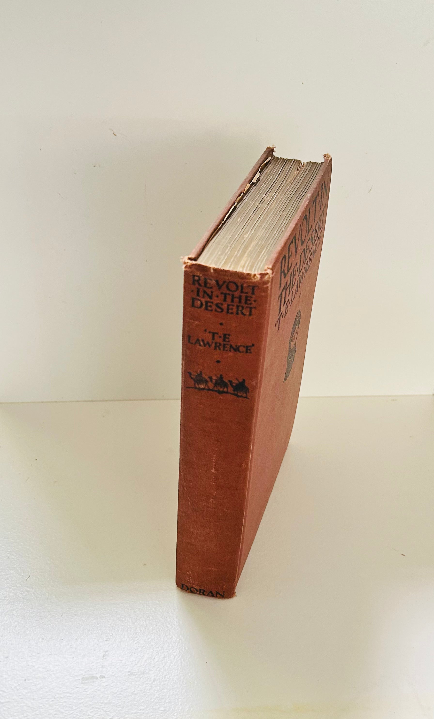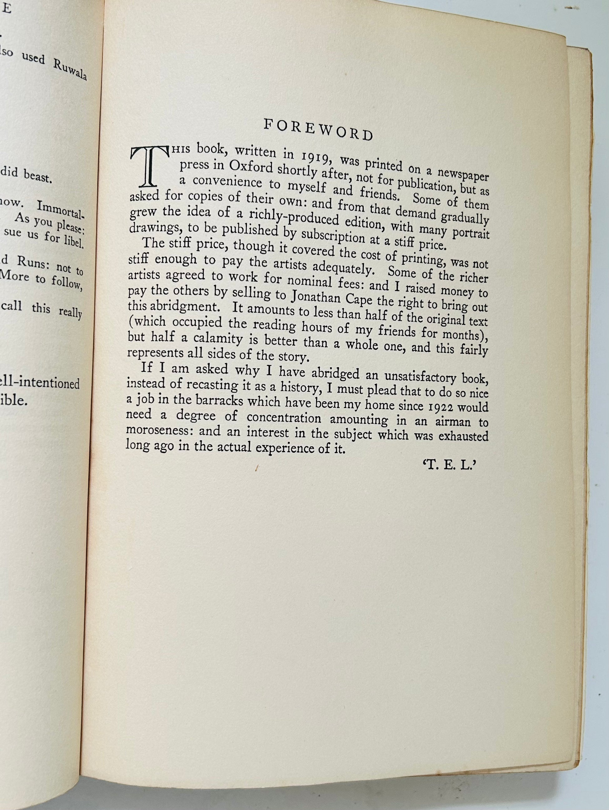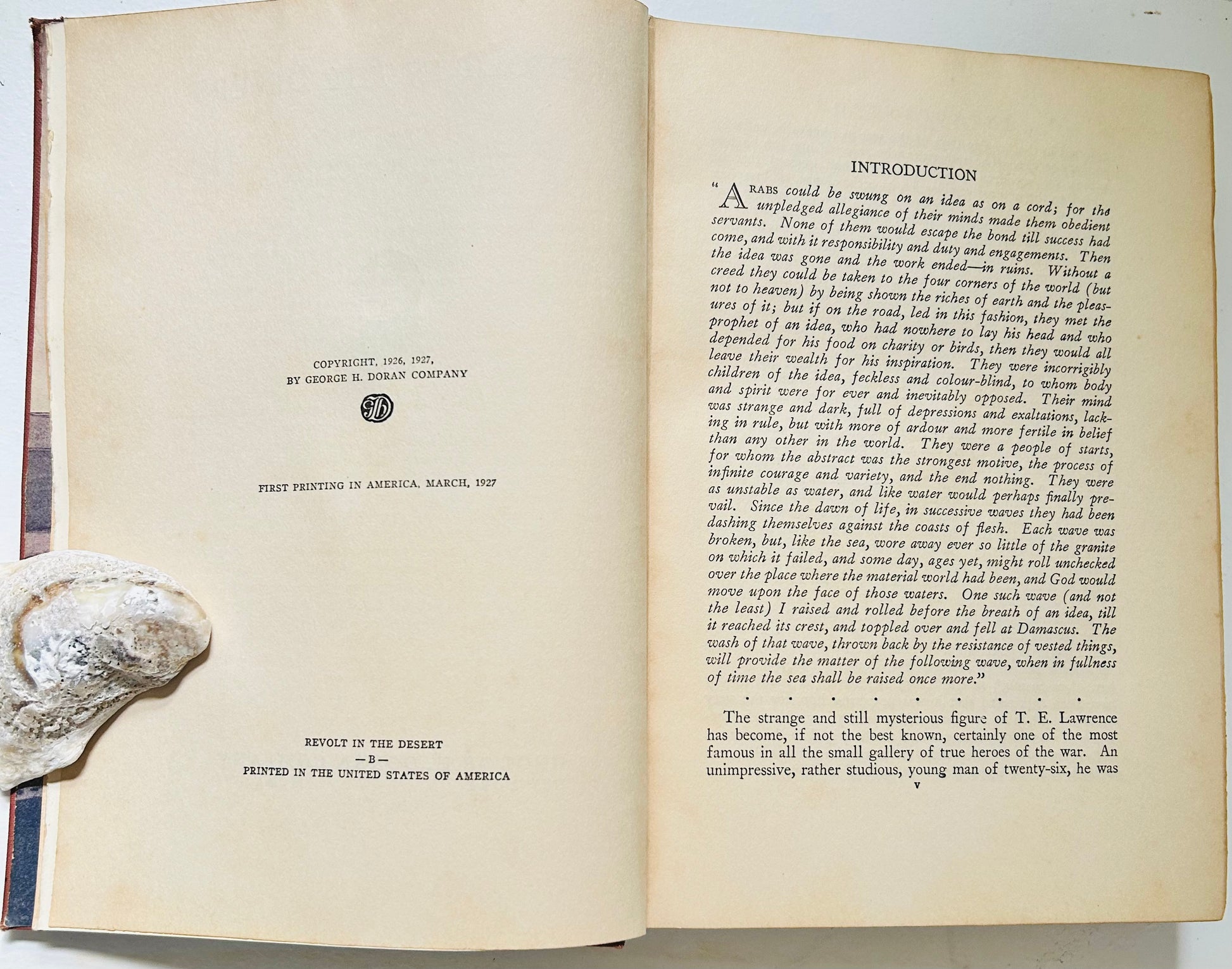T.E. Lawrence. First American edition (stated). New York: George H. Doran Company, 1927. Missing dust jacket. Hardcover in Very Good condition, with brown cloth. Some pages are soiled and have foxing. No loose lages, binding is tight. Maroon brown cloth stamped in black, illustrated endpapers, top edge stained chocolate brown. With folding map (which is fully intact and in great shape) tipped-in before rear endpaper, Introduction and prefatory Foreword by TEL, and portrait illustrations in text (including frontispiece of Lawrence). No writing or markings in the book, 335 pp. Stated first American printing, March, 1927.