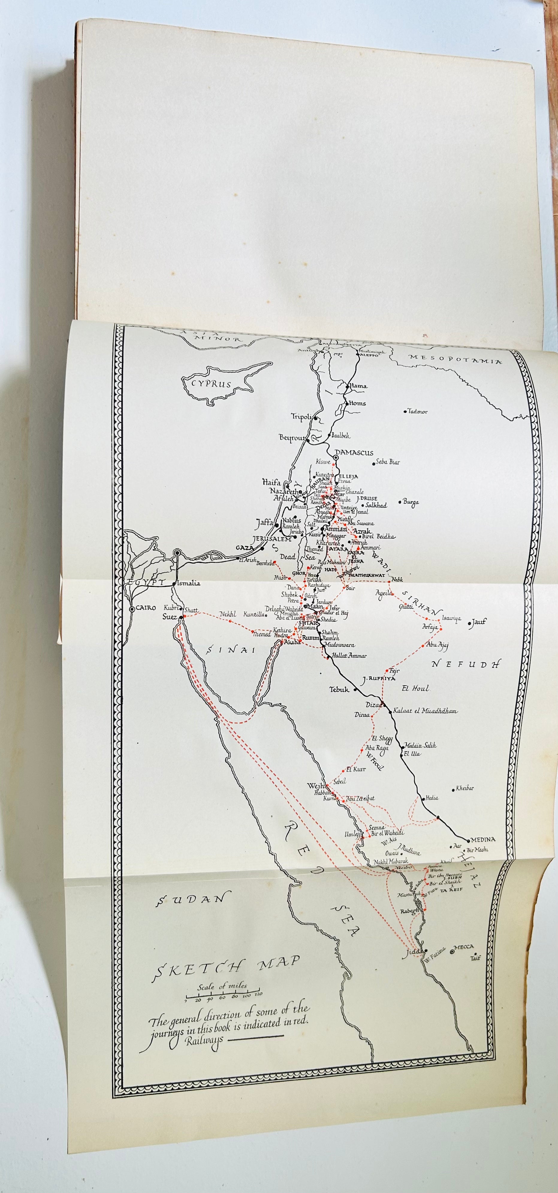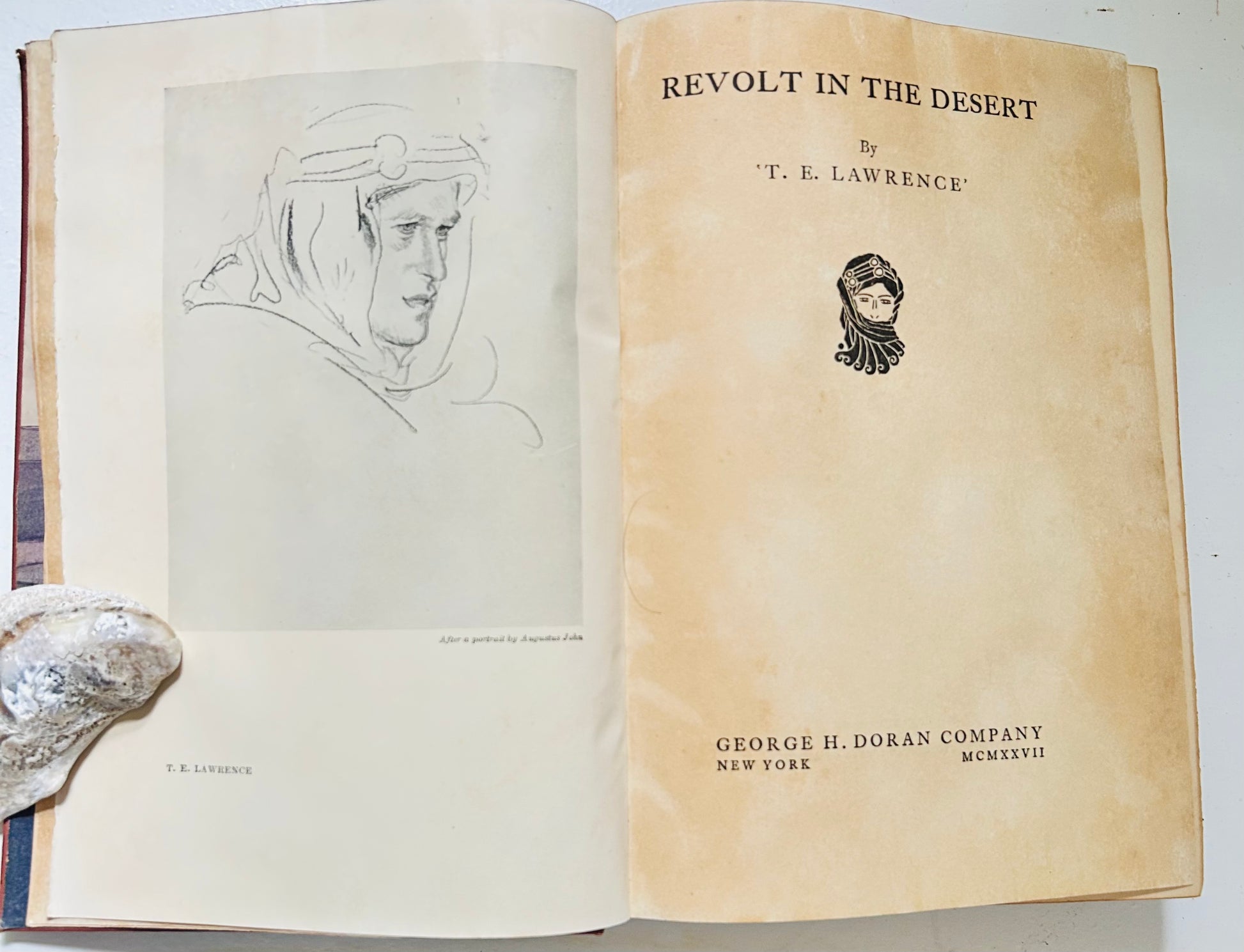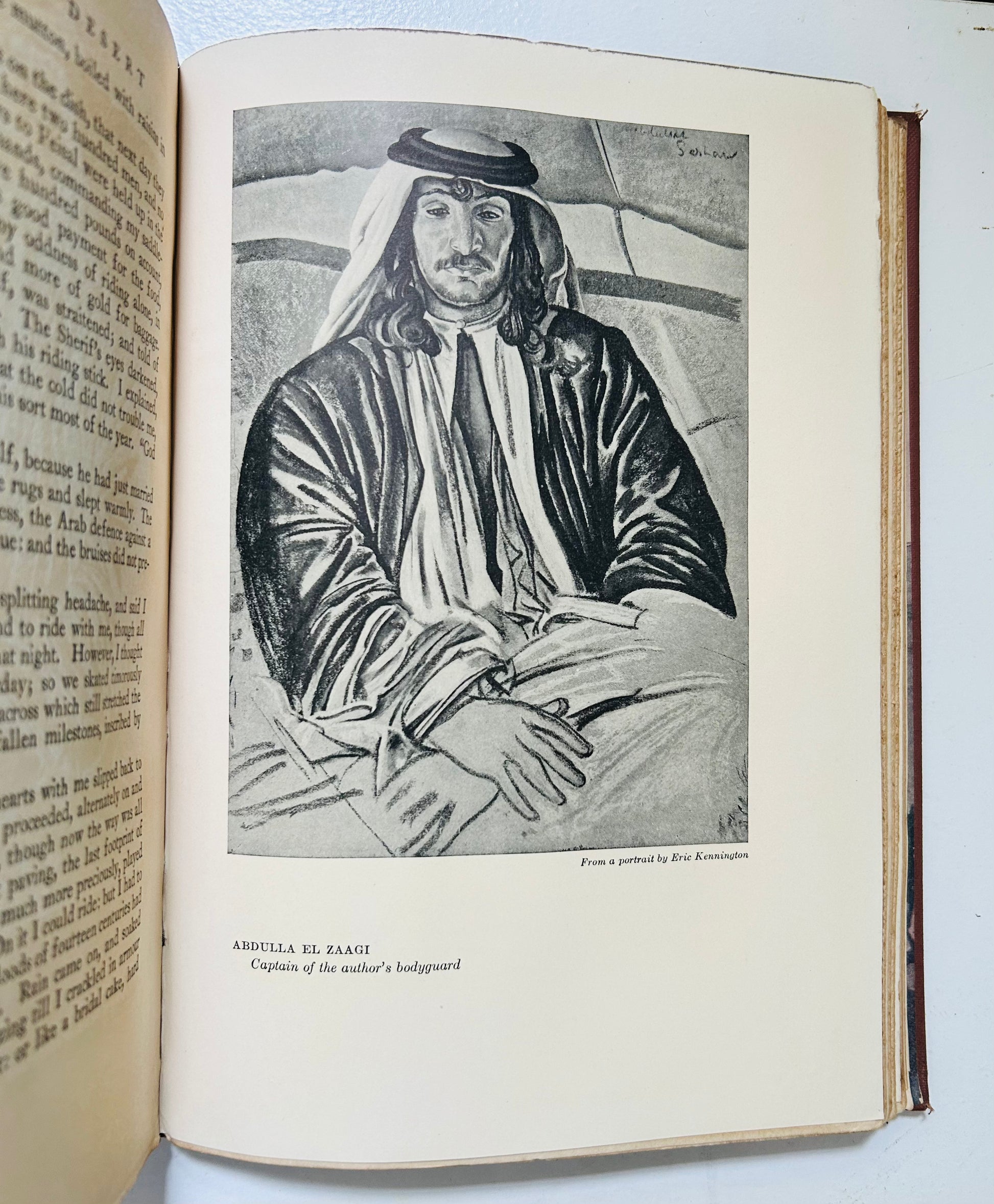 T.E. Lawrence. First American edition (stated). New York: George H. Doran Company, 1927. Missing dust jacket. Hardcover in Very Good condition, with brown cloth. Some pages are soiled and have foxing. No loose lages, binding is tight. Maroon brown cloth stamped in black, illustrated endpapers, top edge stained chocolate brown. With folding map (which is fully intact and in great shape) tipped-in before rear endpaper, Introduction and prefatory Foreword by TEL, and portrait illustrations in text (including frontispiece of Lawrence). No writing or markings in the book, 335 pp. Stated first American printing, March, 1927.