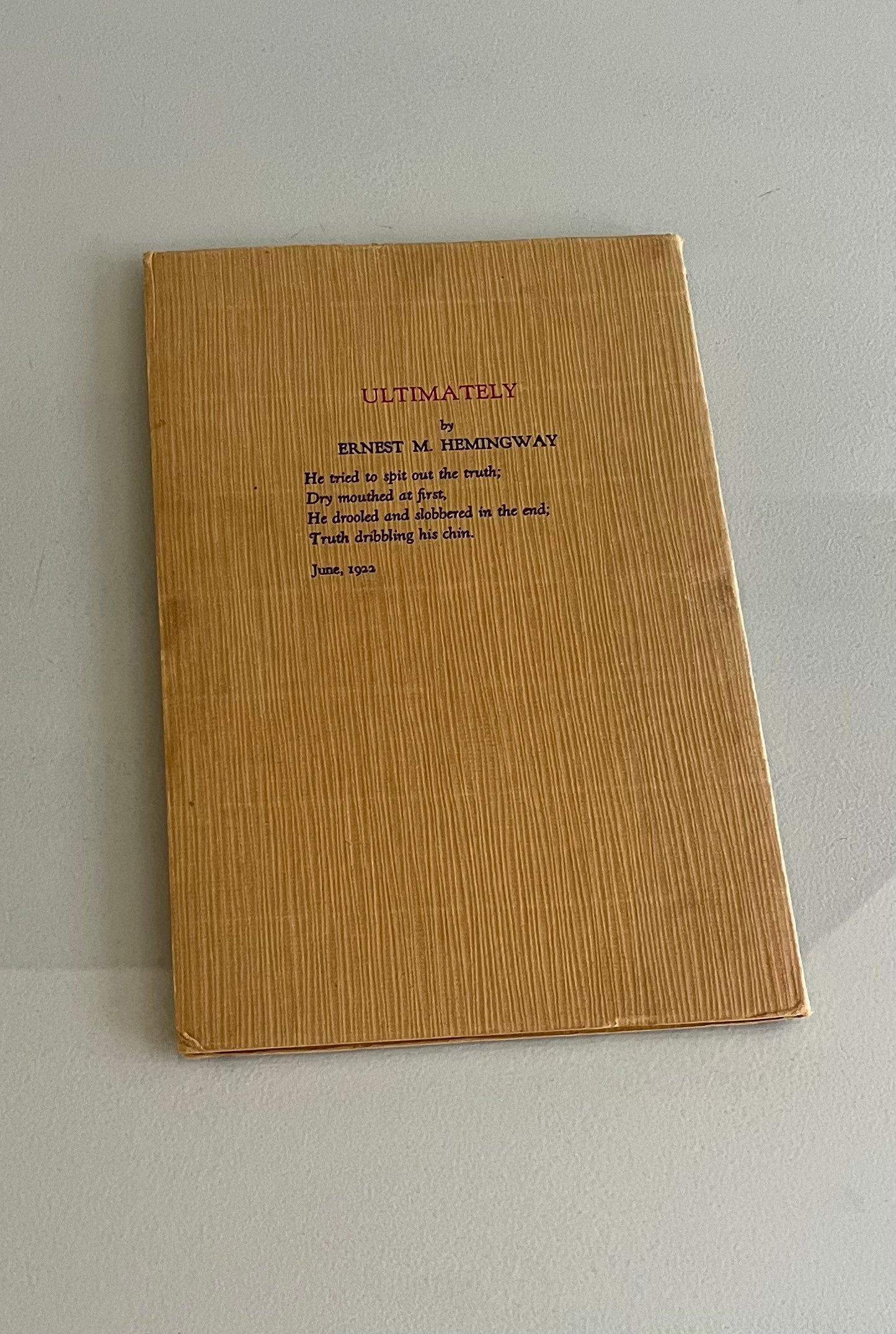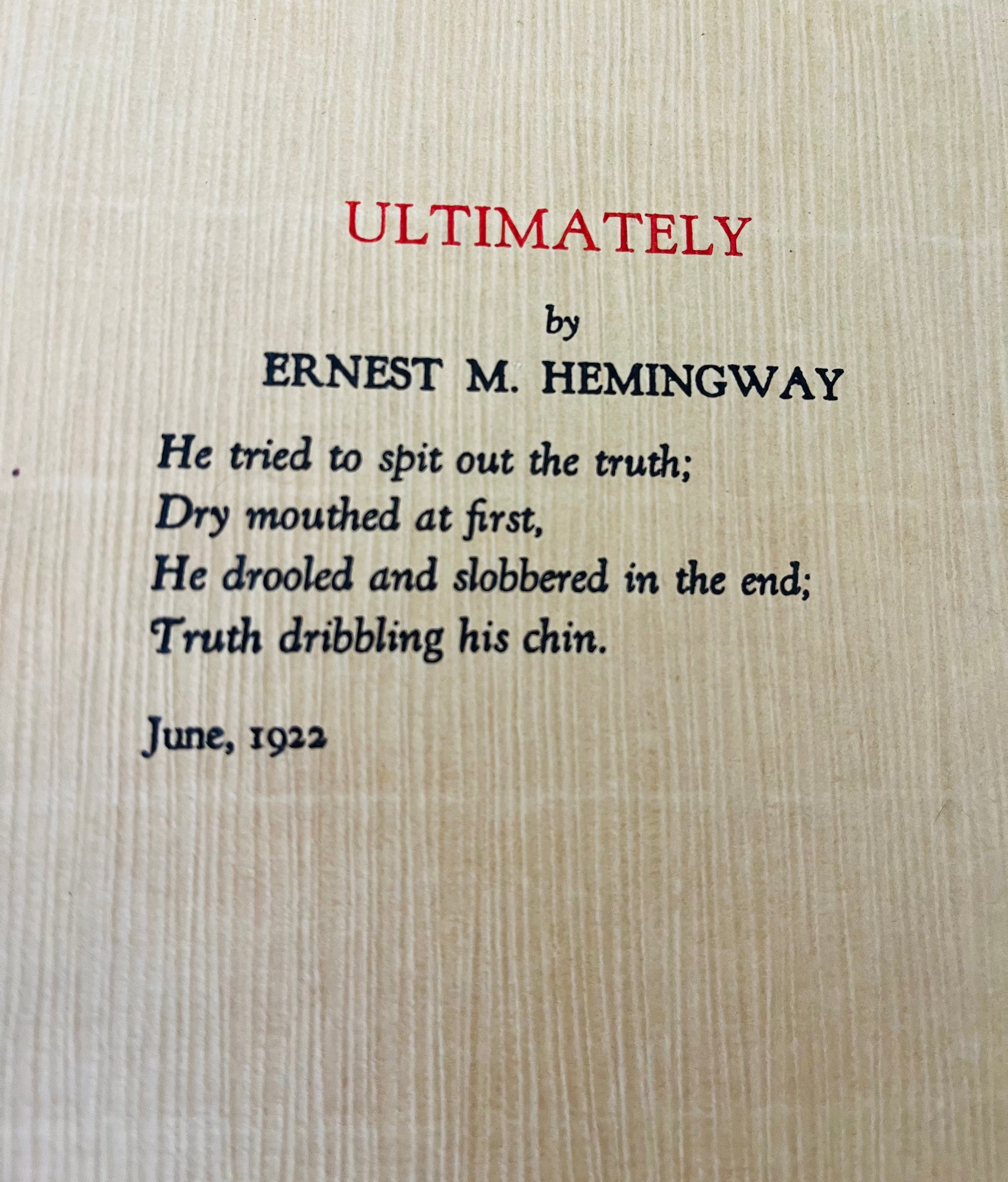 The poem, "Ultimately" is a four line poem by a young Hemingway, found on the rear cover, dated June 1922. This would make Hemingway about 23 soon-to-be turning 24 years old.