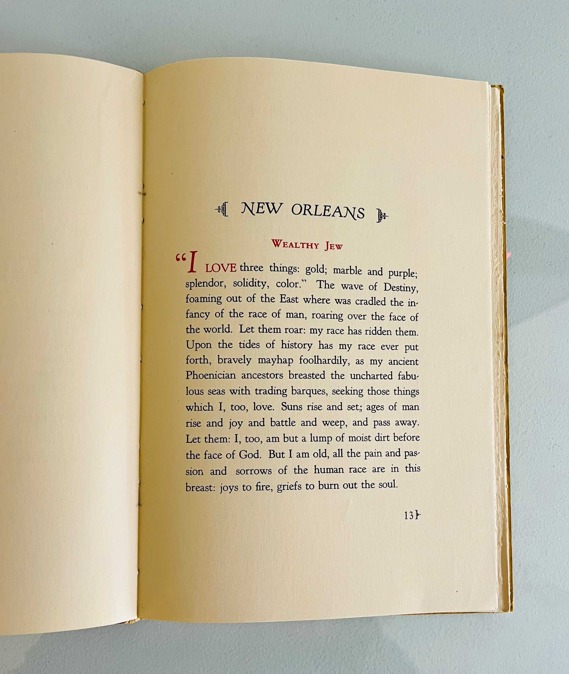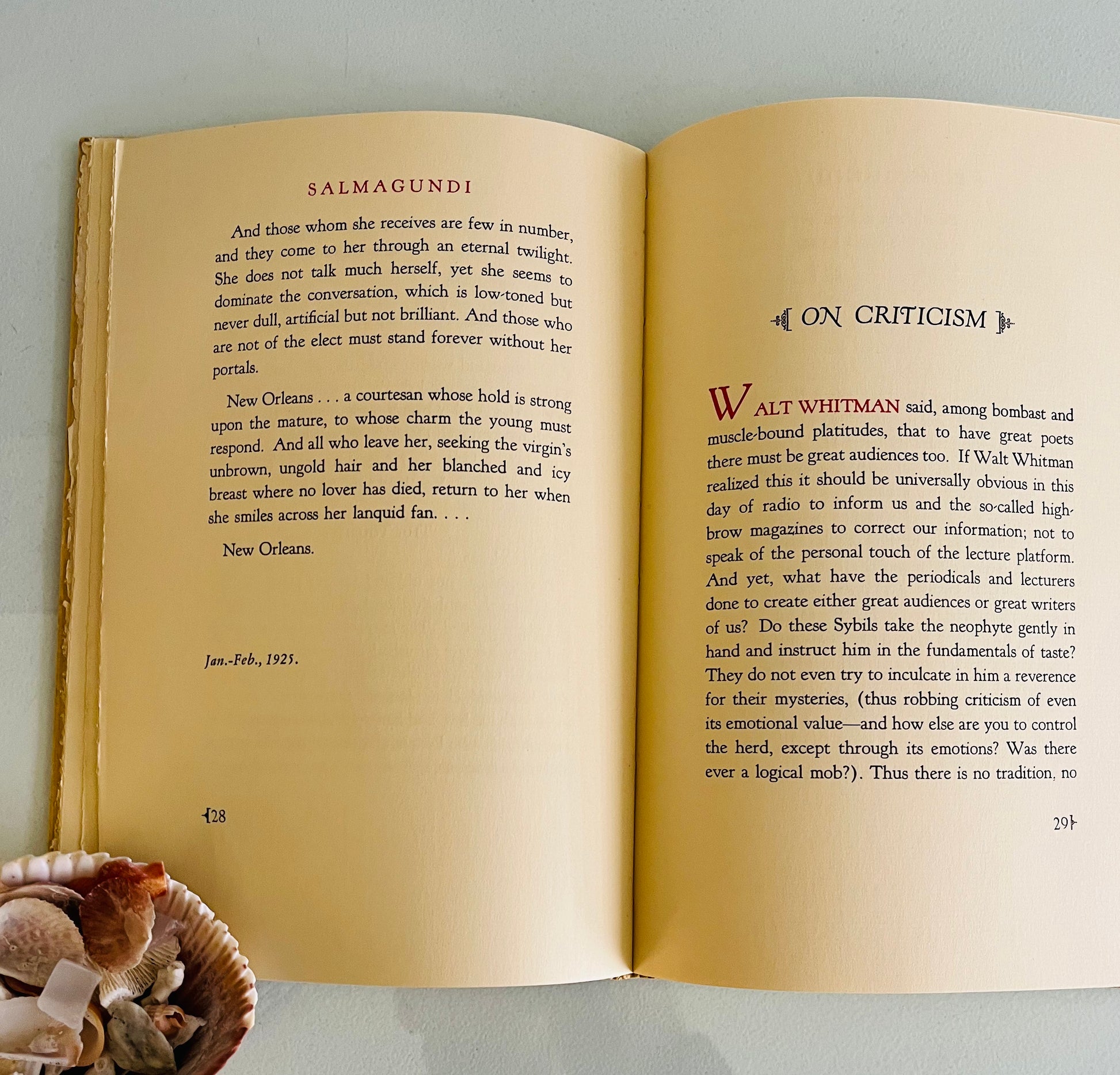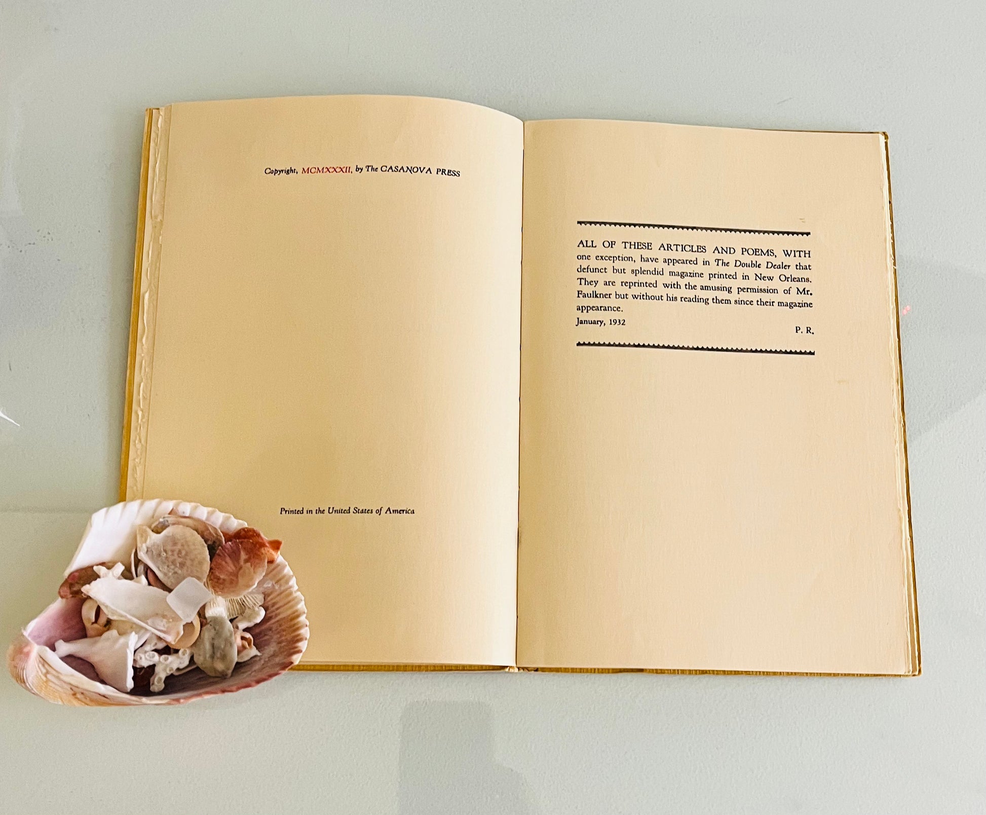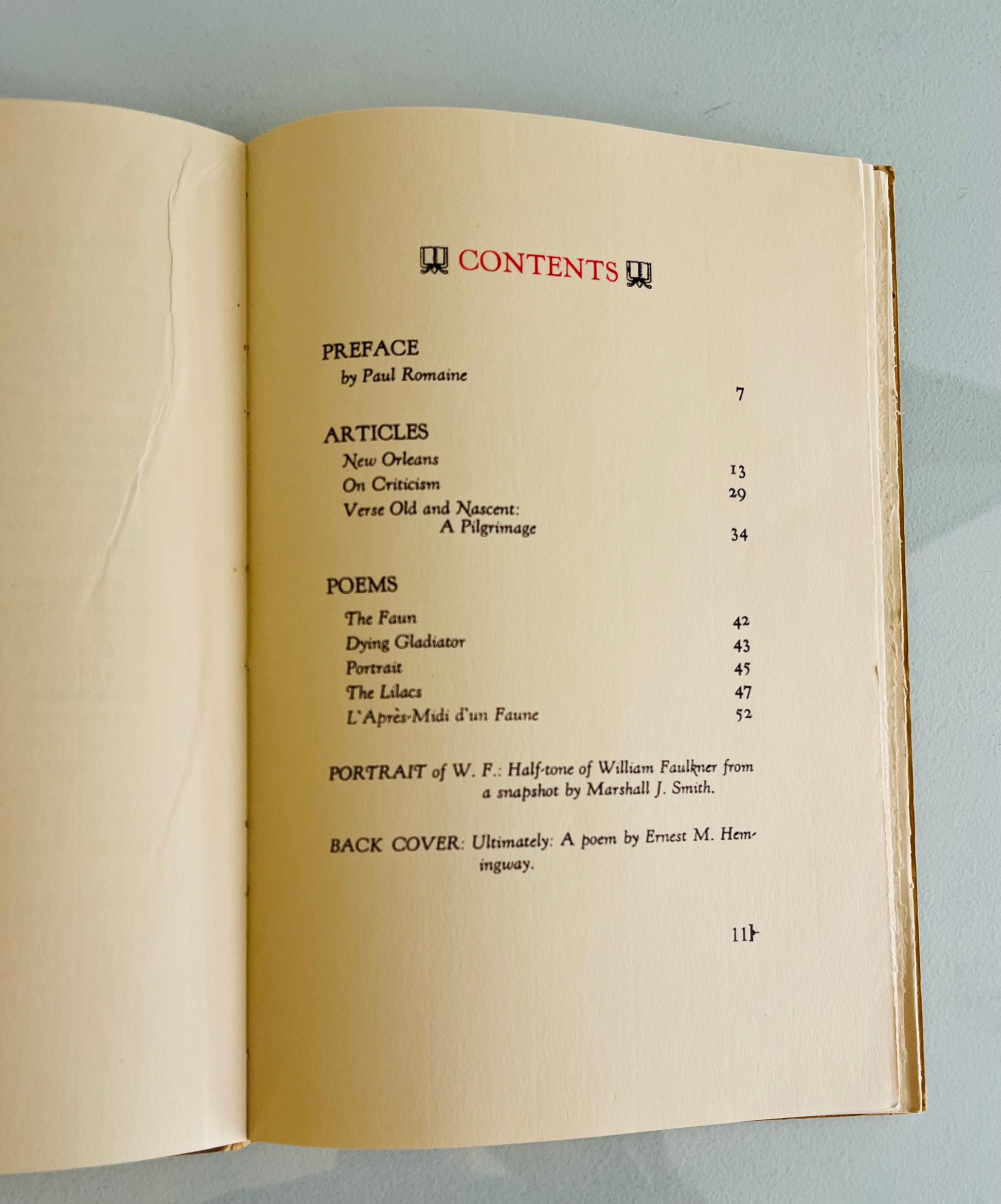 The articles and poems in Salmagundi first appeared in the New Orleans’ magazine, The Double Dealer, and were reprinted with Faulkner’s permission. The inclusion of Hemingway’s poem on the rear wrapper was done as “just a whim,” but “a whim inspired by one of the oddest coincidences in modern literature: William Faulkner’s poem Portrait and Ernest Hemingway’s poem, Ultimately, both appear on page 337 of the June 1922 issue of The Double Dealer."