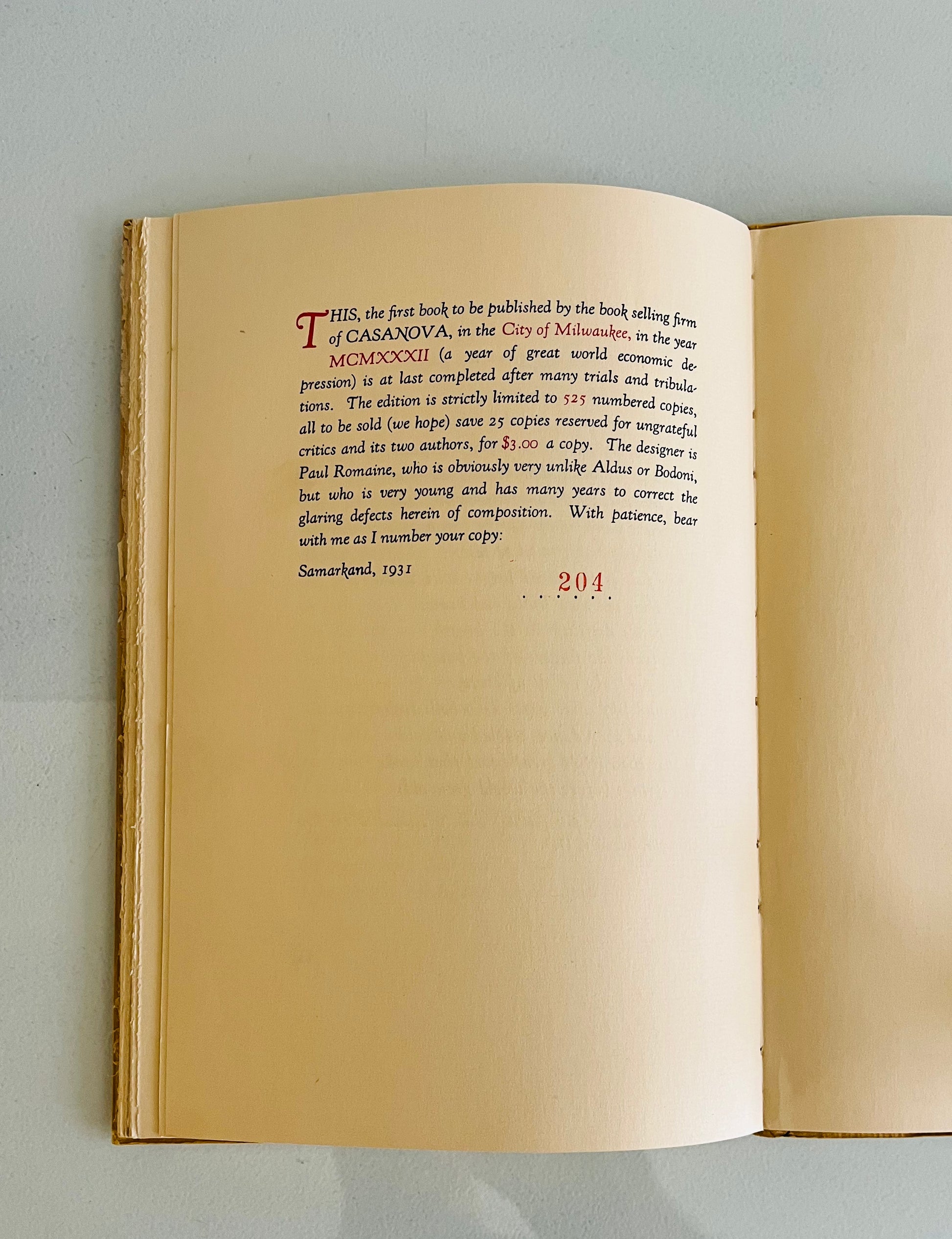 William Faulkner. First edition. Limited to 525 copies this being No. 204. Dust Jacket: None issued. Softcover: Near Fine. Milwaukee: The Casanova Press, 1932. Does not have a slipcase. No writing, marks or bookplates in this beautiful edition, 53 pp. This is the first book of this press. Designed by Paul Romaine.