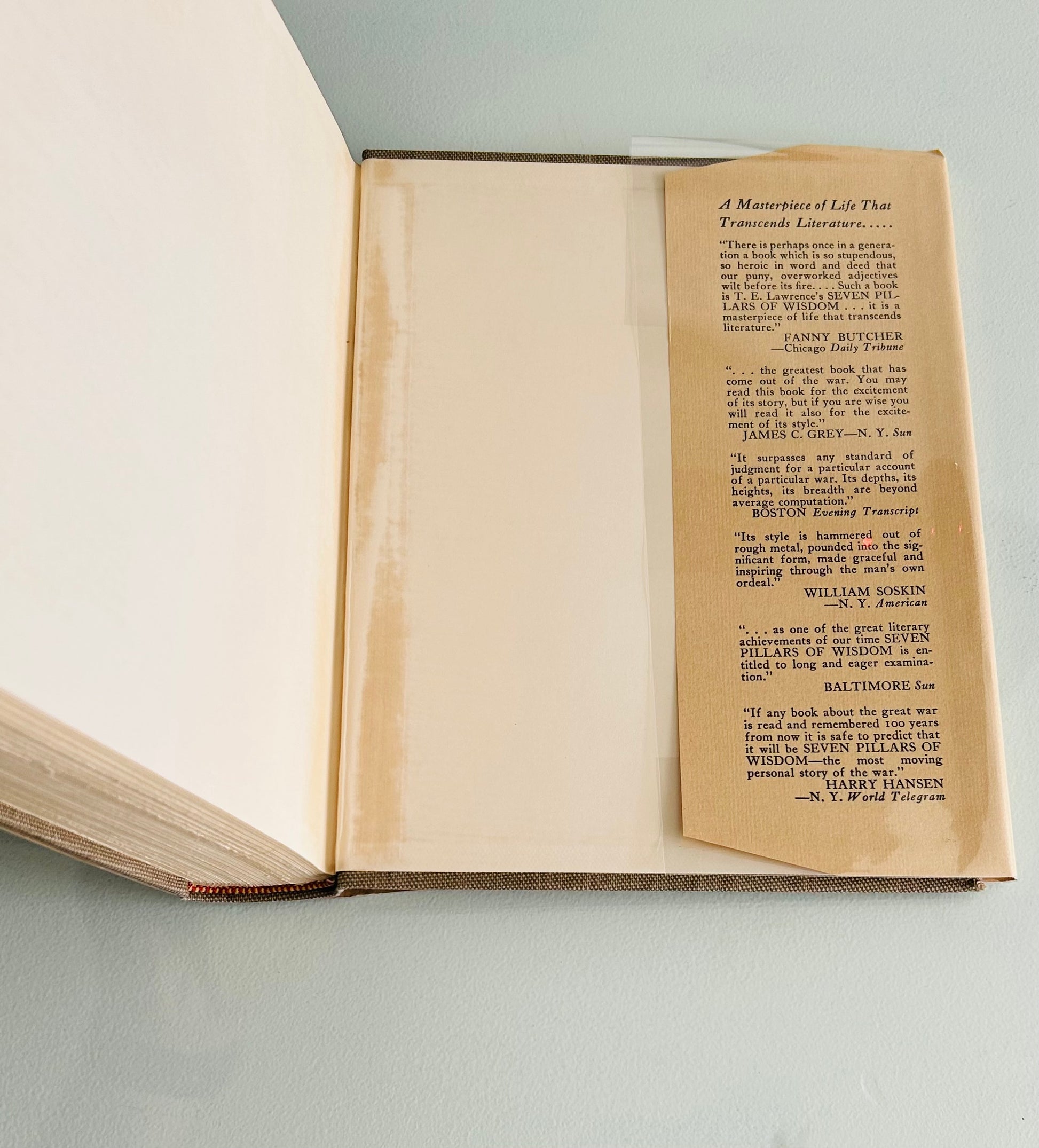 TE Lawrence. First American trade edition. New York: Doubleday, Doran and Company, 1935. In a price-clipped dust jacket (in mylar wrapper) in Very Good condition. There is a small hole on the spine of the jacket. Hardcover is in Very Good+ condition. No writing or markings found in this well-preserved copy, 672 pp.