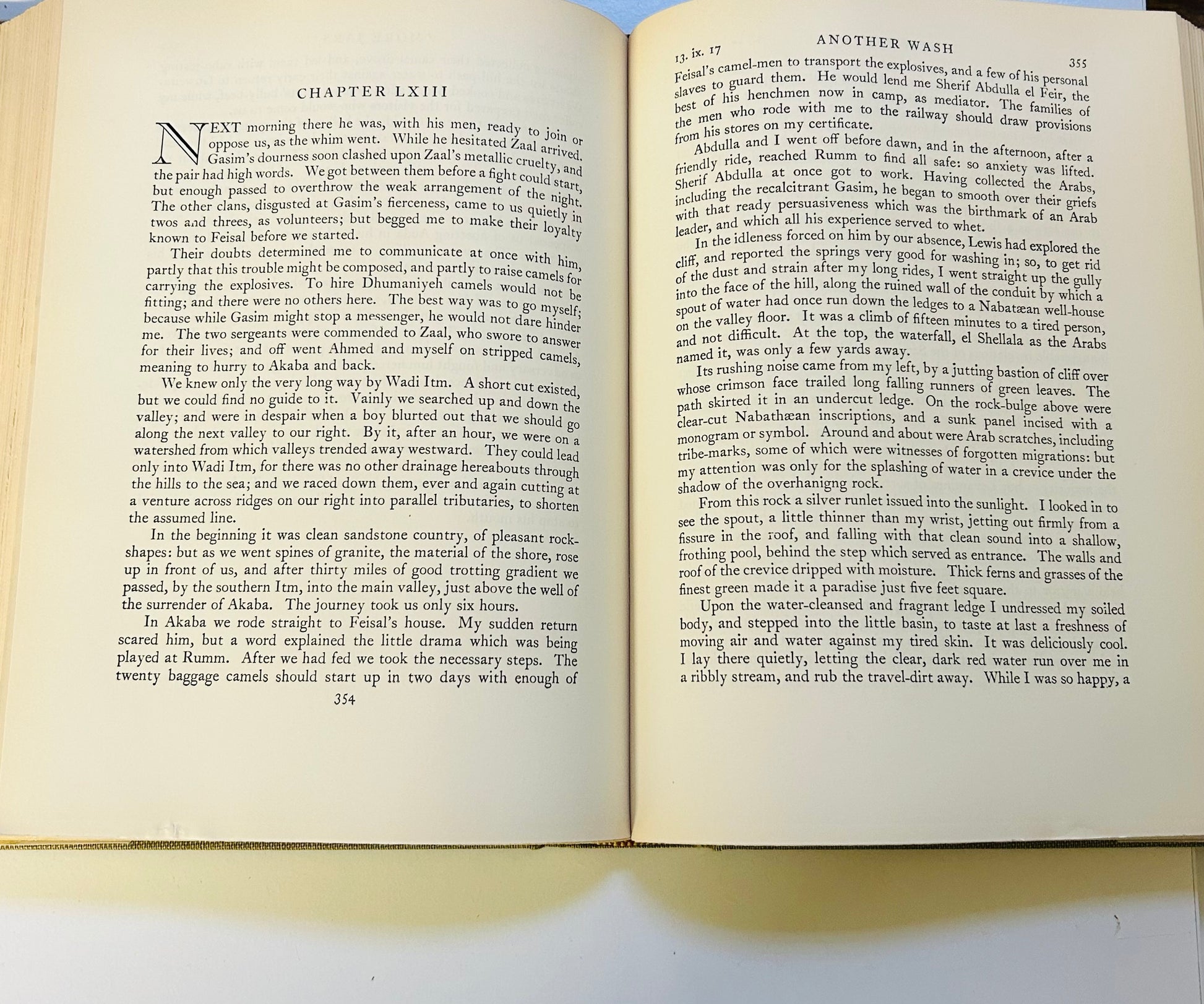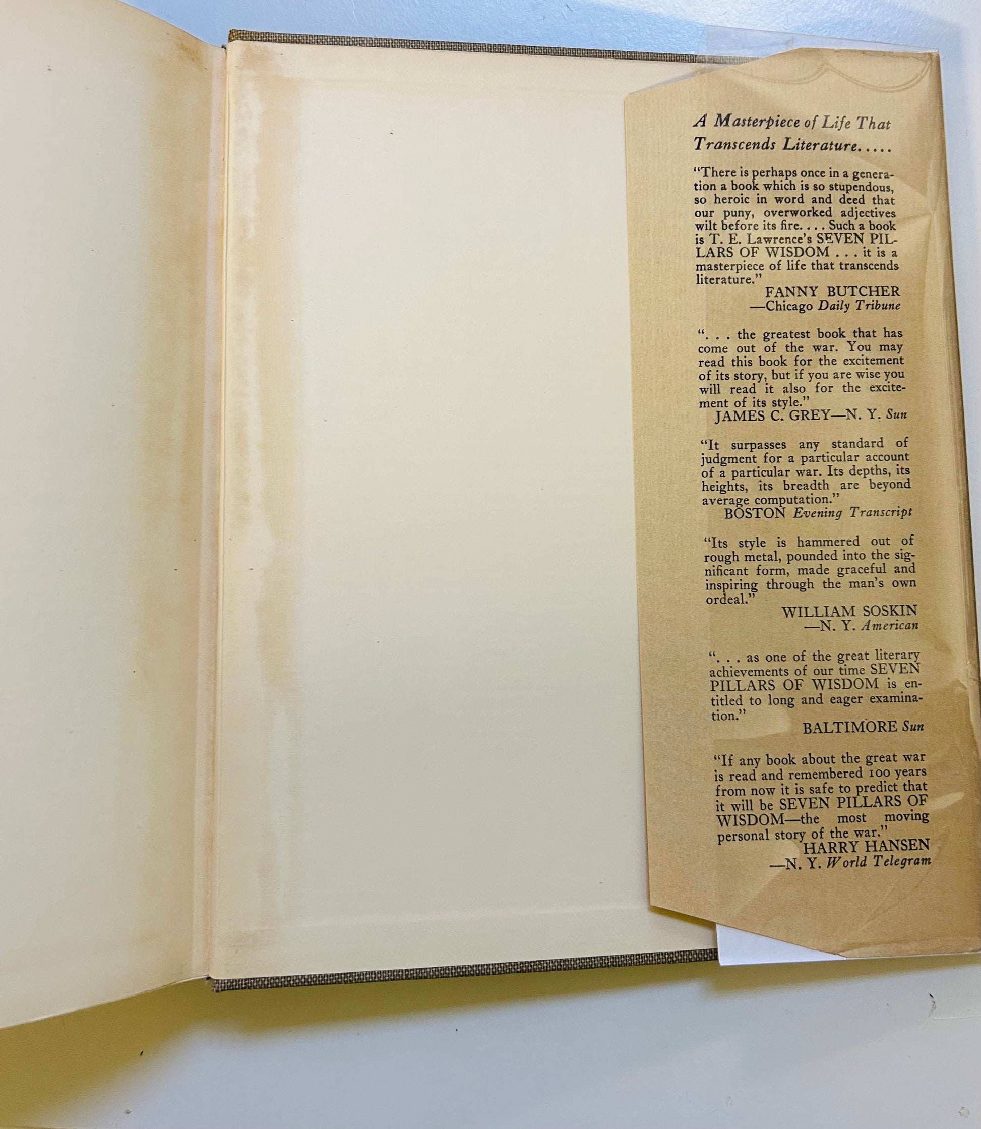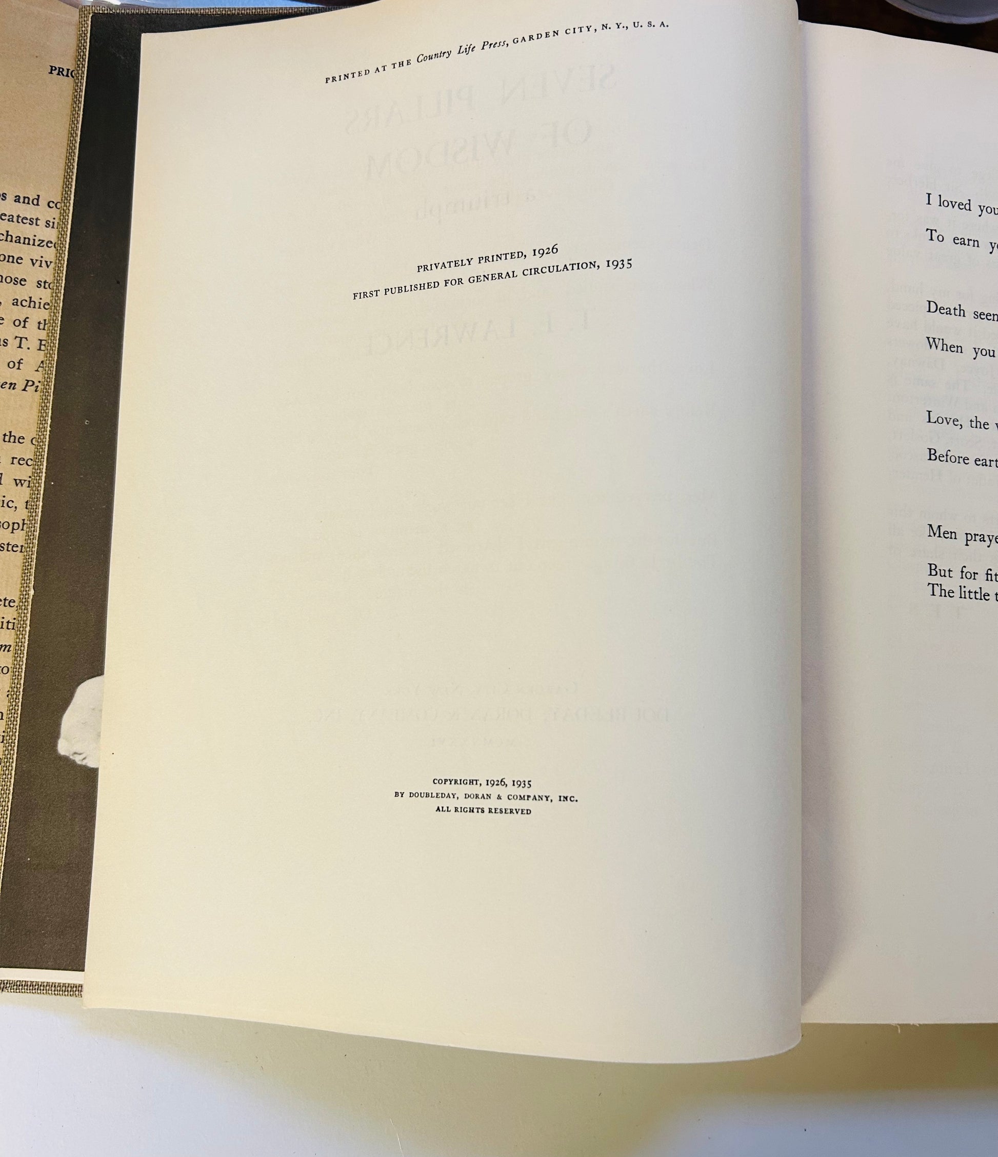 - 1935/1936 – First Trade Edition: After Lawrence’s death (1935), Seven Pillars of Wisdom was first issued for the general public by Jonathan Cape (UK, 1935) and Doubleday, Doran (US, 1935 & 1936).