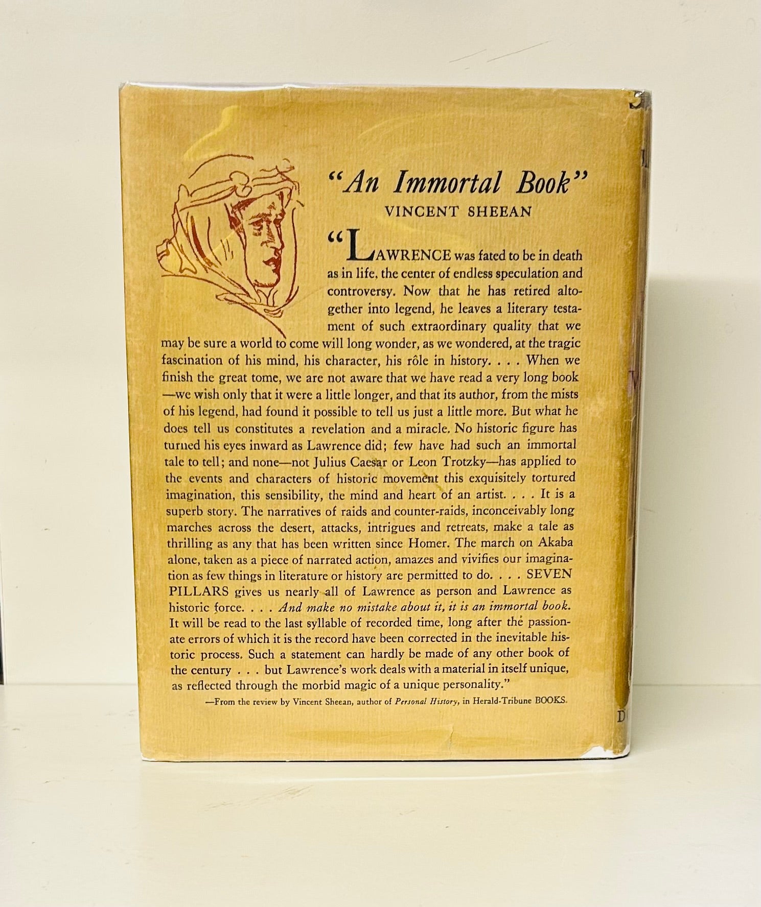TE Lawrence. First American Trade Edition, first printing. New York: Doubleday, Doran and Company, 1935. Unclipped dust jacket (in a Mylar wrapper) and hardcover are both in Very Good+ condition. Still has the original price $5.00 on inside flap. Jacket has a small piece missing on top/bottom of spine. No writing or markings found in this well-preserved copy, 672 pp. Considered a rare copy in this condition. This is the true first American edition published in 1935 not the second printing in 1936.