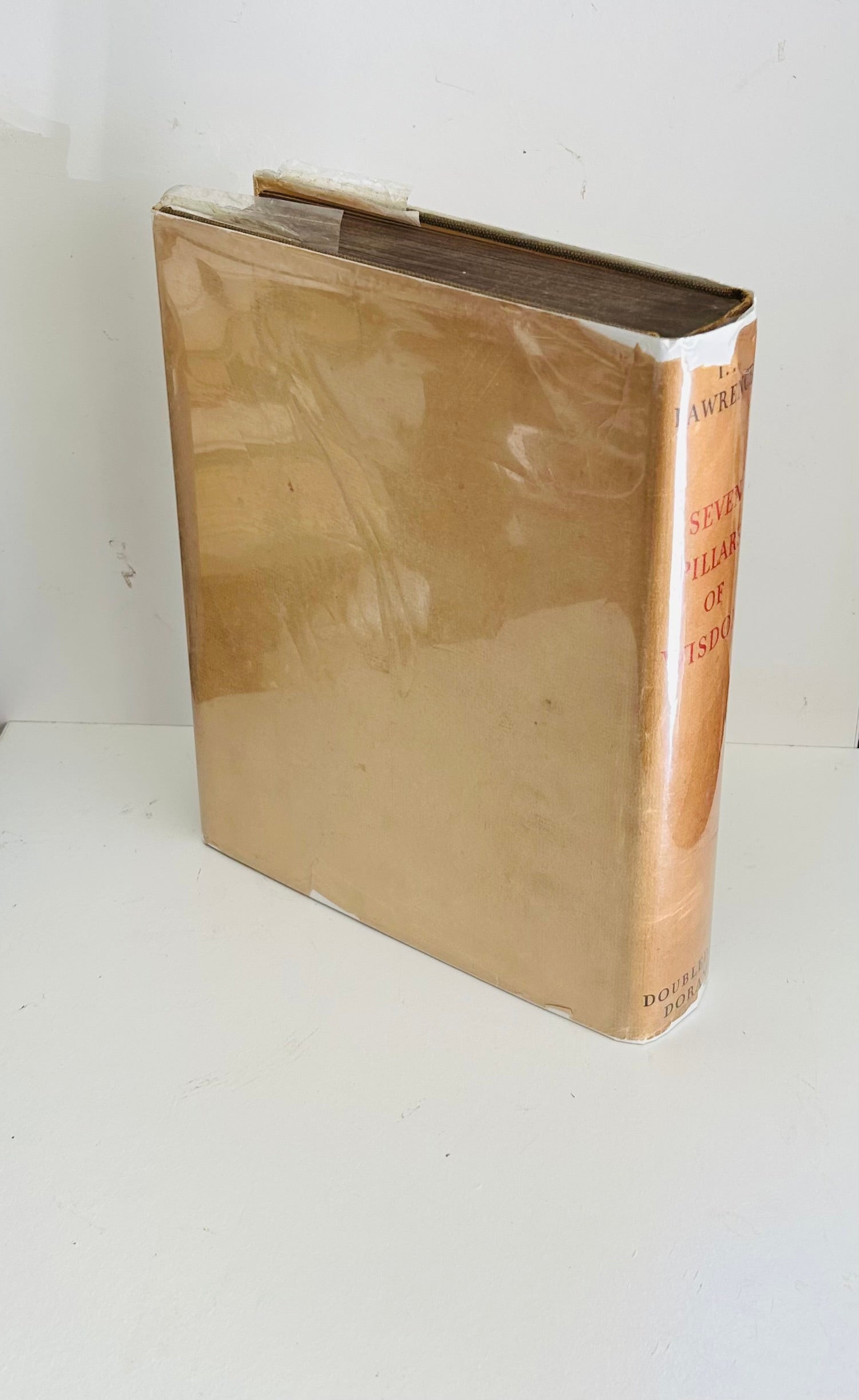TE Lawrence. First American Trade Edition, first printing. New York: Doubleday, Doran and Company, 1935. Unclipped dust jacket (in a Mylar wrapper) and hardcover are both in Very Good+ condition. Still has the original price $5.00 on inside flap. Jacket has a small piece missing on top of spine and front side. Former owner sticker on front flyleaf, otherwise, no writing or markings found in this well-preserved copy, 672 pp. Considered a rare copy in this condition. This is the true first American edition published in 1935 not the second printing in 1936.