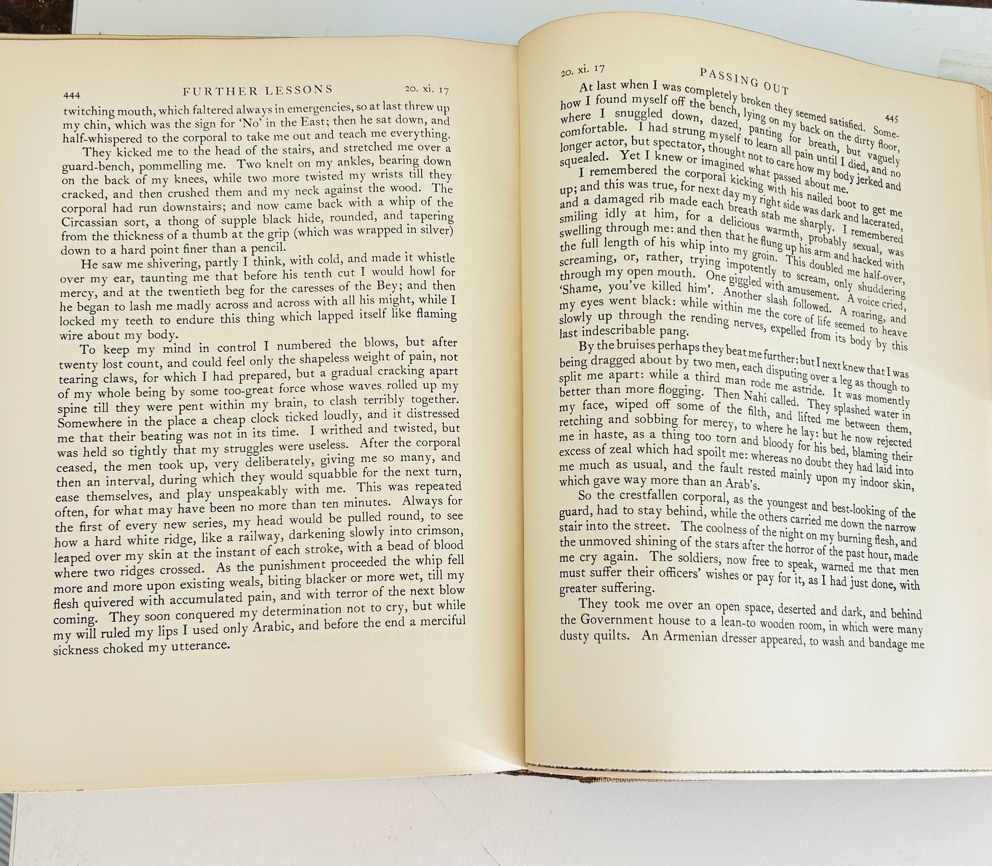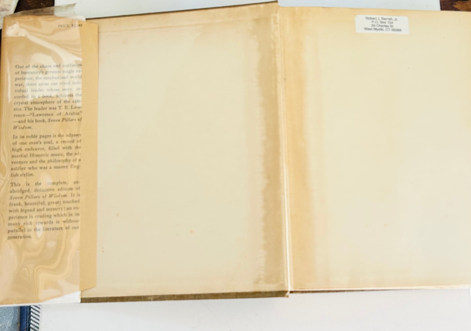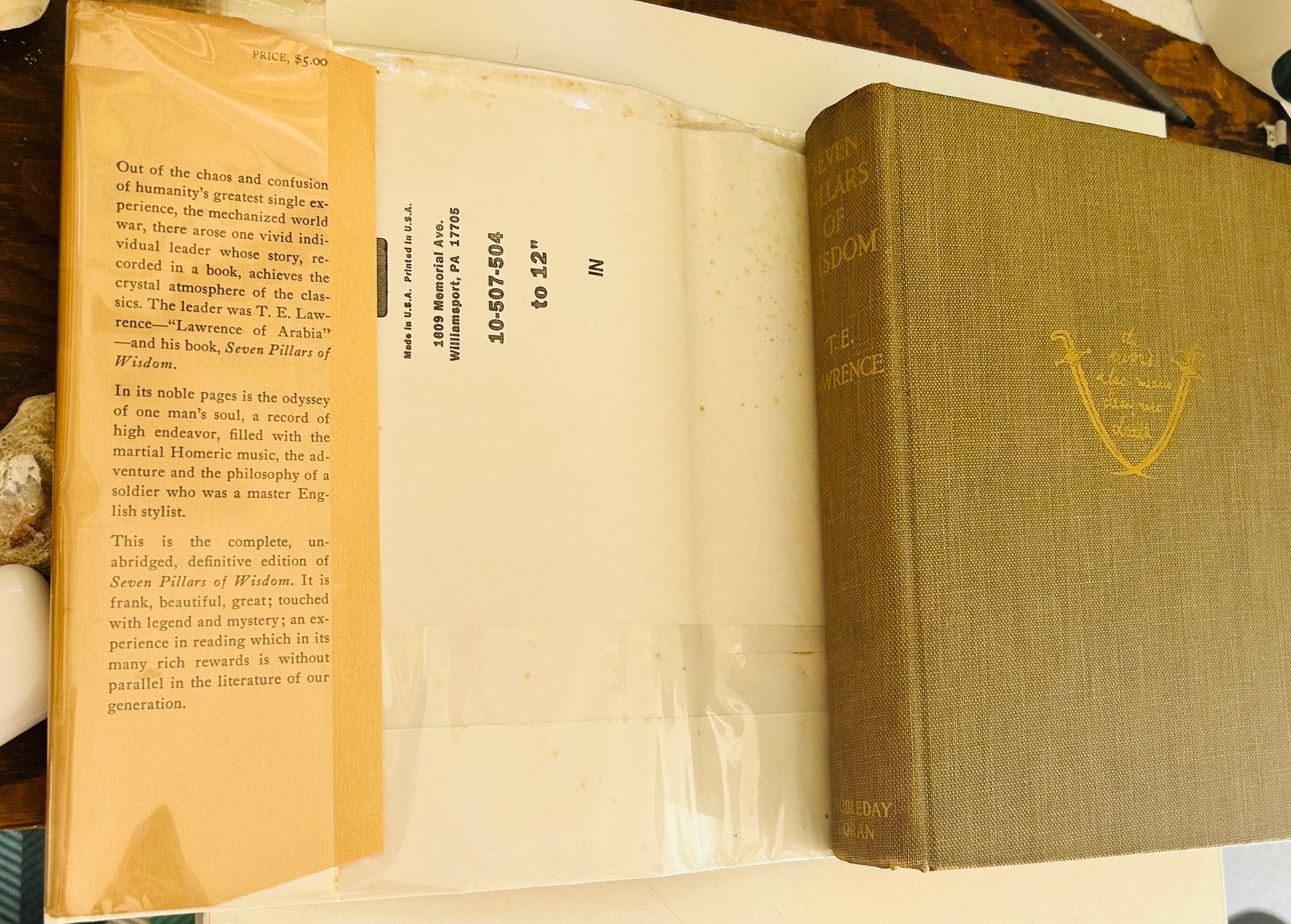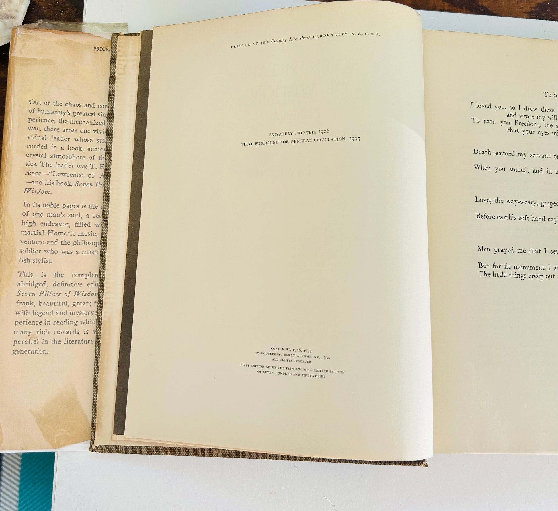 - 1935/1936 – First Trade Edition: After Lawrence’s death (1935), Seven Pillars of Wisdom was first issued for the general public by Jonathan Cape (UK, 1935) and Doubleday, Doran (US, 1935 & 1936).