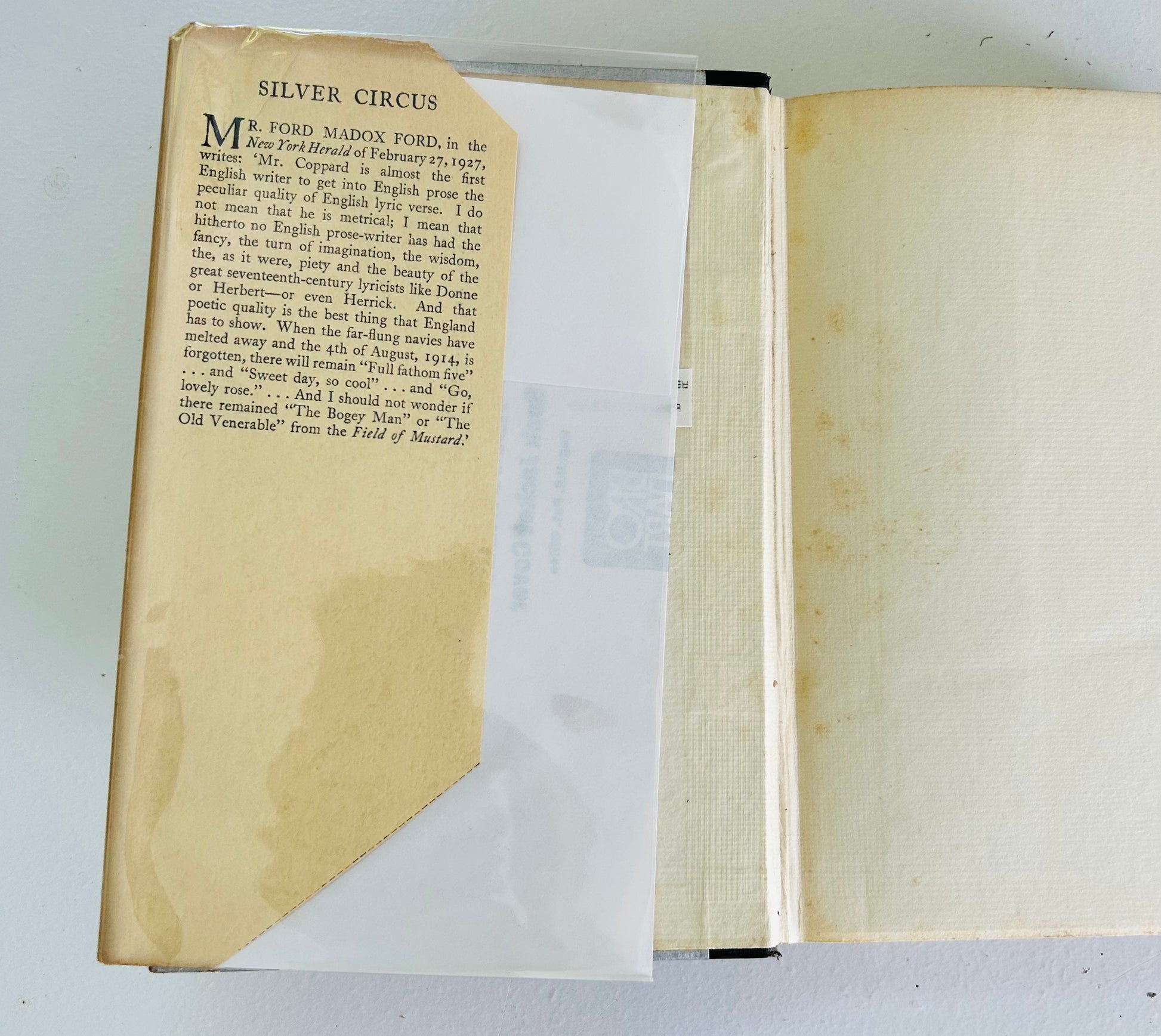 A.E. Coppard. First edition. London: Jonathan Cape, 1928. Dust jacket, is price clipped and in a mylar protective wrapper. Both jacket and hardcover are in Very Good+ condition. No writing or markings in the book, 289 pp. Spine does have foxing and some chipping.