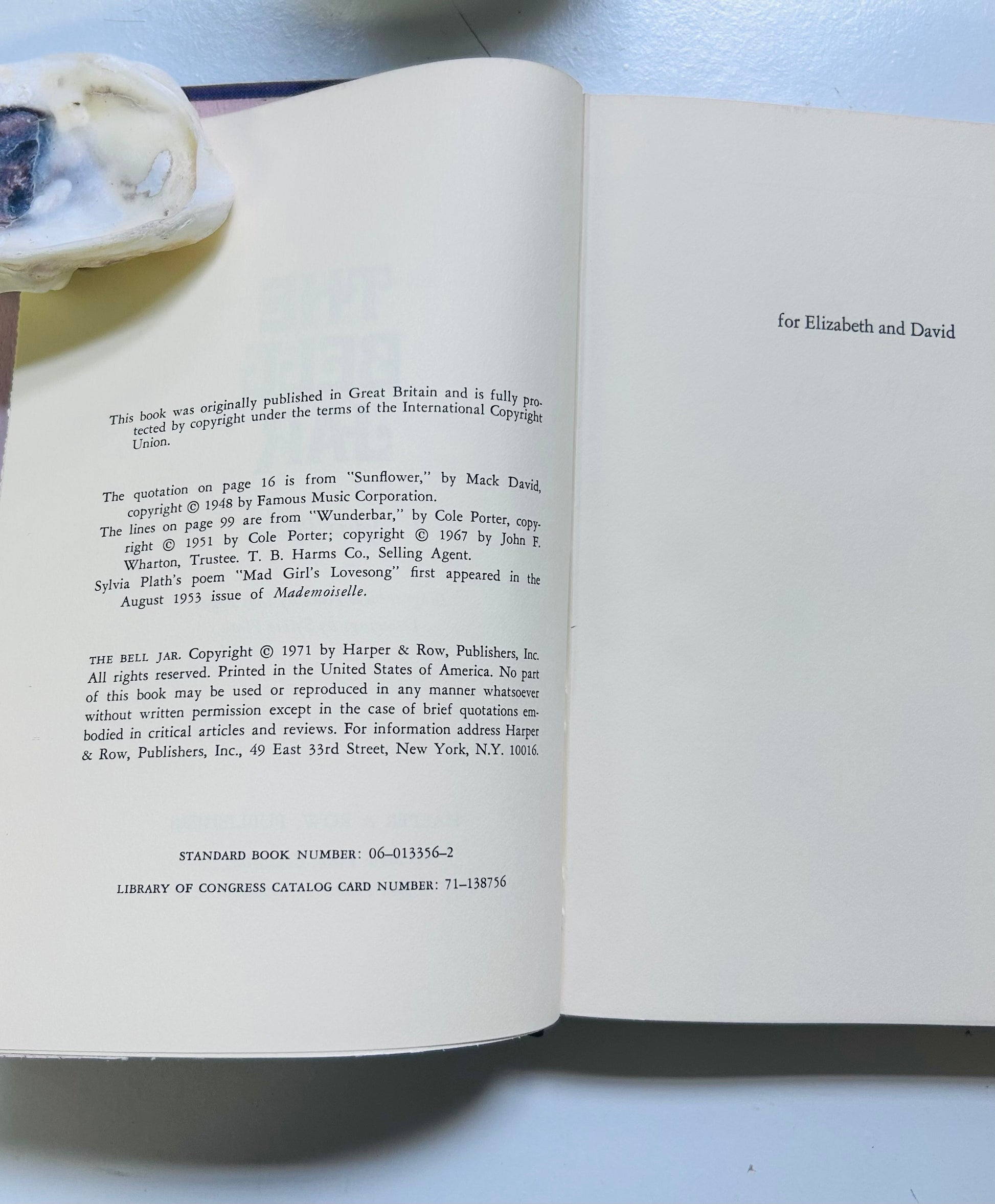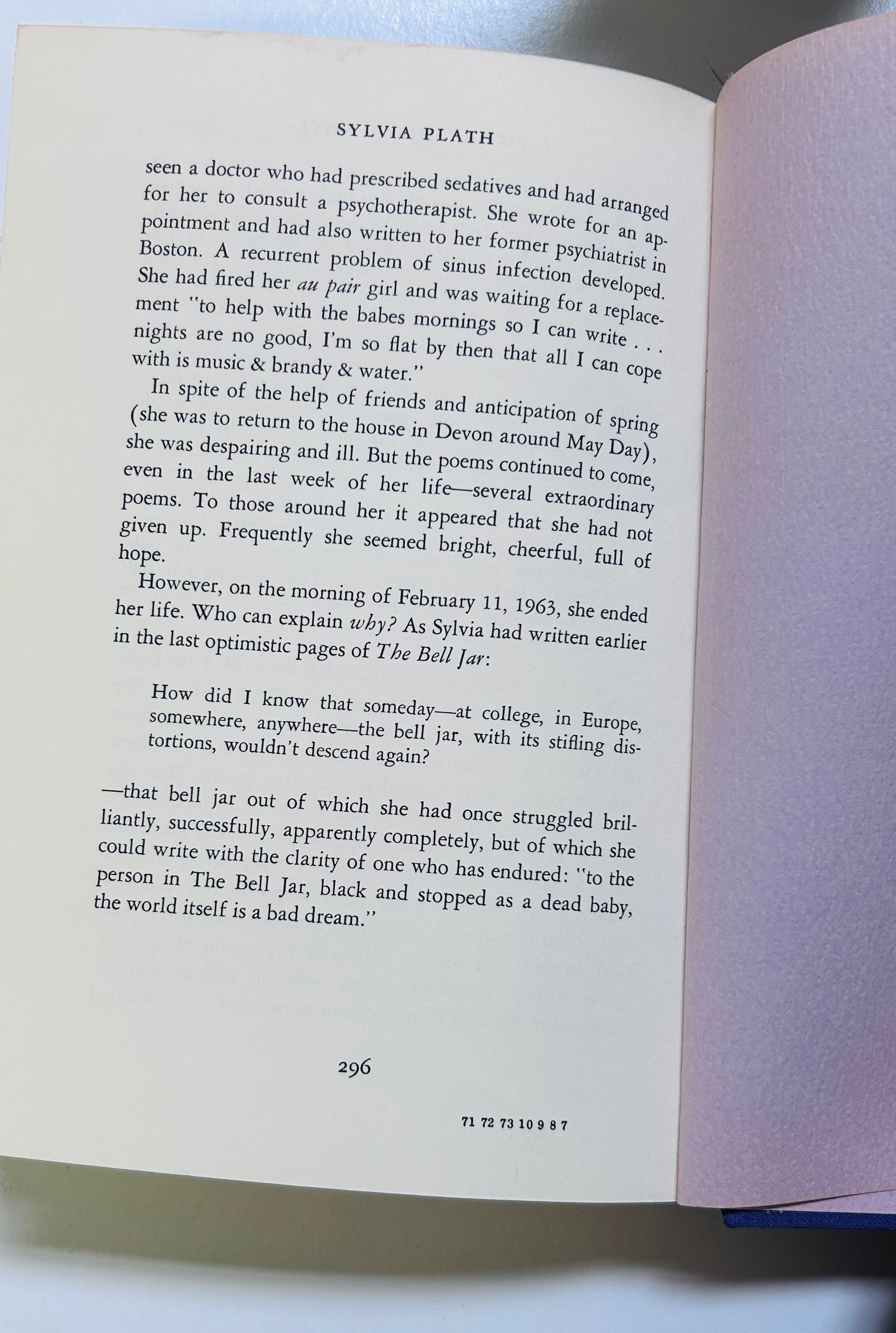 This was Plath's final publication of poems The Collected Poems (1981), won the Pulitzer Prize for poetry in 1983. Book was first published in 1963 in the U.K. under the pseudonym "Victoria Lucas"; this edition published in New York, 8 years later and under her own name.