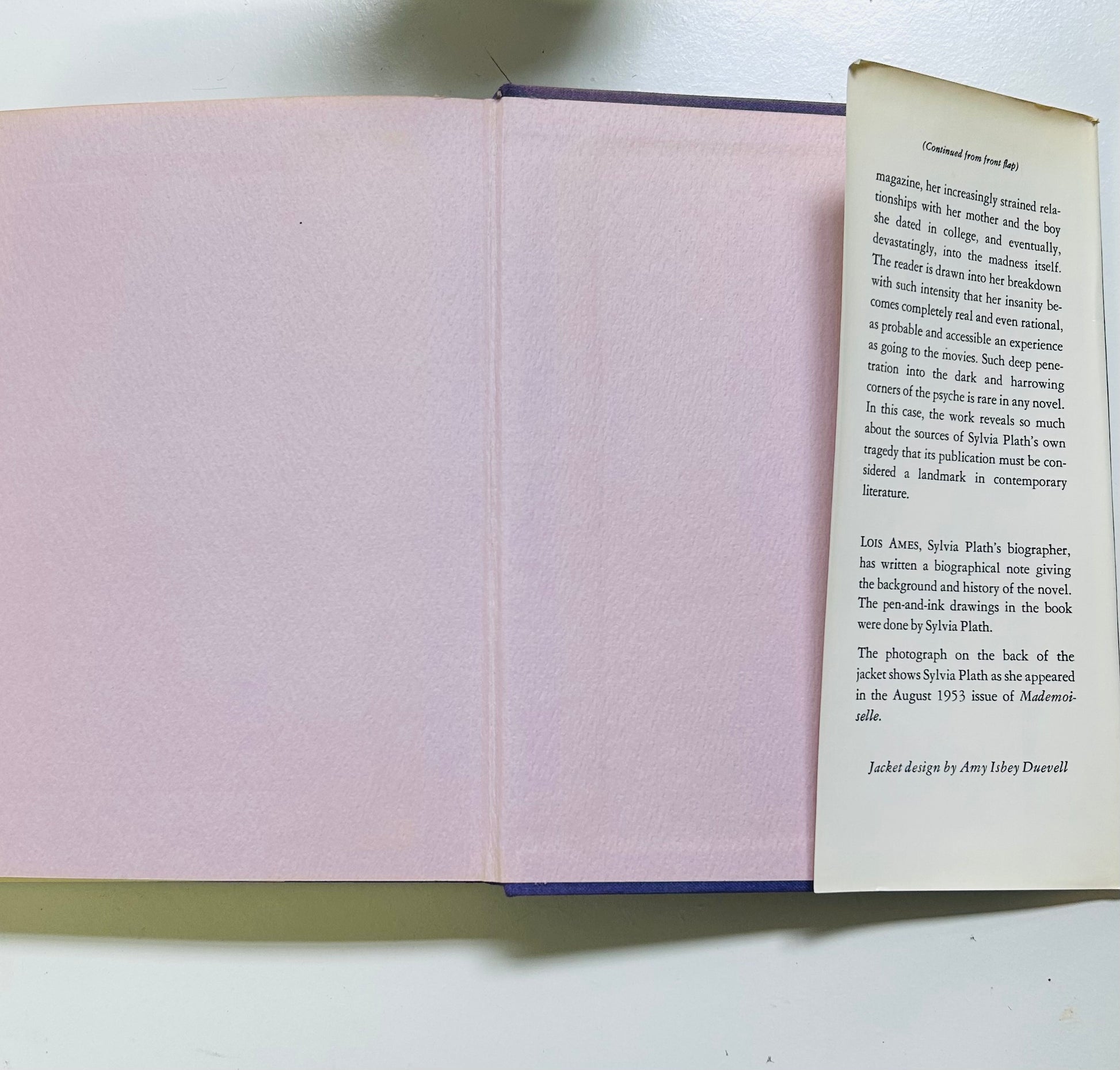 Sylvia Plath. First American edition, seventh printing. New York: Harper and Row Publishers, 1971. Dust jacket is unclipped with original price $6.95 on inside flap, designed by Amy Isbey Duevell. Has the publication date, 0471, also on inside front flap. Both jacket and hardcover are in Very Good+ condition. Has gutter code ending in "7" on page 296. With wear on the board edges, and some toning thus very good with former owner name on the front free endpaper in a very good dust jacket with toning and tears.