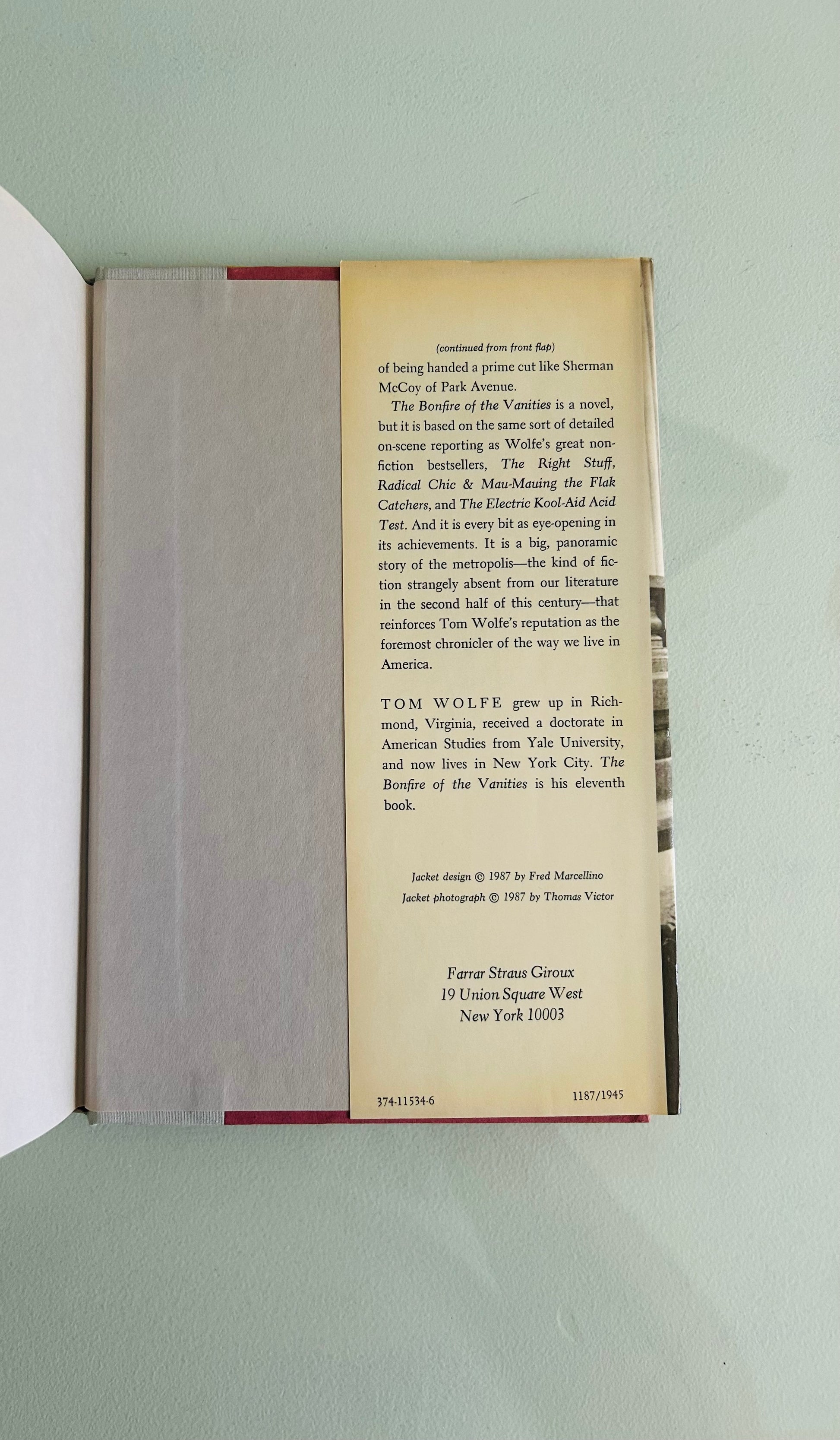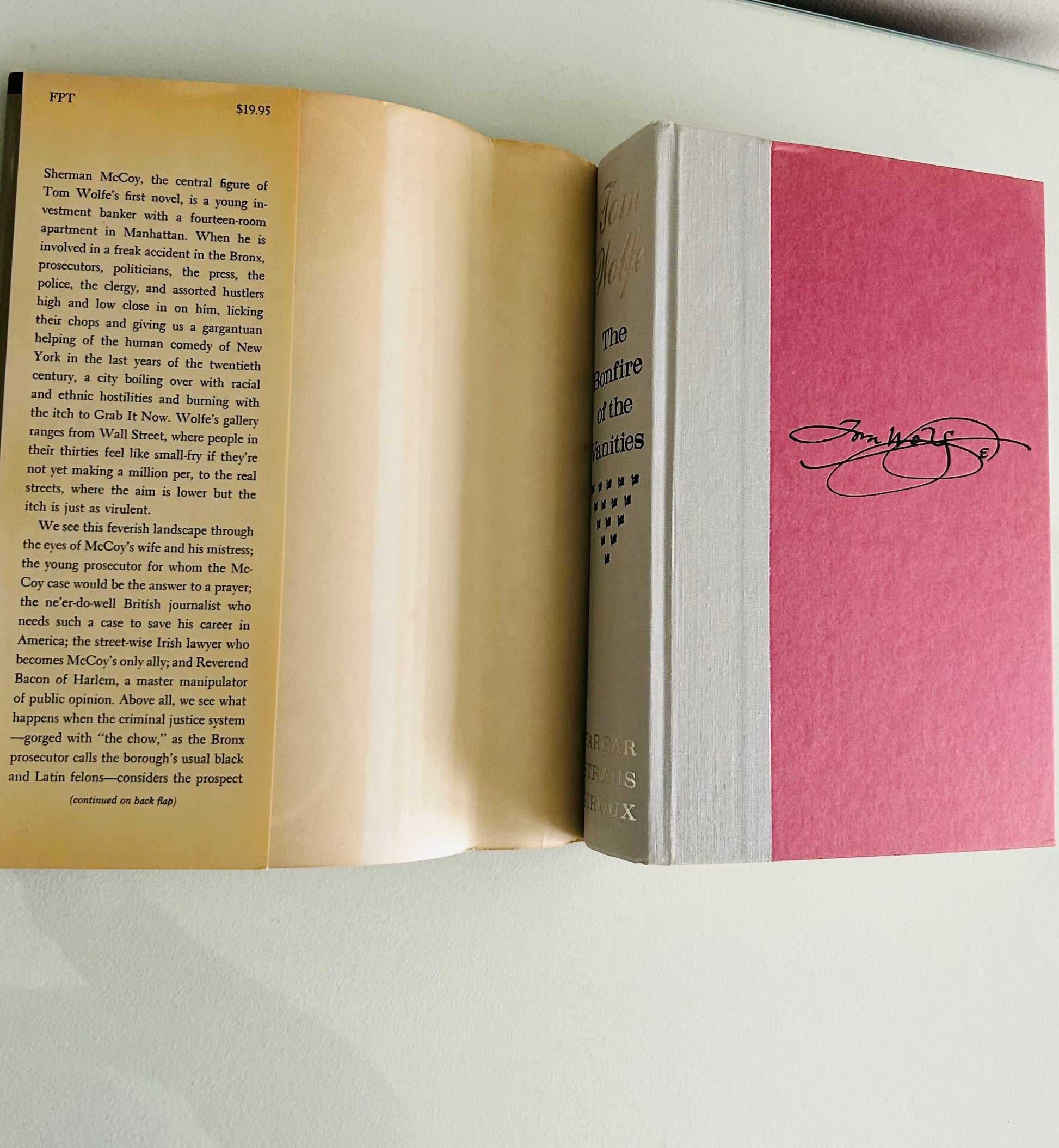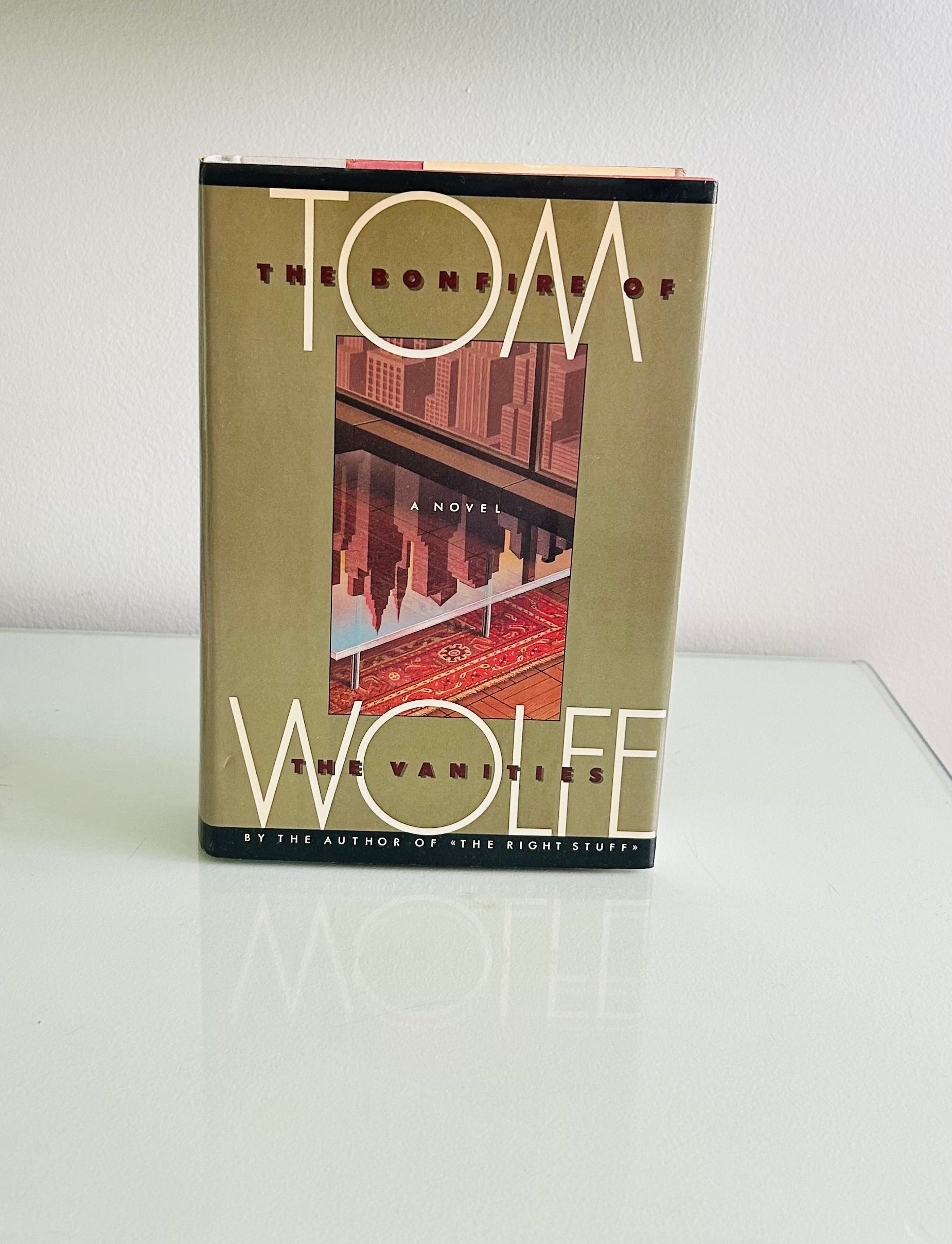 Tom Wolfe. First edition, stated third printing. New York: Farrah, Straus and Giroux, 1987. Both unclipped dust jacket and hardcover are in Very Good+ condition. Jacket design by Fred Marcellino. No writing or markings found in this well preserved copy, 569 pp.