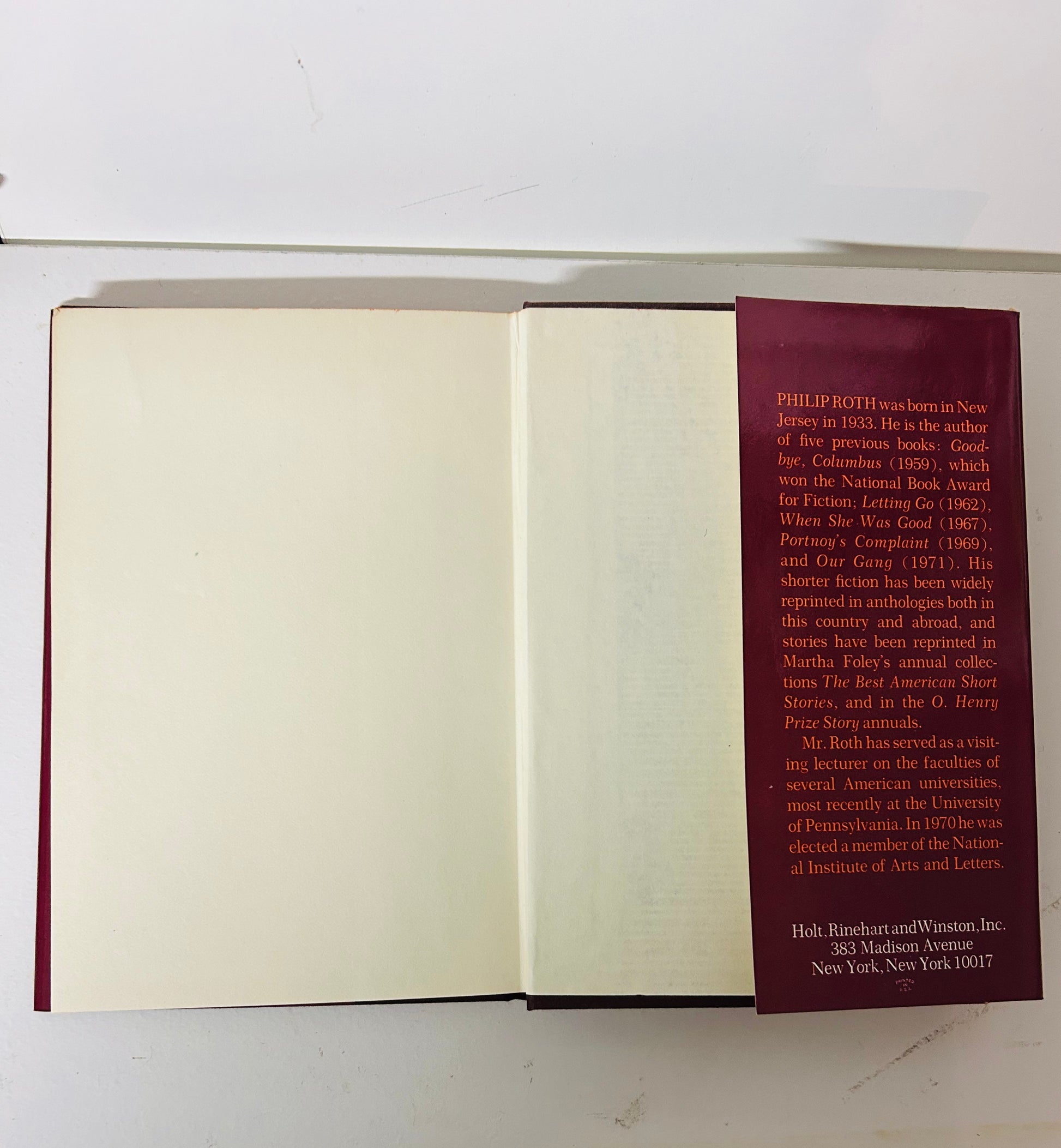 Philip Roth. Stated first edition, first printing. New York: Holt, Rinehart and Winston, 1972. Unclipped dust jacket is in Very Good condition. Has a small tear on backside of jacket otherwise fine. The hardcover has no writing markings found in the book, which is in Near Fine condition, 78 pp.