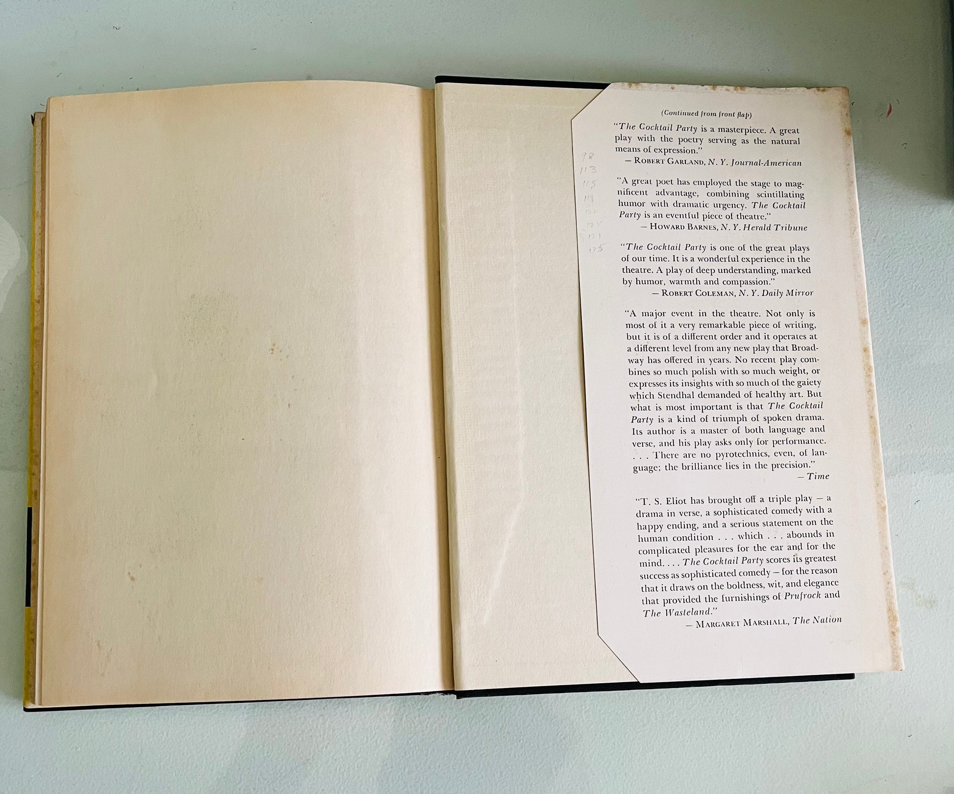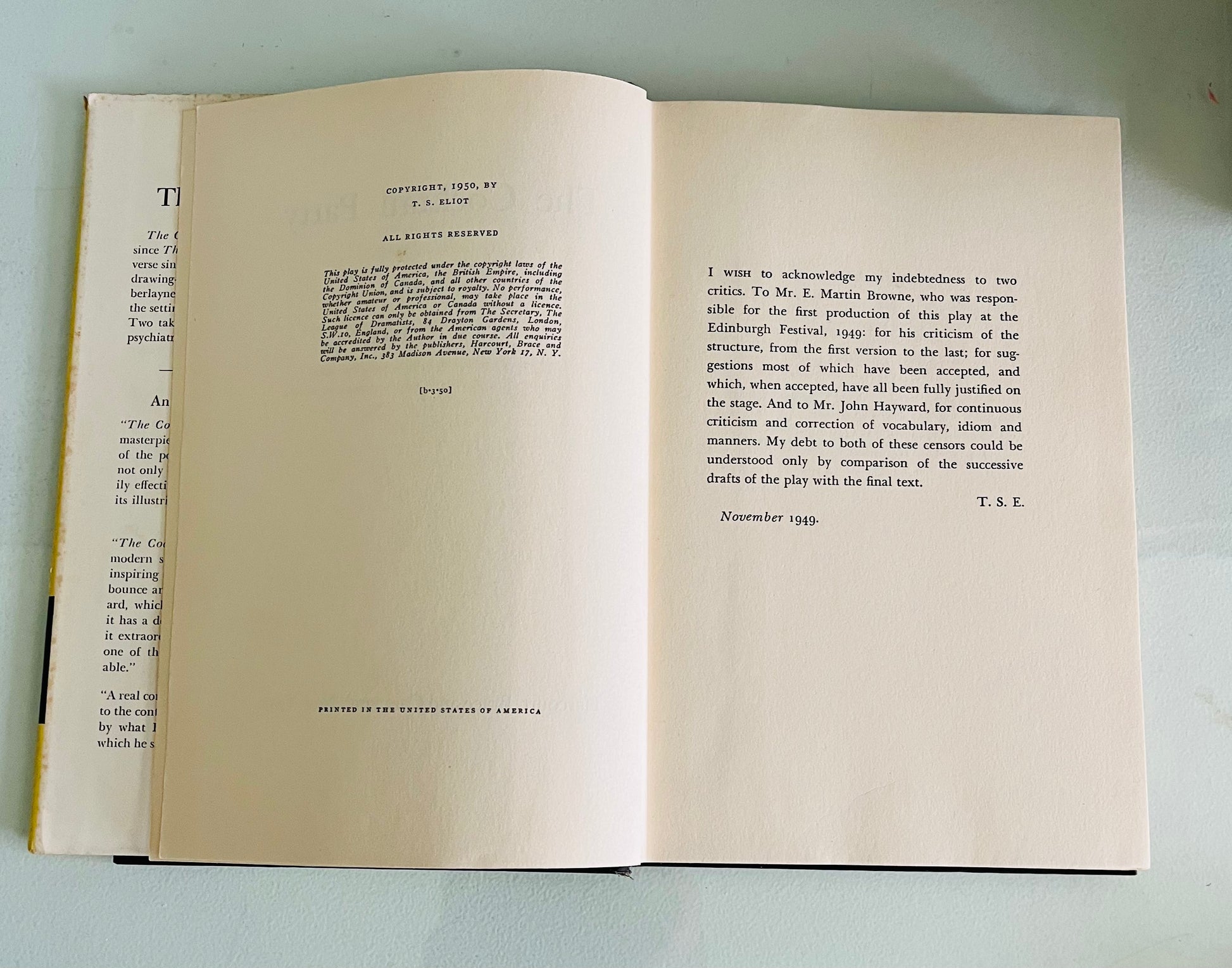 The book is comedic play in verse form which was first produced on stage in 1949. This is one of Eliot's most famous plays and has "One-eyed Riley in verso on final page.