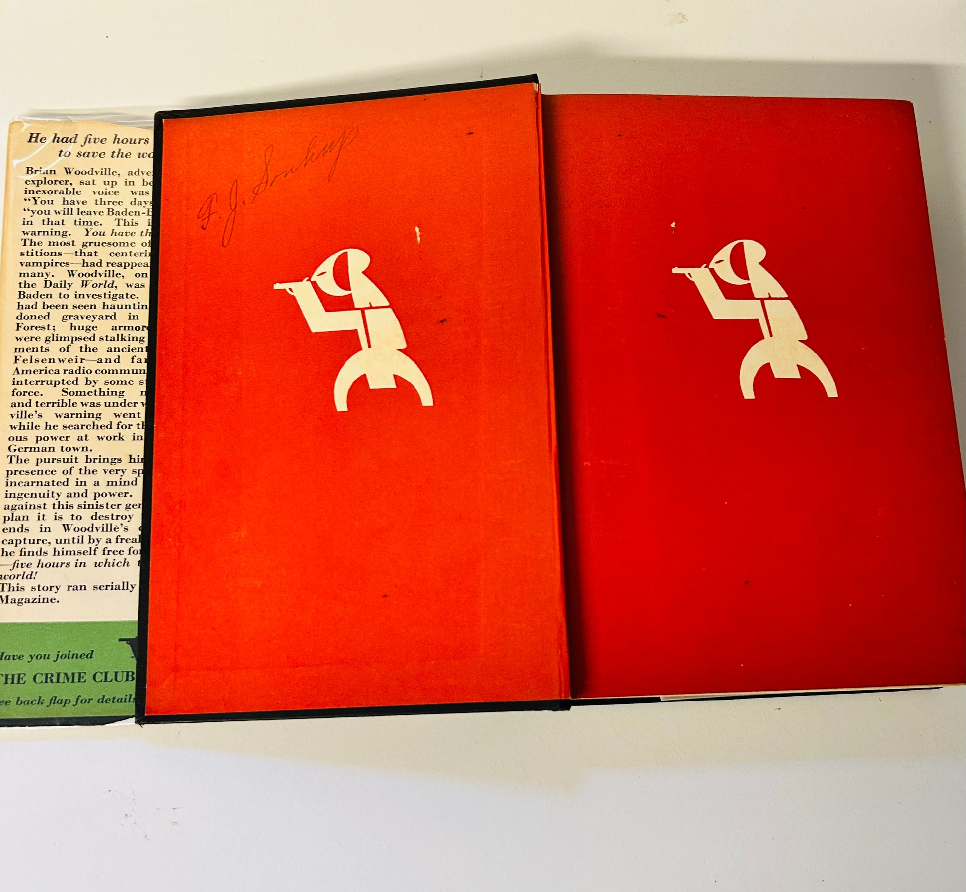 A young man investigating the vampire scare which had appeared in the small town of Baden-Baden, finds himself battling with a sinister genius whose plan is to destroy the world. Crime Club mystery novel.