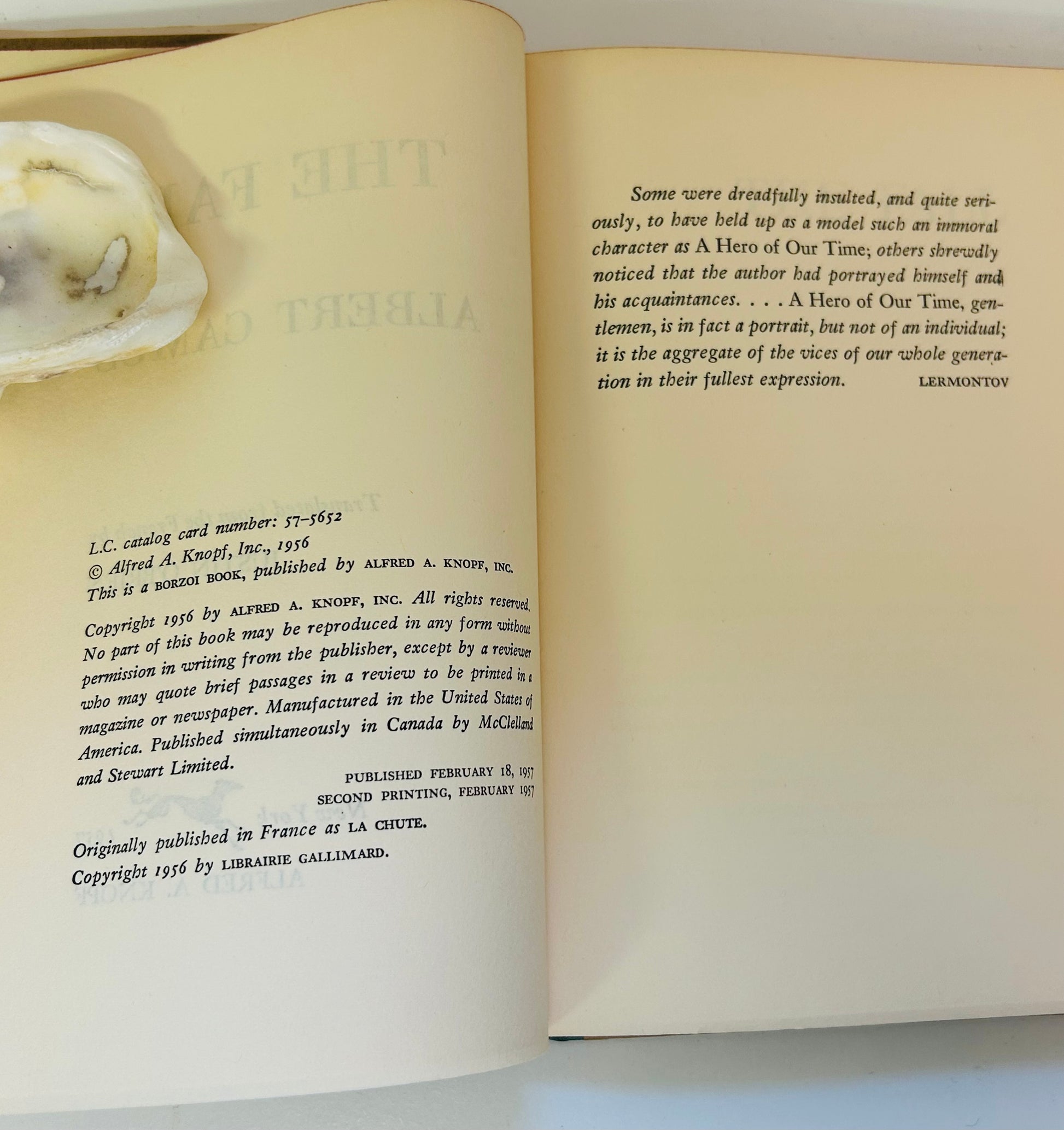 This was the authors fifth book. The book was translated from French by Justin O'Brien. Original publication date in France was in 1956. The American edition publication date was February 18, 1957 while the second printing took place on that same month. The original title, published in French, was La Chute.