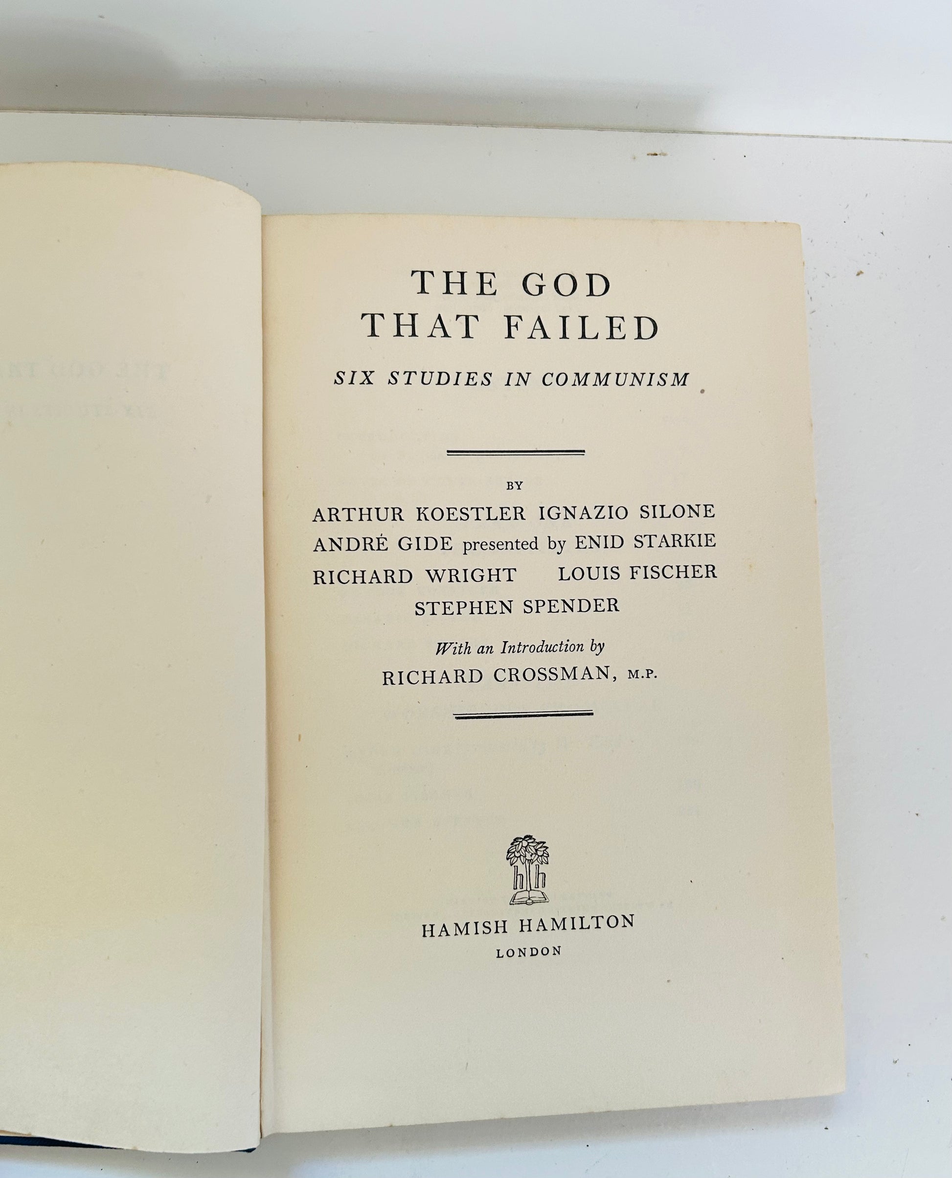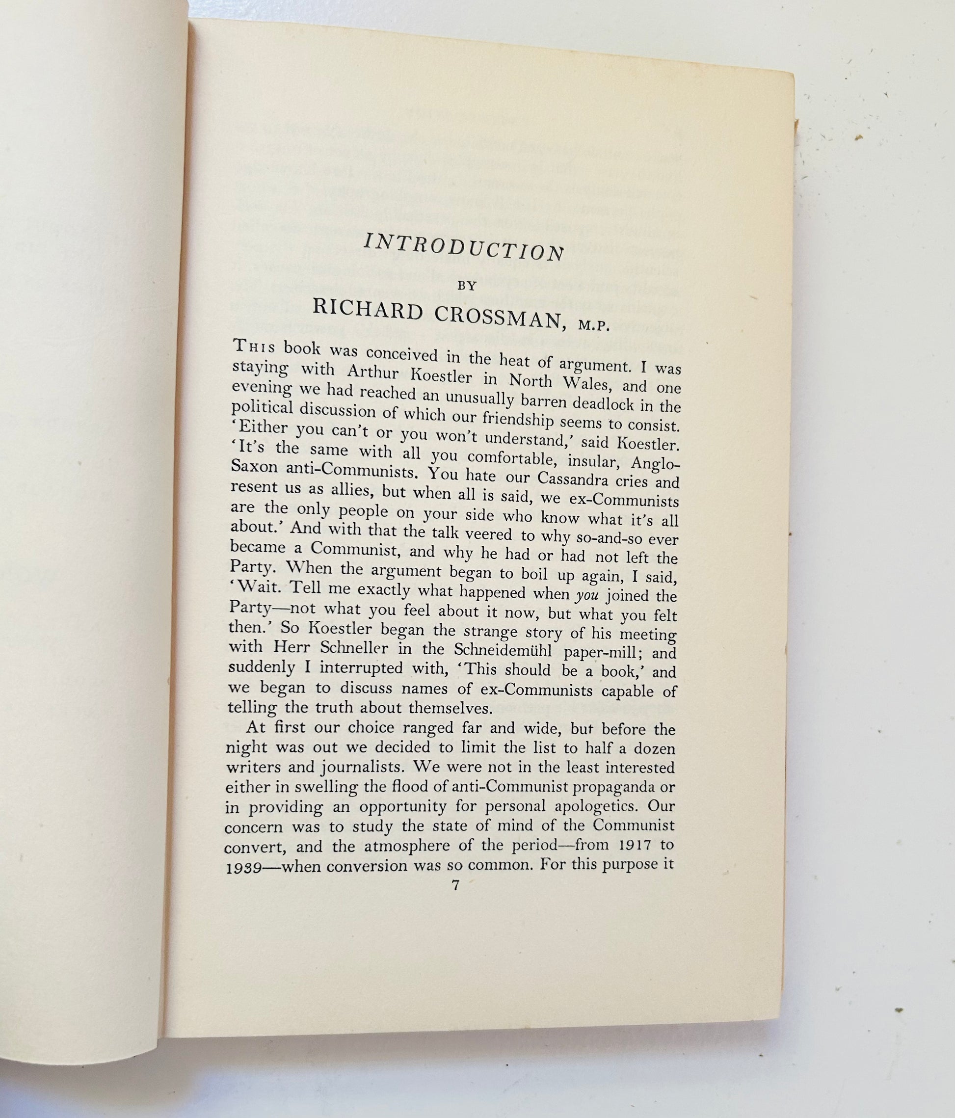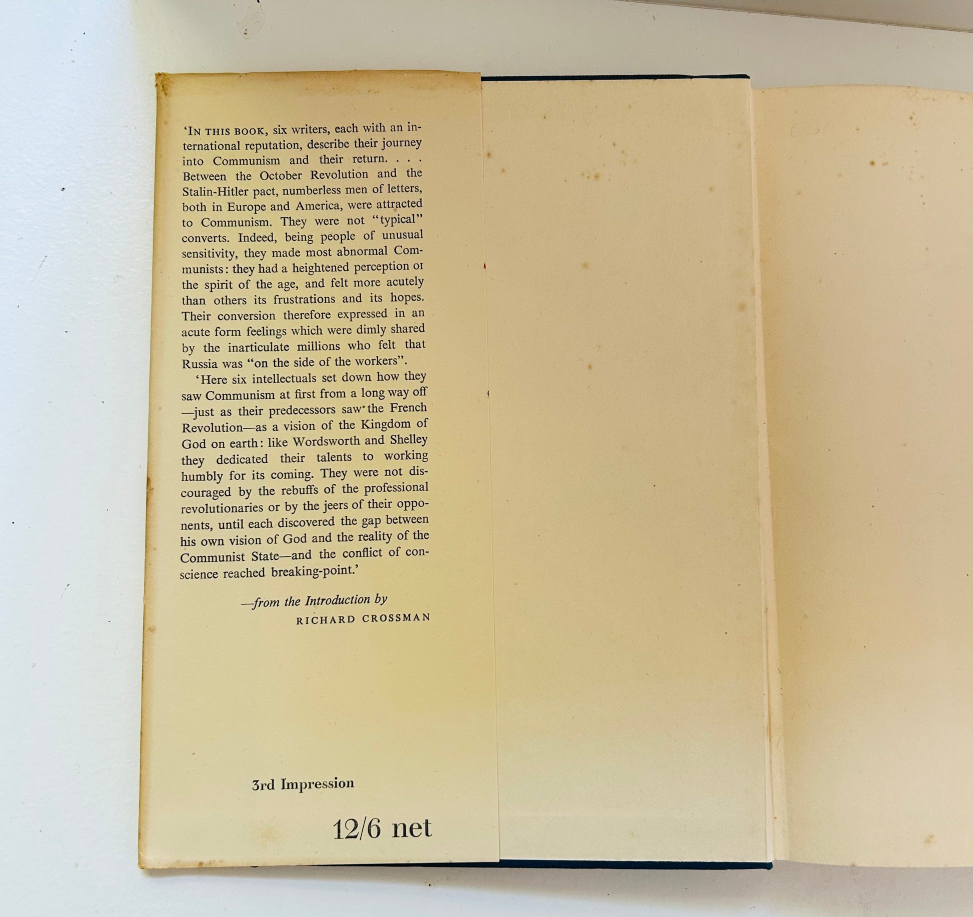 Arthur Koestler, Andre Gide' et al. First edition, third printing. London: Hamish Hamilton, 1950. Both unclipped dust jacket and hardcover are in Very Good+ condition. There is a small tear on the jacket at top of spine. No writing or markings in the book, 272 pp.