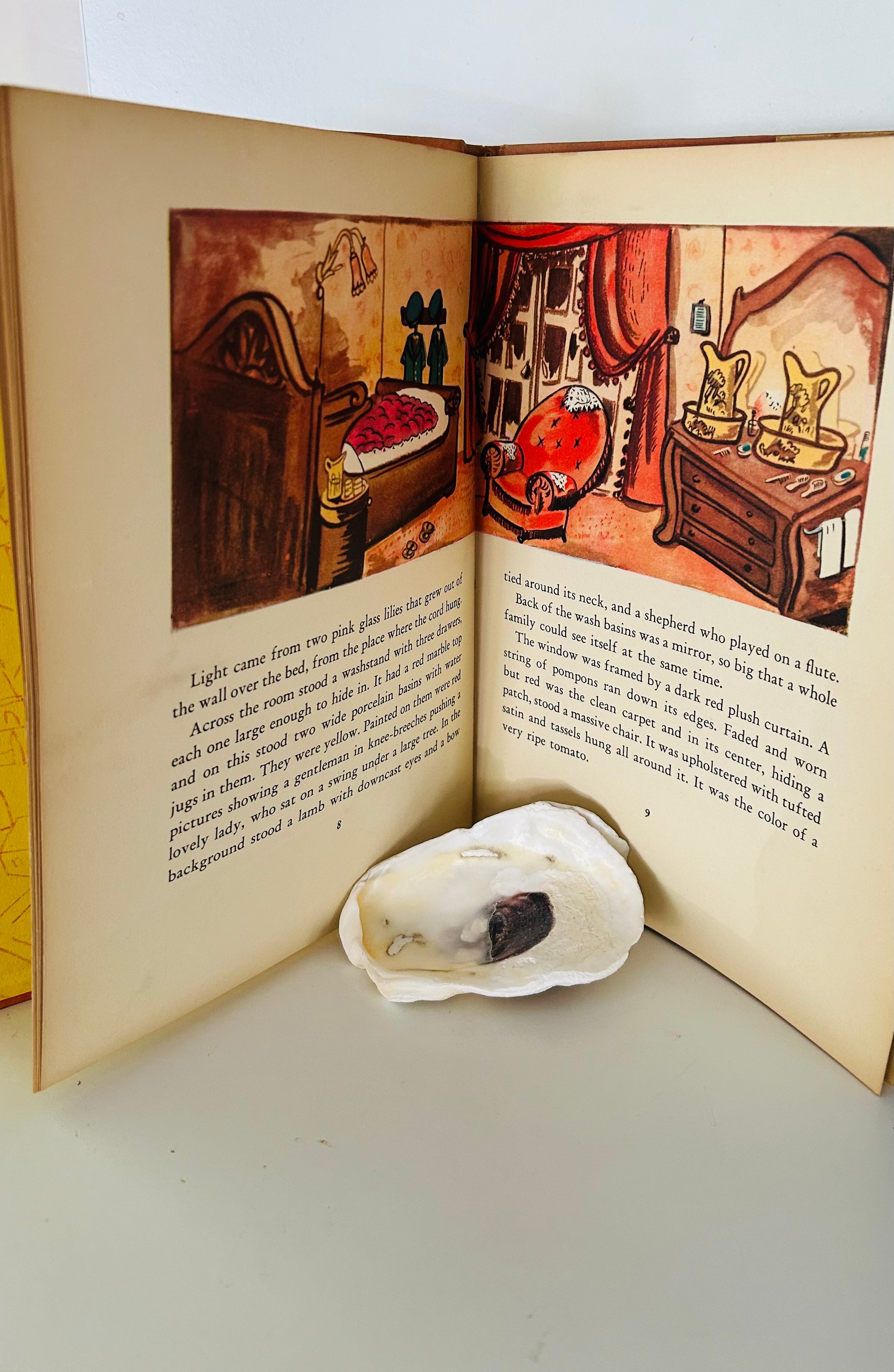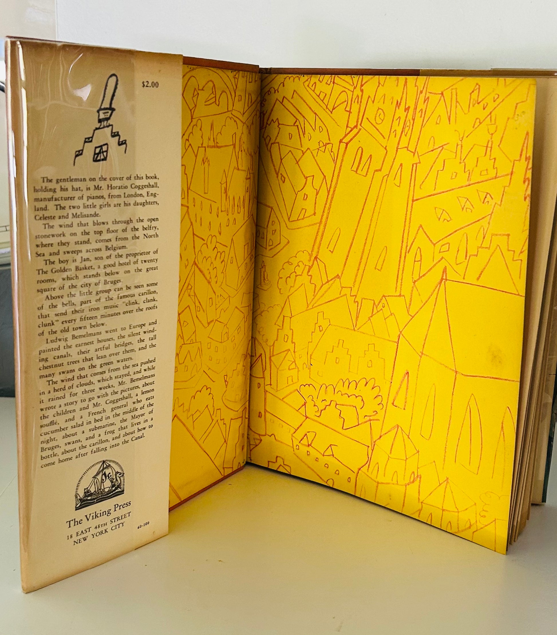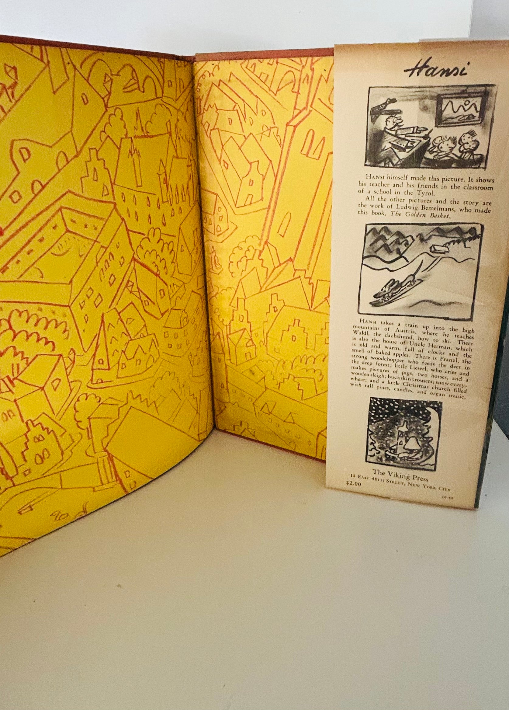 The dust jacket artwork was designed and illustrated by Ludwig Bemelmans himself. Like most of his early work, The Golden Basket features his own whimsical and moody line-and-wash illustrations, both inside and out. His style — naive yet sophisticated — helped shape the aesthetic of mid-20th-century children’s literature.