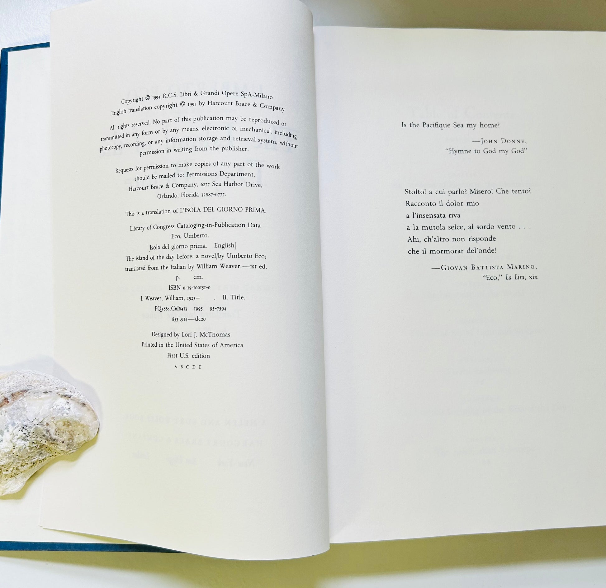 Eco's third novel, in addition to four works of nonfiction and two children's books. The US edition was selected by the editors of The New York Times Book Review for their 10 Best Books of 1995.