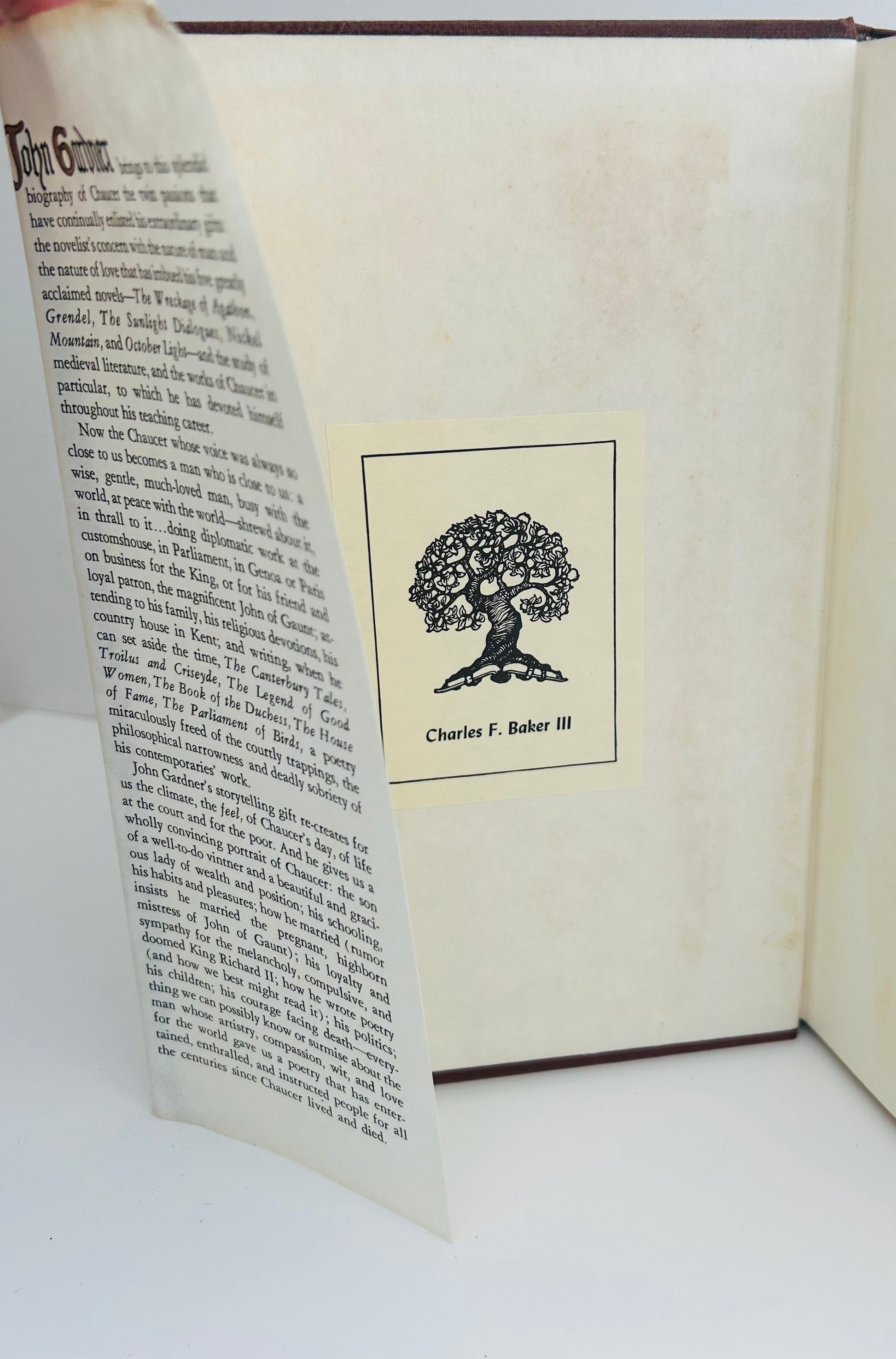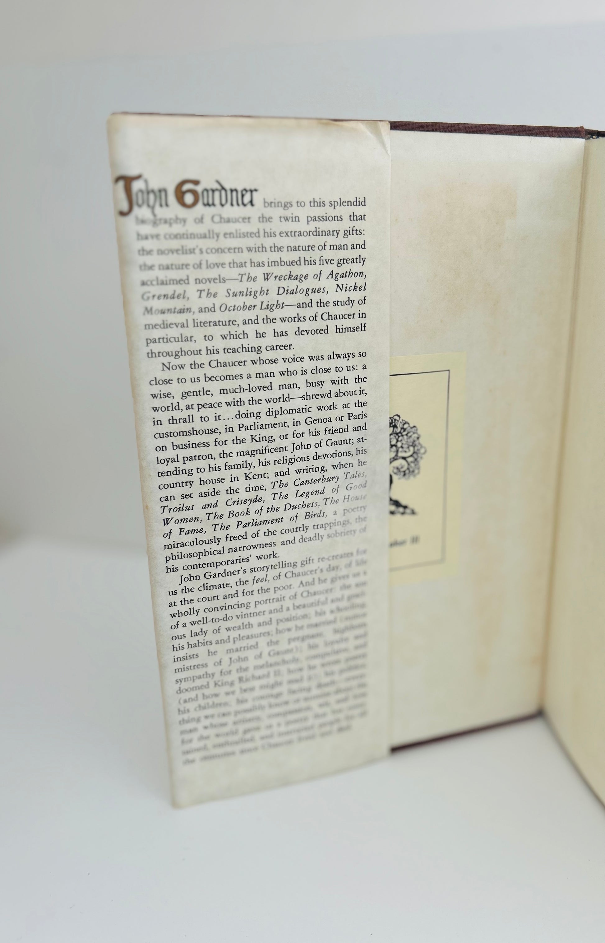 John Gardner. First edition, stated fourth printing. BOMC. New York: Alfred A. Knopf, 1977. Both unclipped dust jacket and hardcover are in Very Good+ condition. There is some chipping on the spine of the jacket and an ex-Libris sticker on inside cover. No writing or markings found in this well preserved copy, 328 pp. The jacket art and illustrations, ornaments, and calligraphy in the text by J. Wolf.