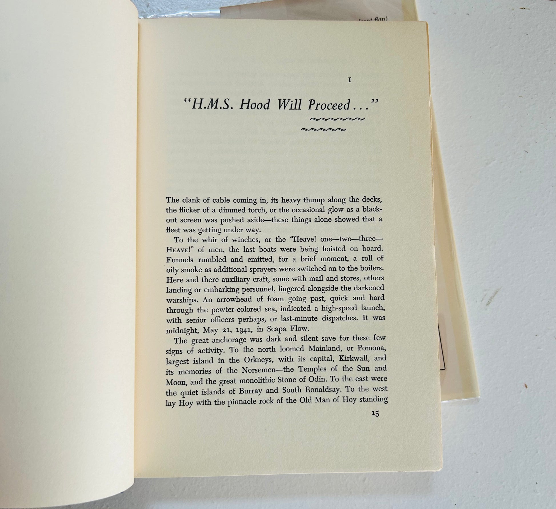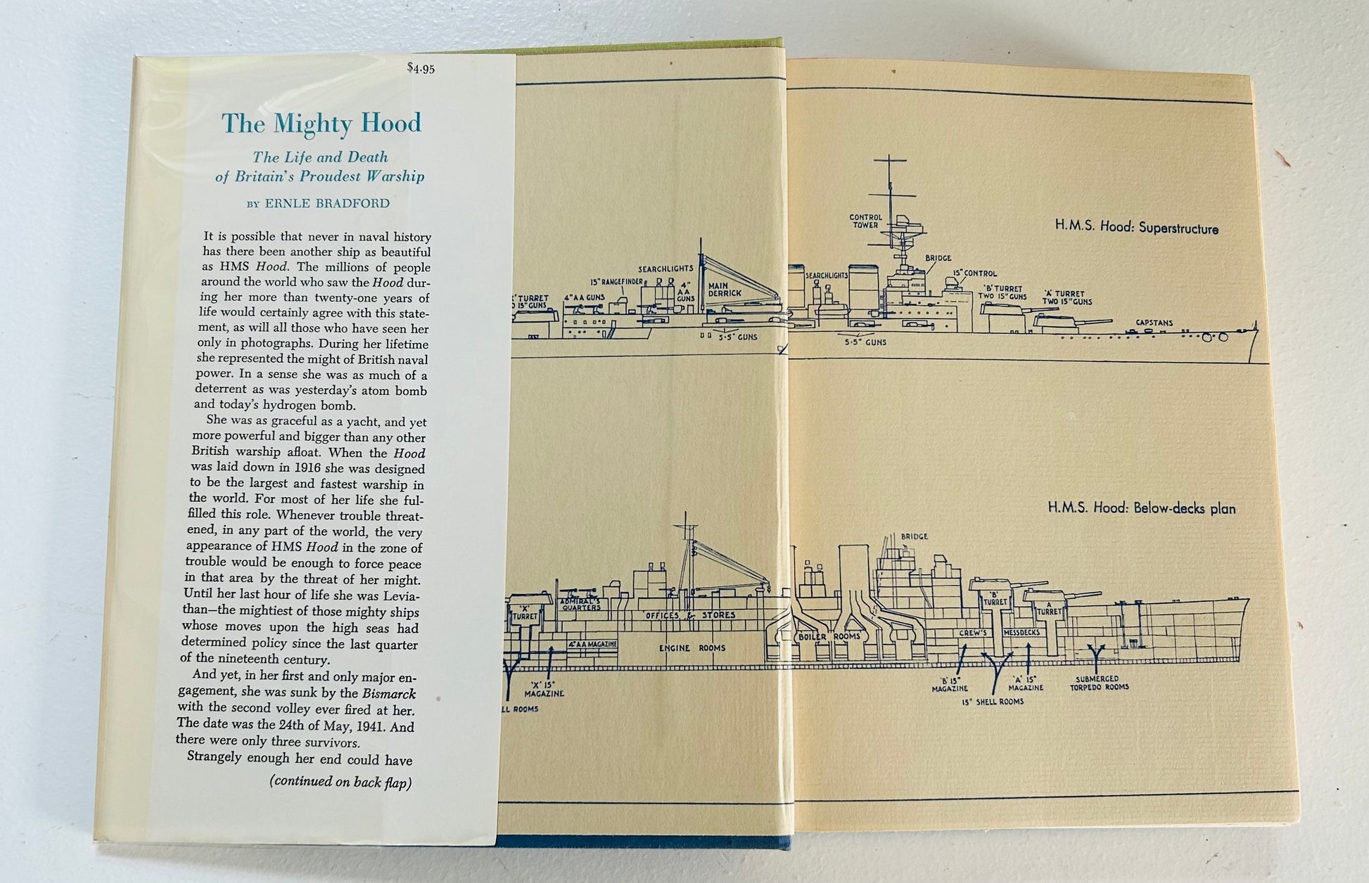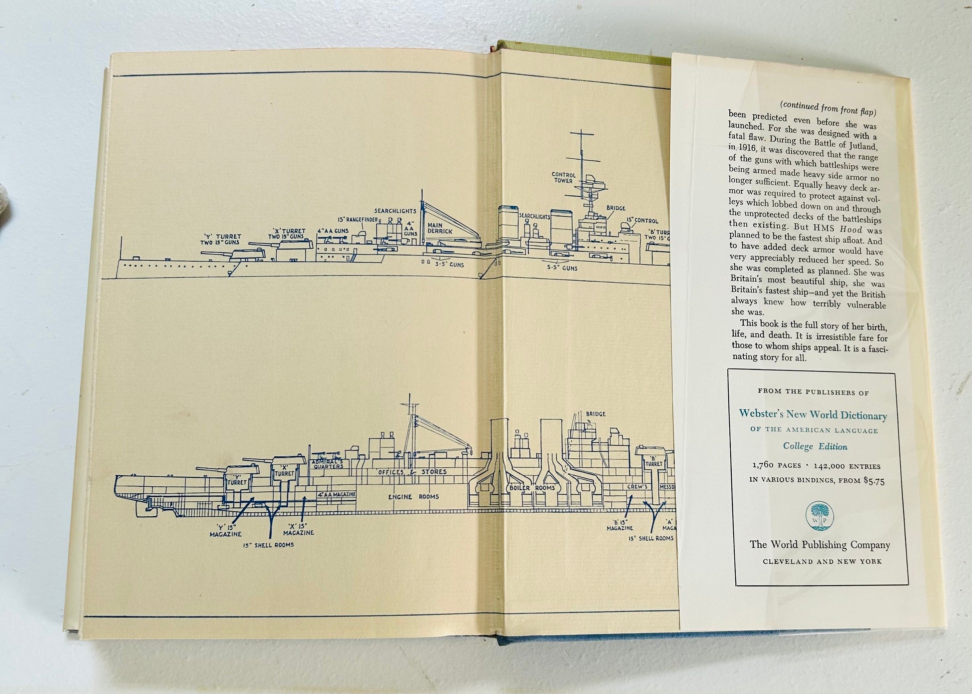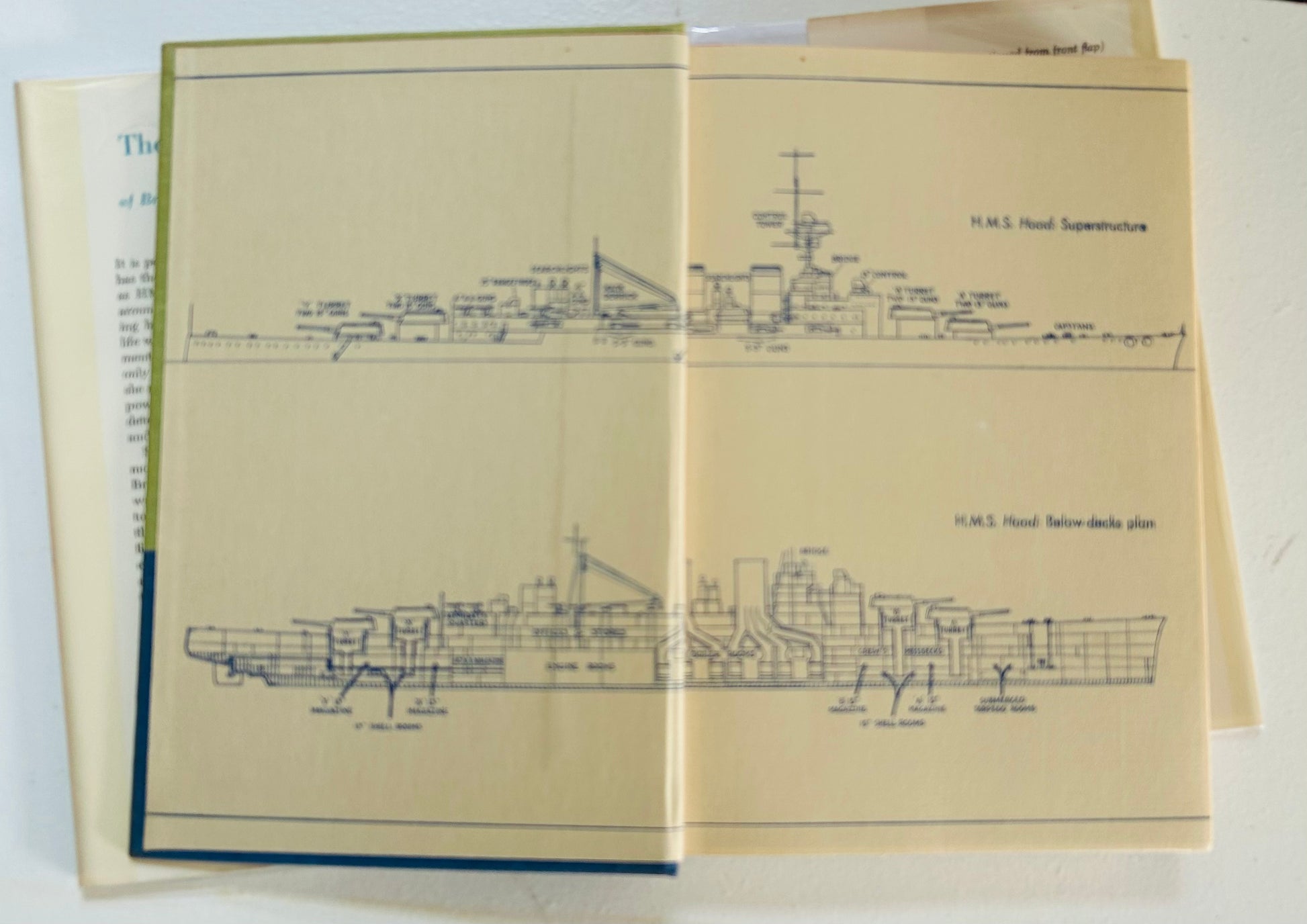 The HMS Hood was considered one of the most beautiful battleships ever designed up until that time. When the ship was "laid down" in 1916 she was designed to be the largest and fastest warship in the world. She was sunk by the Bismarck, however, in 1941 during his first engagement. There were only 3 survivors. The book itself really brings this across via the bookcover itself and the design of the dust jacket.