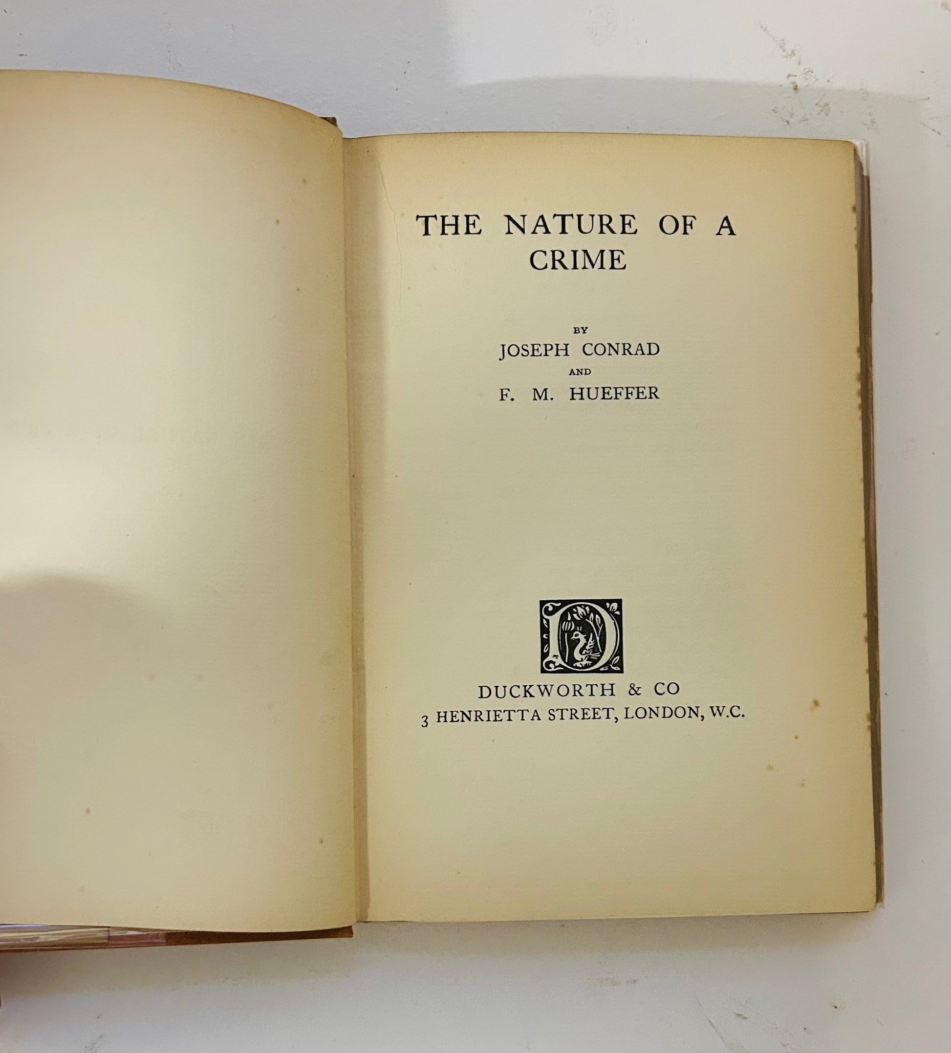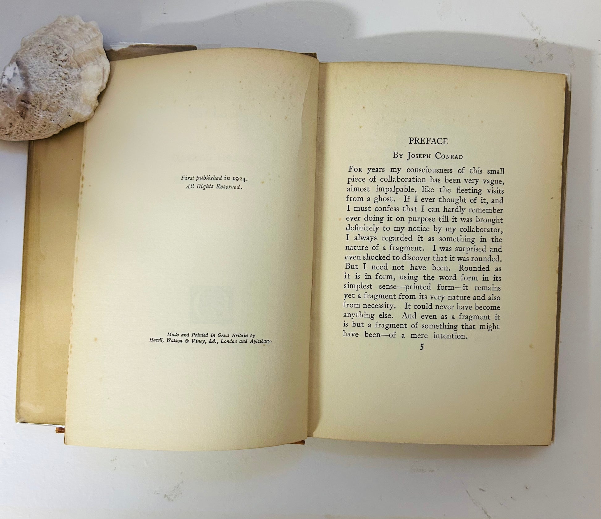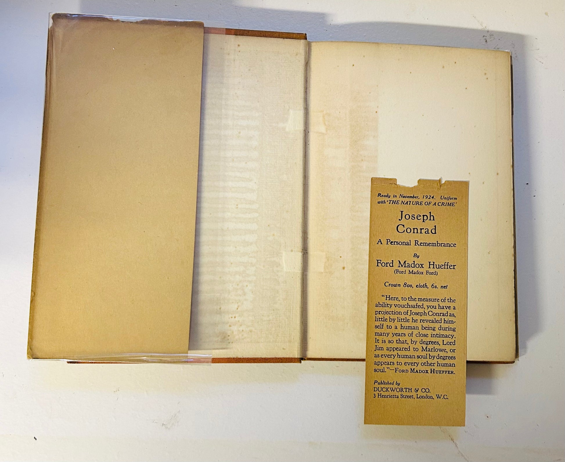 Robert Conrad and Ford Maddox Hueffer (Ford). First U.K. edition. NAP. London: Duckworth and Co., 1924. Includes loosely inserted bookmark sized flyer promoting Hueffer's 1924 remembrance of Conrad and referring to this book. Both the unclipped dust jacket, in a mylar protective wrapper, and hardcover are in Very Good+ condition. Has the original price 5/- net listed on the spine. No writing or markings in this well preserved edition, 119 pp.