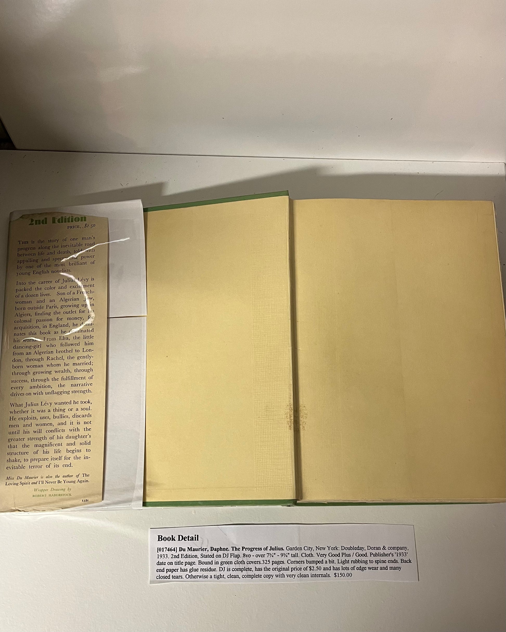 Daphne de Maurier. Second edition (stated on DJ flap). Dust Jacket: Good. A clipped jacket, but not price-clipped, in mylar protective wrapper. Has original price $2.50 on inside flap. Jacket designed by Robert Haberstock. Hardcover: Very Good+ New York: Doubleday, Doran and Company, 1933. Has the same year of publication on title and copyright pages. No writing or markings in the book, 325 pp. This is a scarce edition.