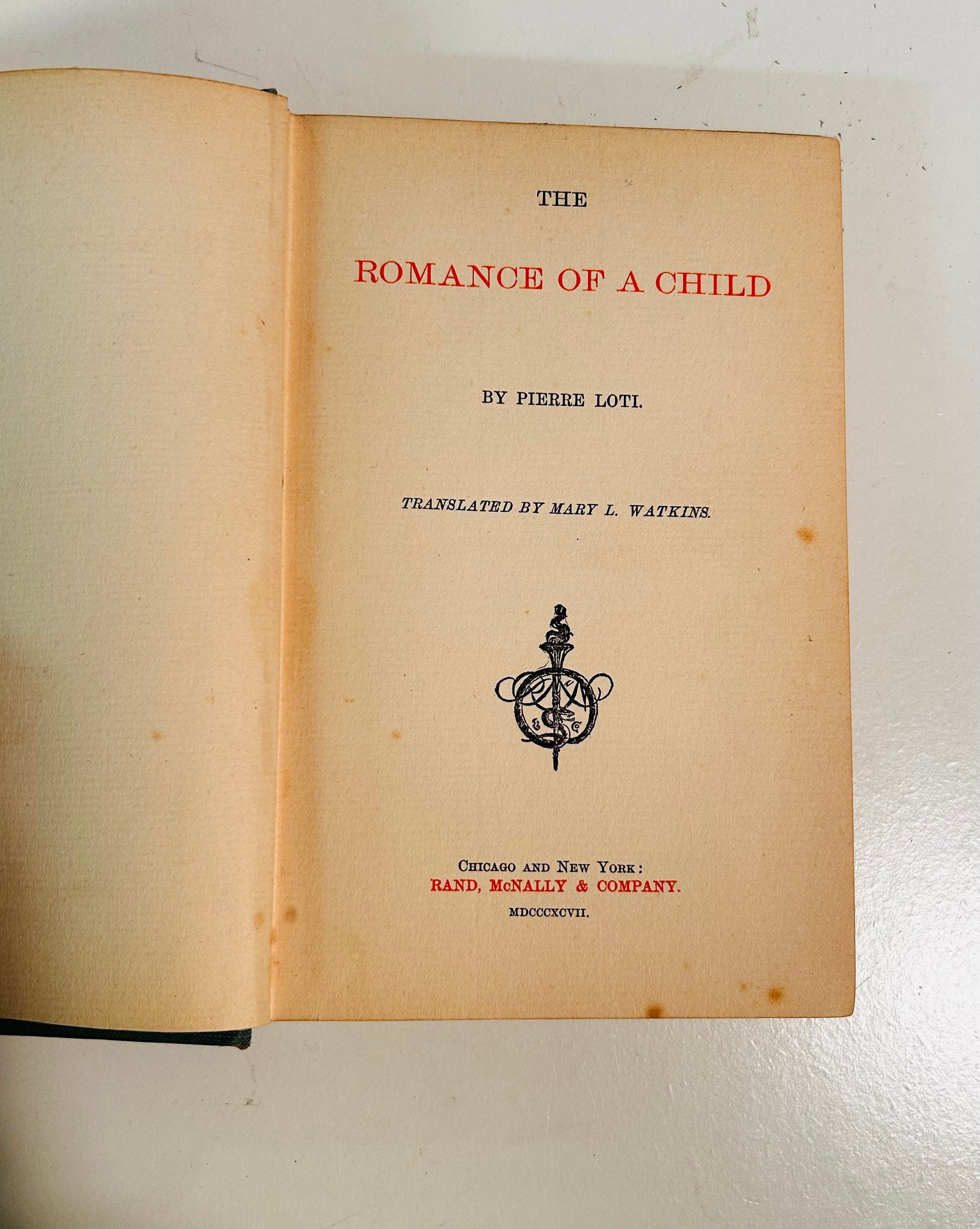 A scarce 1891 hardcover edition of The Romance of a Child by Pierre Loti, published by Rand, McNally & Co., Chicago.