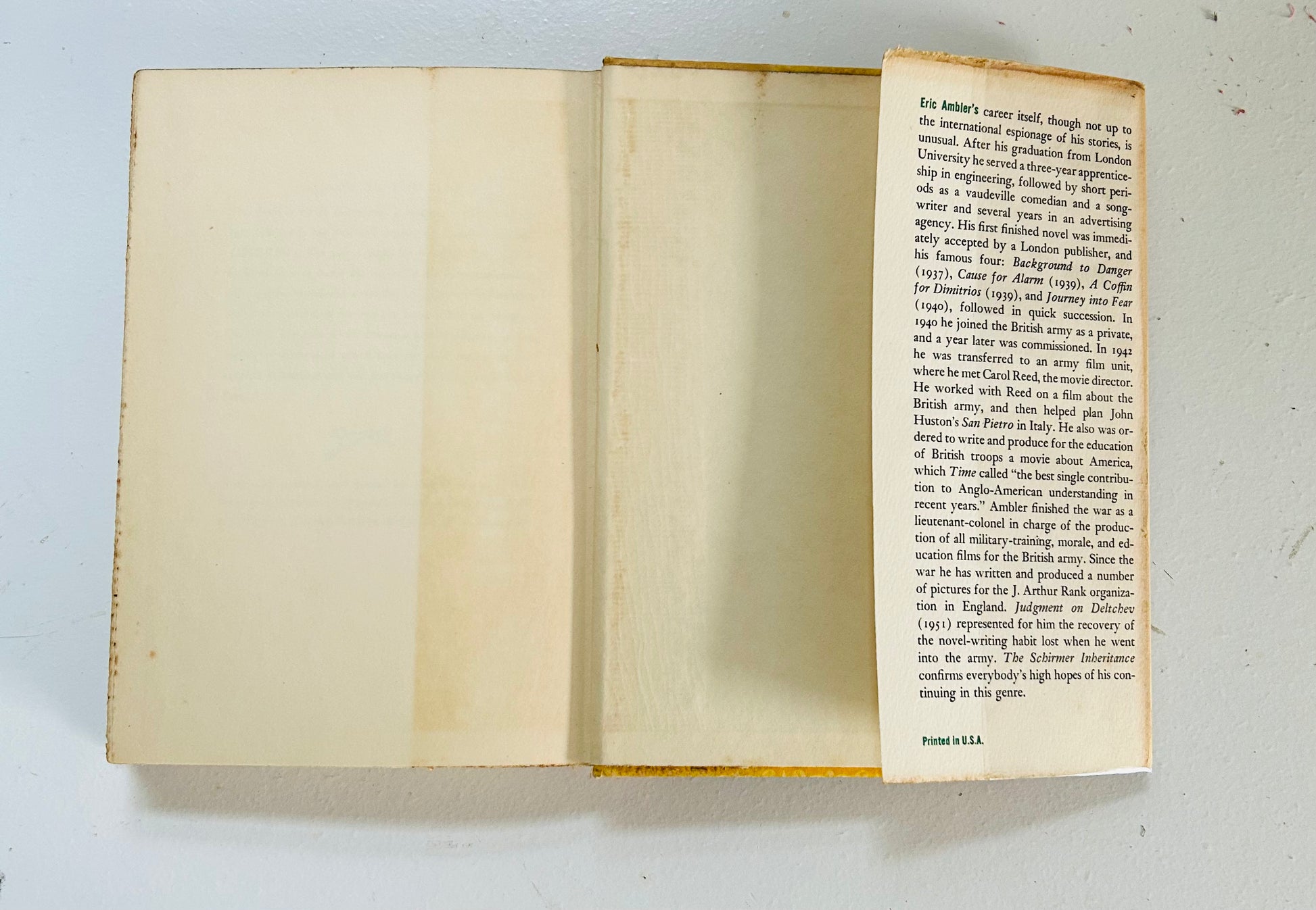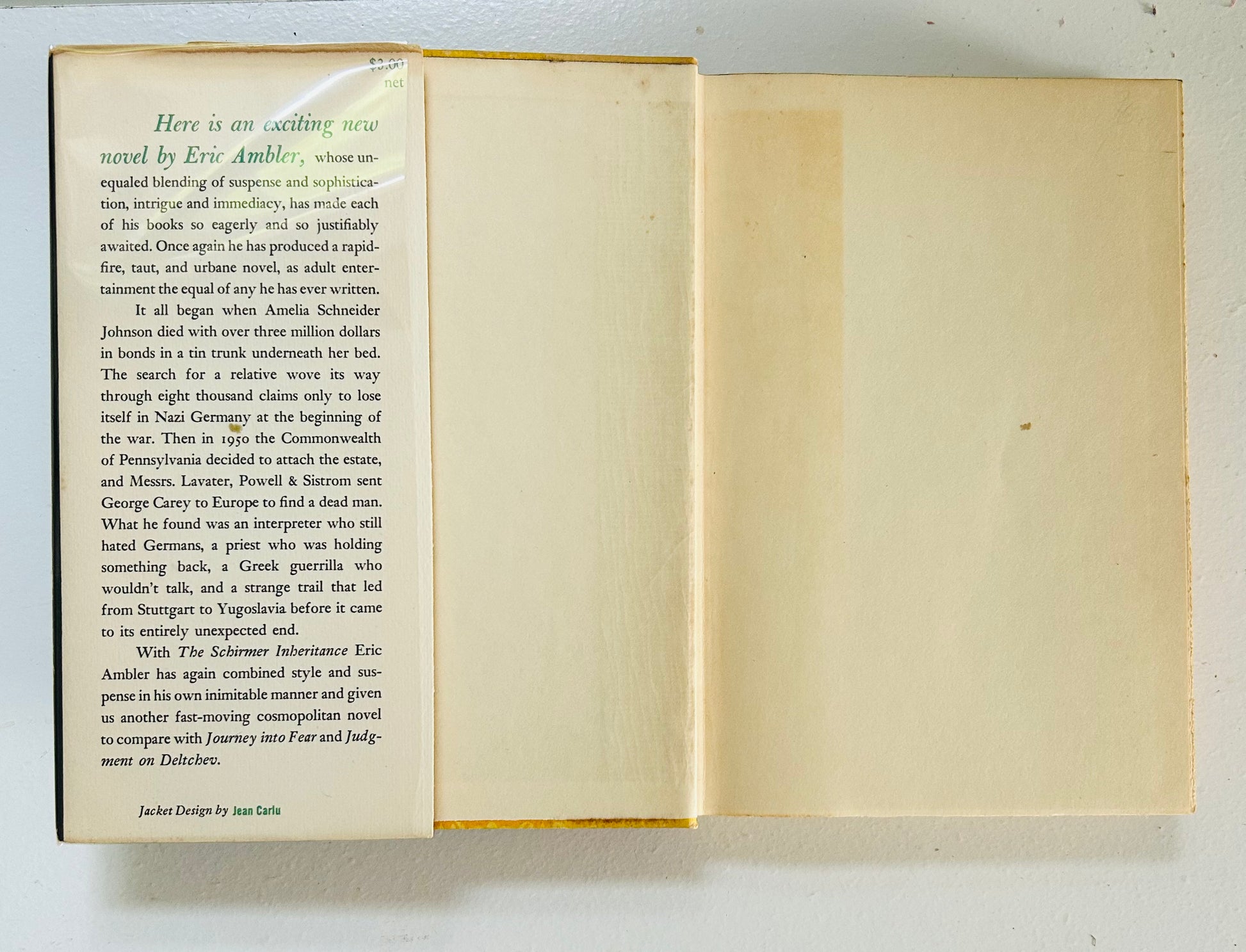 Eric Ambler (1909-1998) began his writing career in the early 1930's, and quickly established a reputation as a thriller writer of extraordinary depth and originality. Ambler is considered the king of the 20th century political thriller. In this, his 8th book, Ambker writes about a Philadelphia lawyers first big job that looks to be a tedious bore, working through an inheritance case with not traceable heir. The case leads him however to danger and adventure in postwar Greece.
