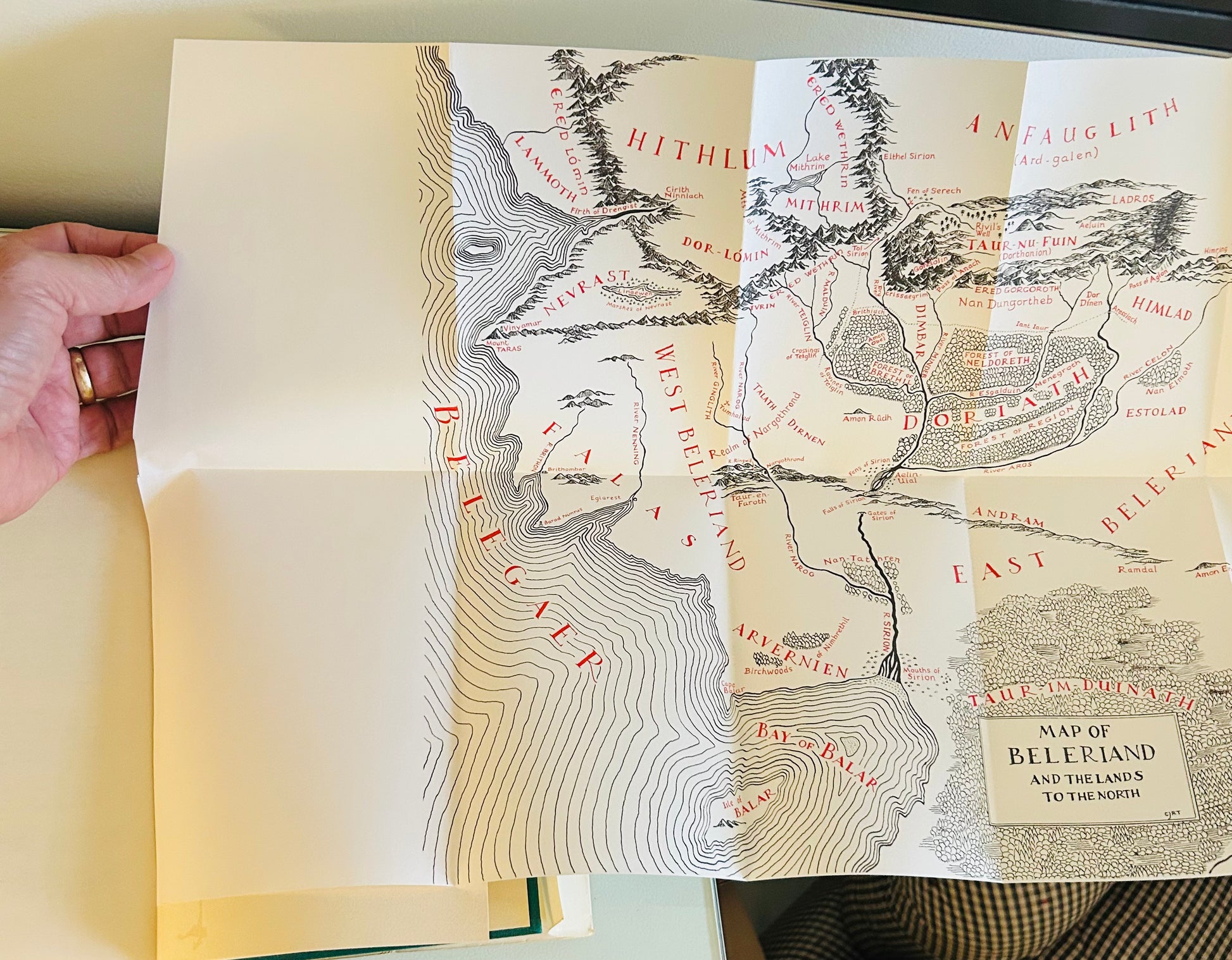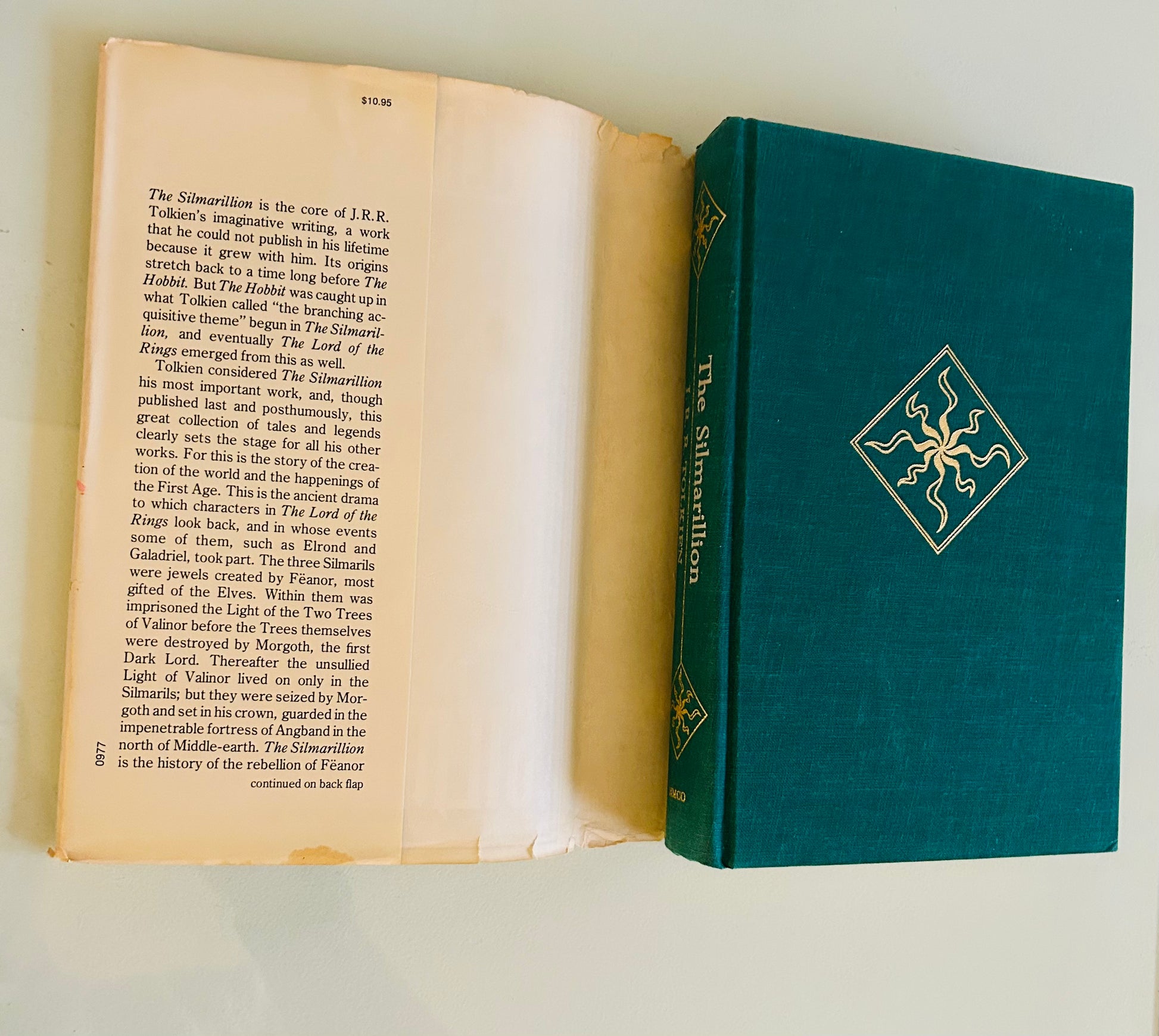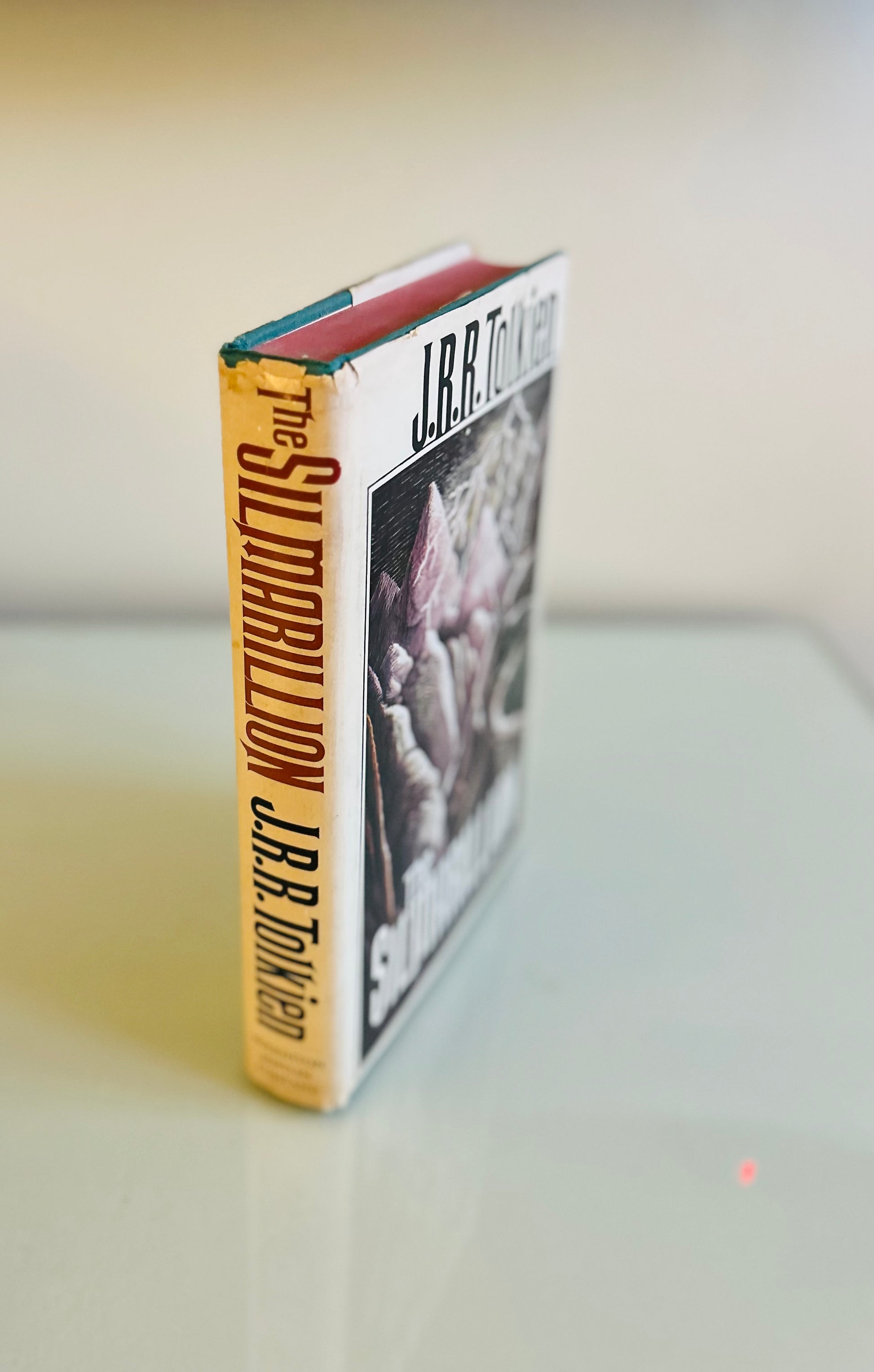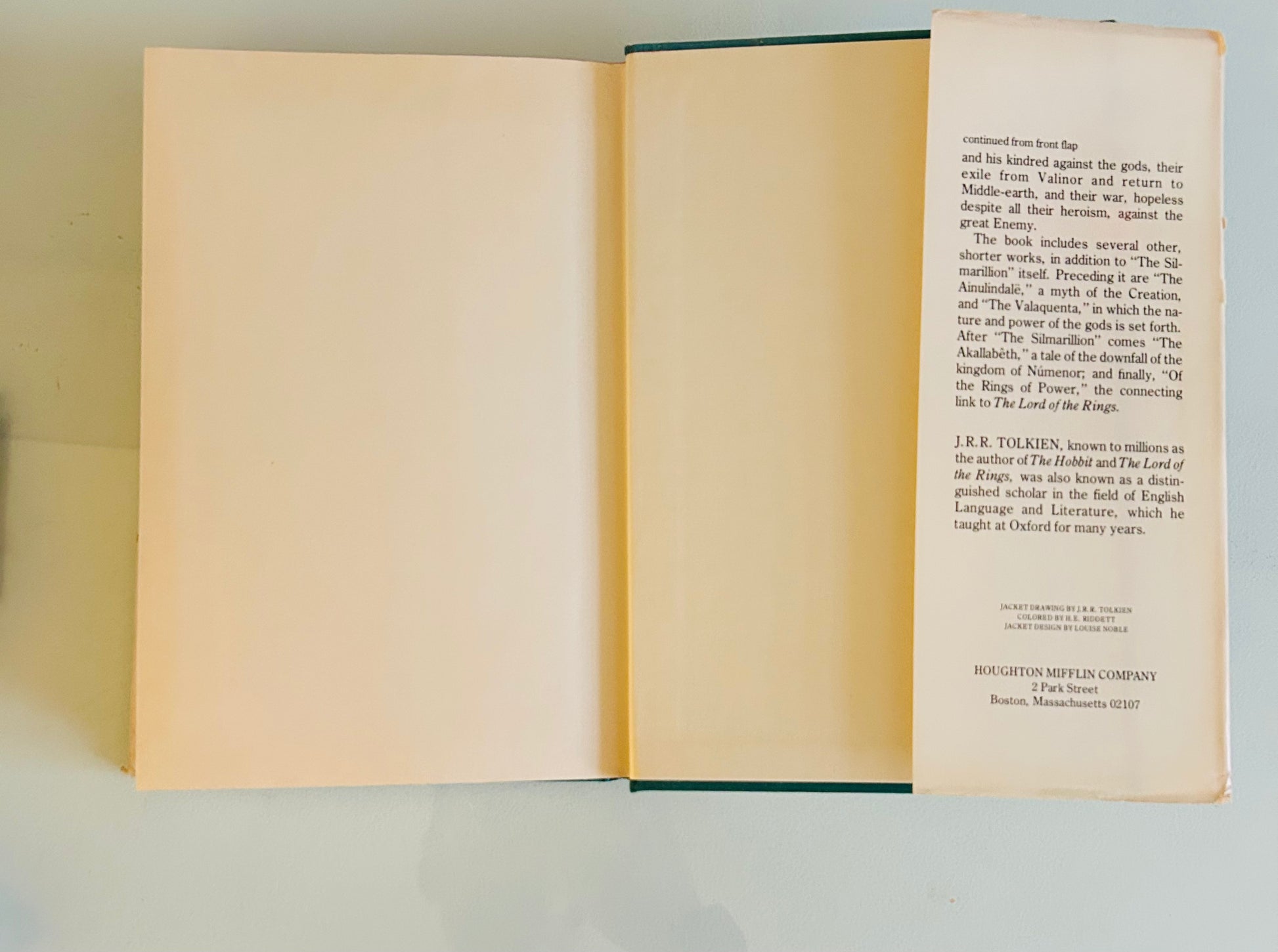 J.R.R. Tolkien. Edited by Christopher Tolkien. Stated first American edition, first printing. Boston: Houghton Mifflin Company, 1977. Both unclipped dust jacket and hardcover are in Very Good+ condition. With original price $10.95 on inside flap. Jacket design by Louise Noble. With full number line, 10-1, on copyright page and the folding map of Beleriand in rear of book, in excellent condition. Bound in beautiful teal cloth, with no writing or markings found in the book, 365 pp. Has some chipping on spine and a few small tears, with a red mark on pages (see photo). First State copy with unbroken text on page 229.