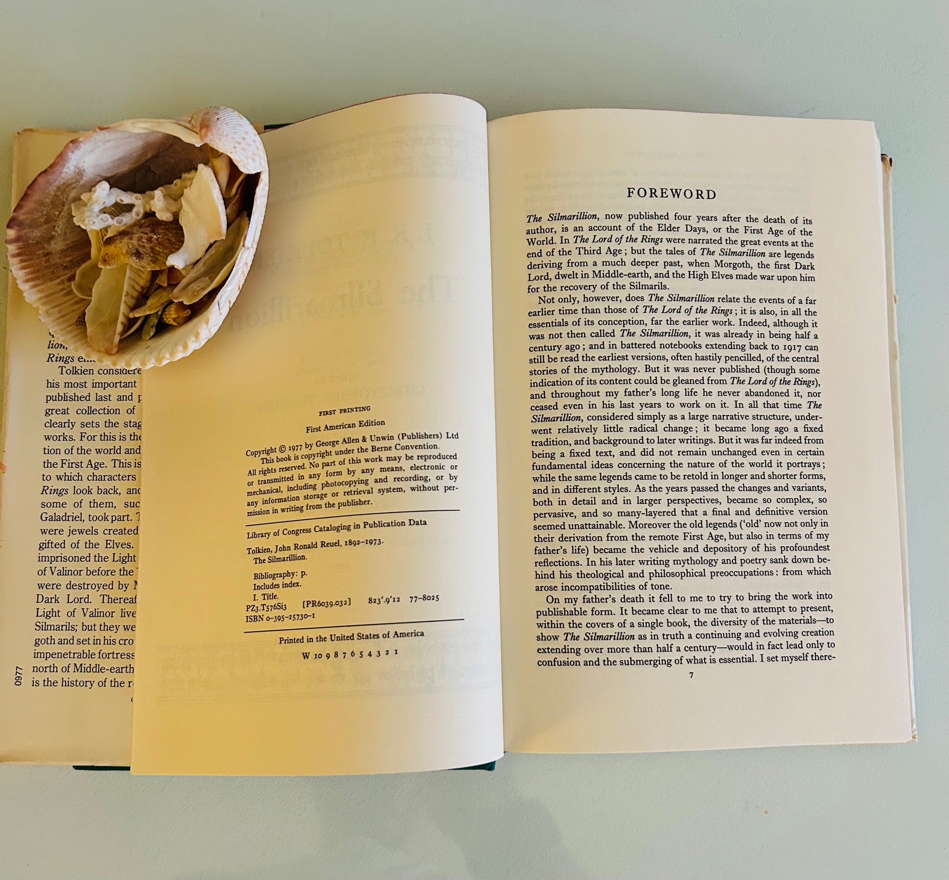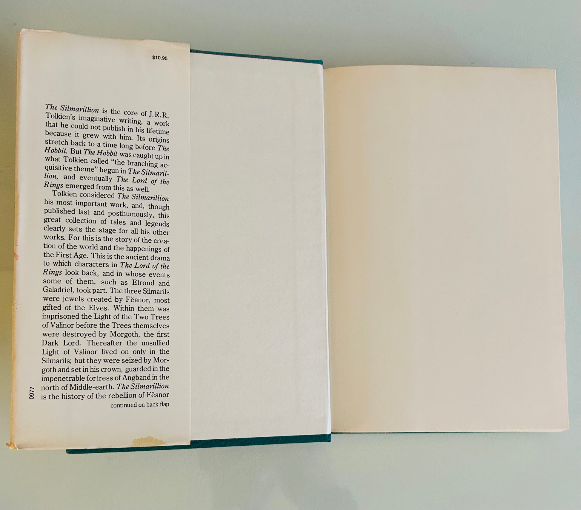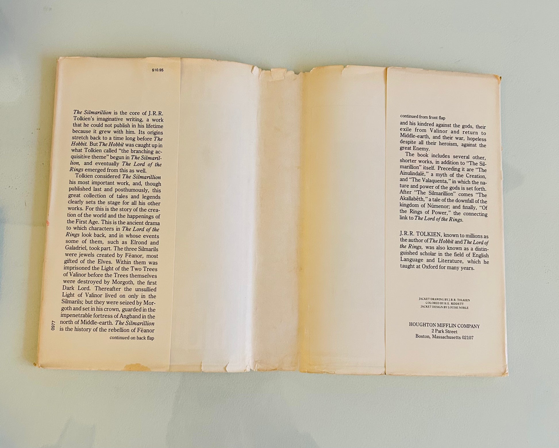 Most likely part of the 2nd run of the 1st U.S. printing with the following points intact as required by Hammond and Anderson (A15), notably; Father Giles (see photo) instead of Farmer Giles pg 3, misprints on pages 330 and 352 that were corrected in a later impressions. No period after Feanor on p.330, line 4, the word "and" between "Lord of Waters and King of the Sea" is in italics on p.352, line 39. However; they do have the full lines of print on the right side of the type block on page 229 (midway down the page, corrected at 2nd run of the 1st printing.) and the jacket contains the $10.95 US price. This indicates these are probably the 2nd run of the 1st printing that occurred before the September 15, 1977 publication date of the 1st Edition. There where two print houses that did the 1st & 2nd run of the first printing in August 1977 and there does not appear to be a priority as to which run was release as 1st Edition, 1st printing. The 3rd and 4th printings were done in the beginning September before the 15th publication date thus they were also marked 1st Edition, 1st printing.