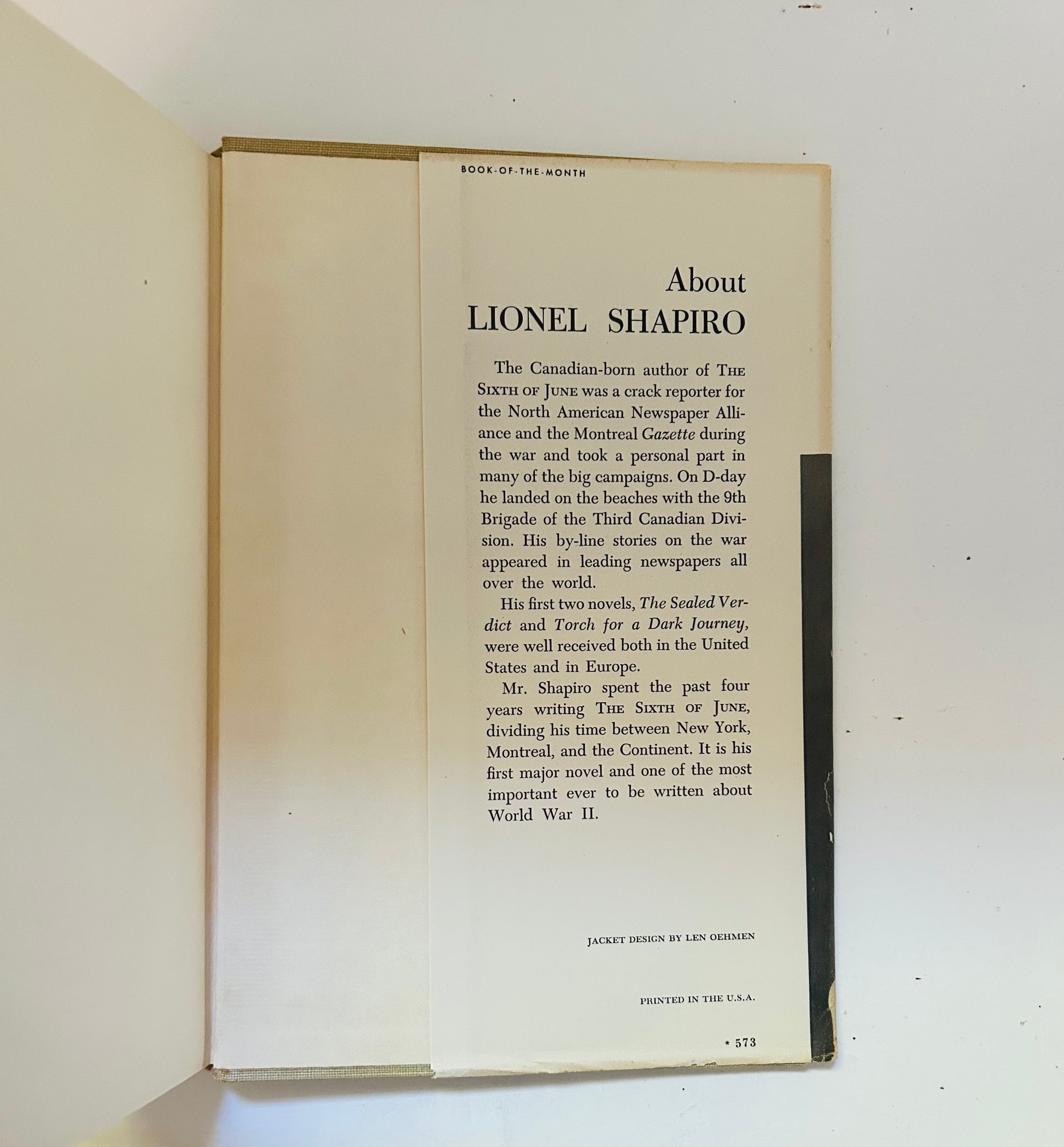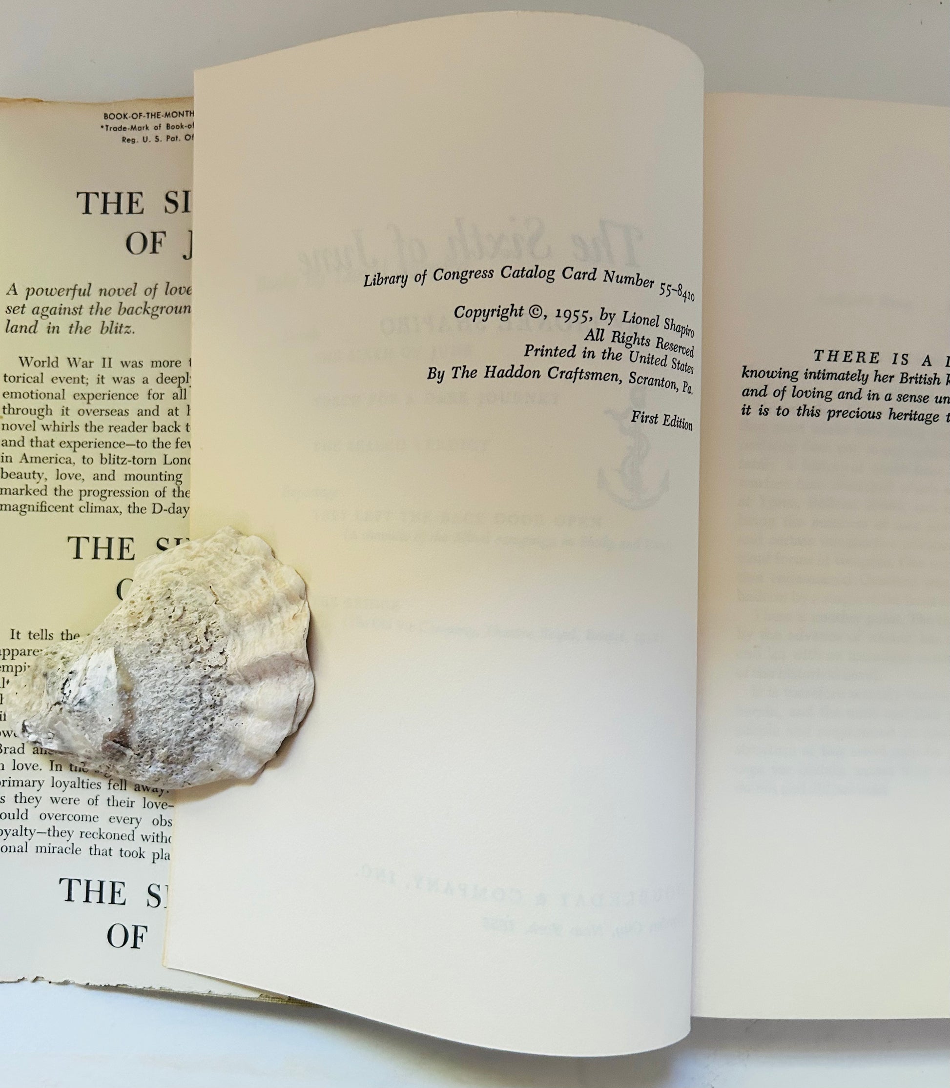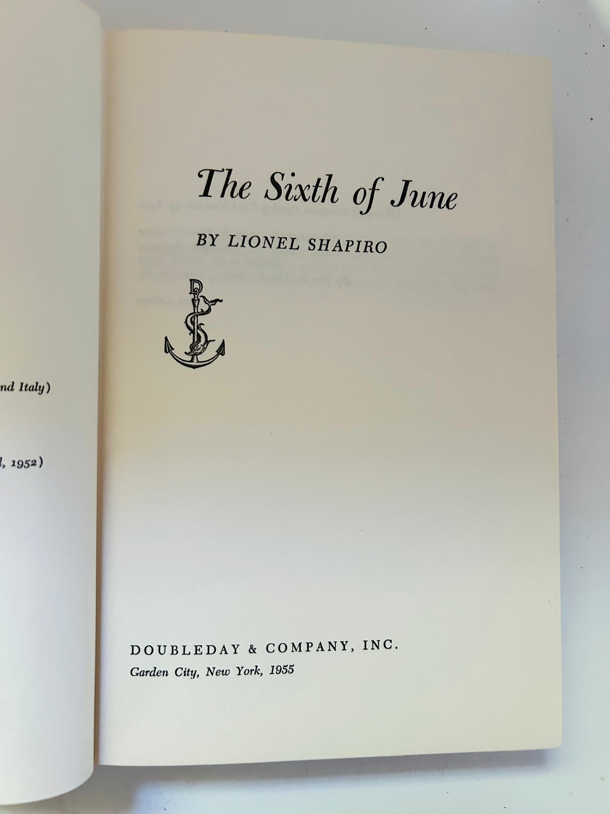 Lionel Shapiro. First edition (stated), later printing. BCE. New York: Doubleday, 1955. The unclipped dust jacket is in Very Good+ condition. Dust jacket design by Len Oehmen. Some chipping on front inside flap otherwise looks vibrant. There is no price listed on inside flap of jacket. Hardcover is in Very Good+ condition as well. No writing or markings in the book, very clean for a book about 75 years old. There is no price on inside flap on jacket as well as a "dot" on rear corner of the book denoting a book club edition.