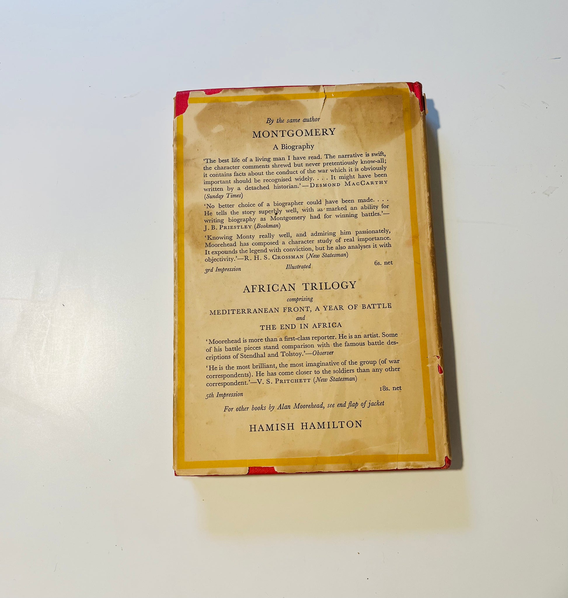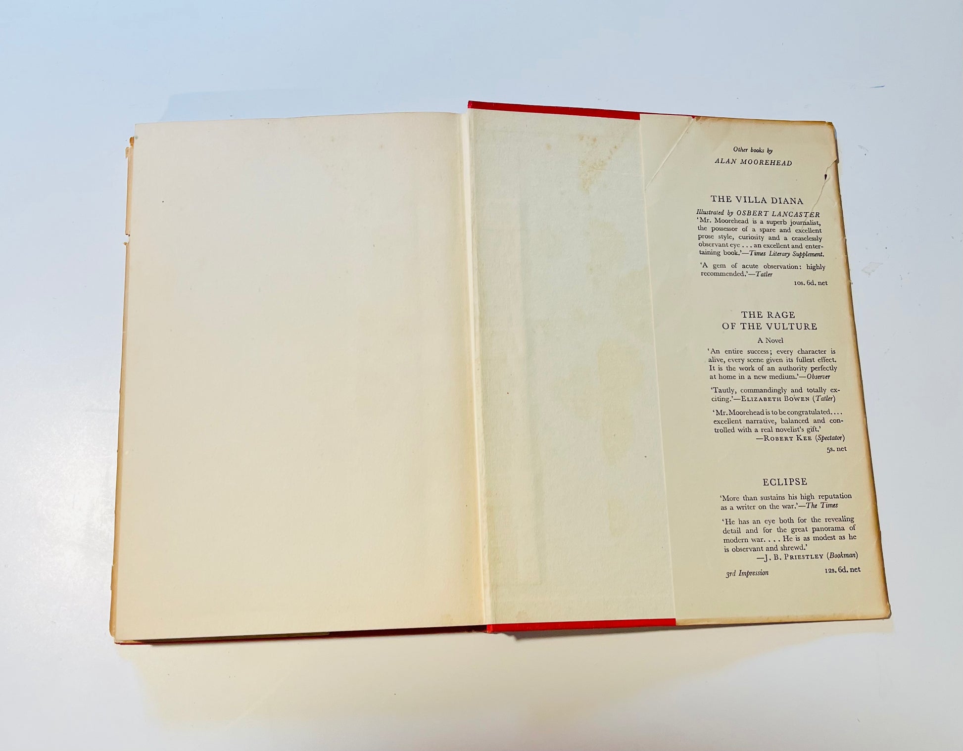 Alan Moorehead. First edition, second printing. Dust Jacket: Good. An unclipped jacket with original price intact. The jacket has a stain on rear, foxing and pieces missing on top/bottom of spine. Hardcover: Very Good+ London: Hamish Hamilton, 1952. Red cloth with white emblem and silver lettering on spine.