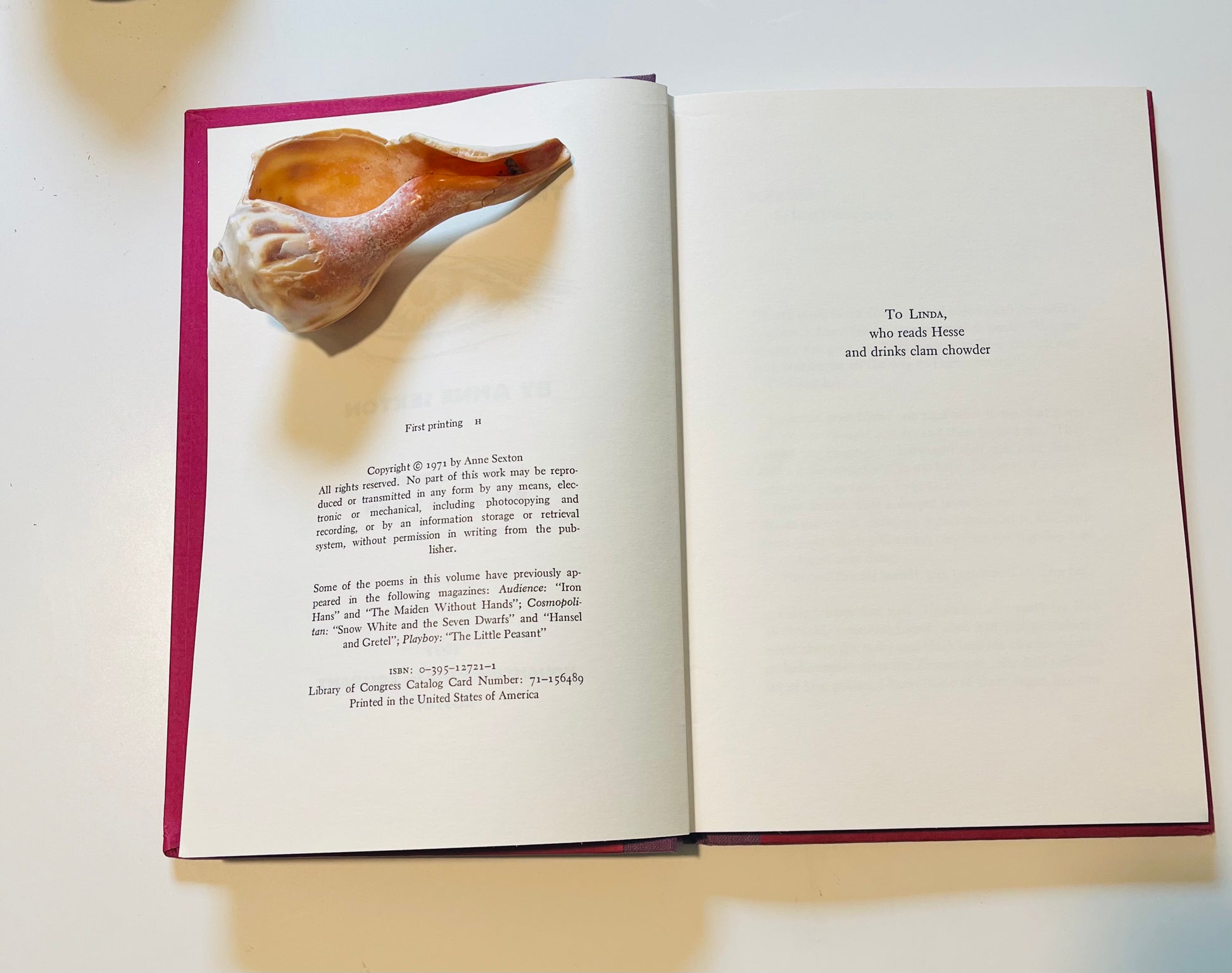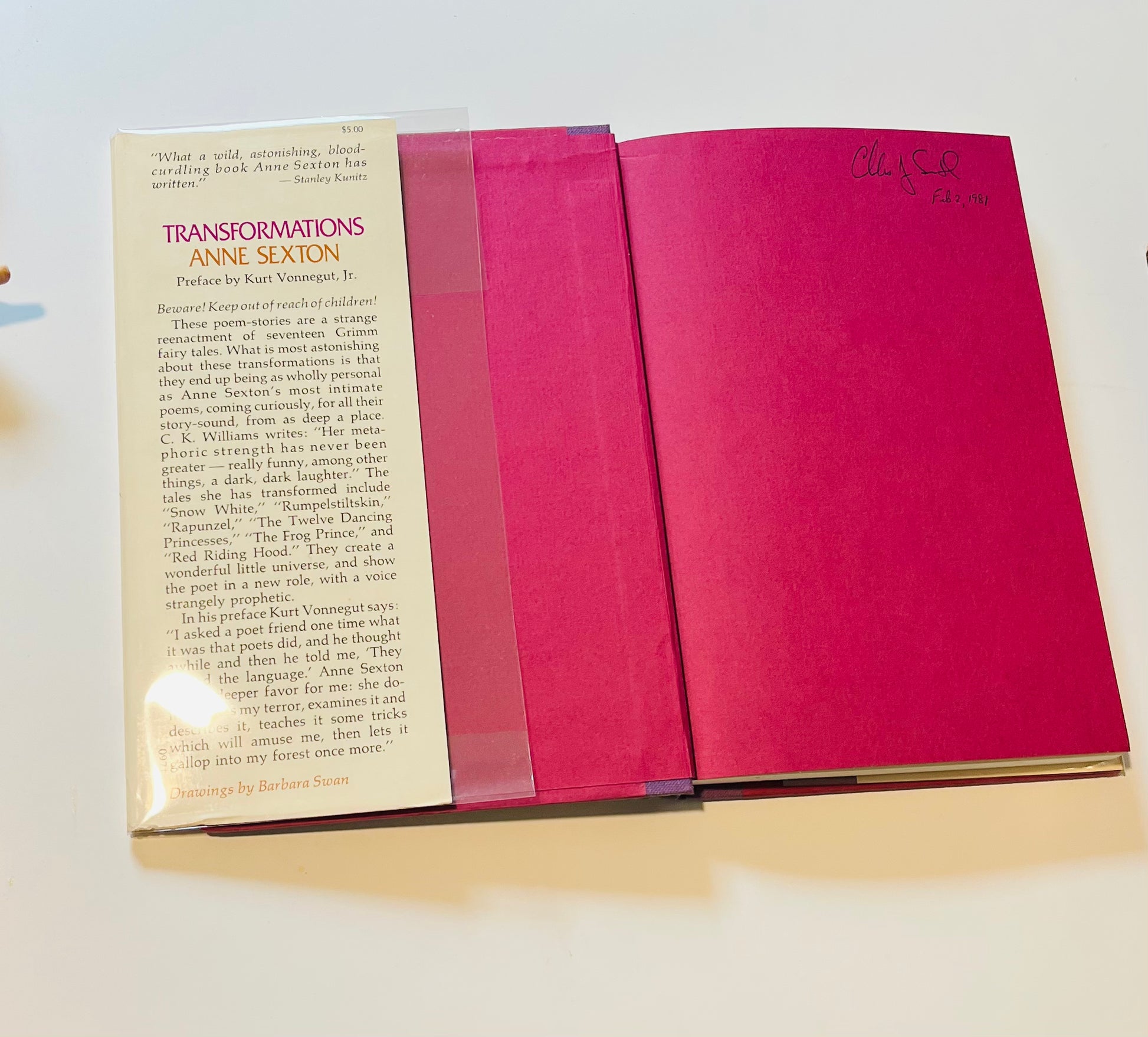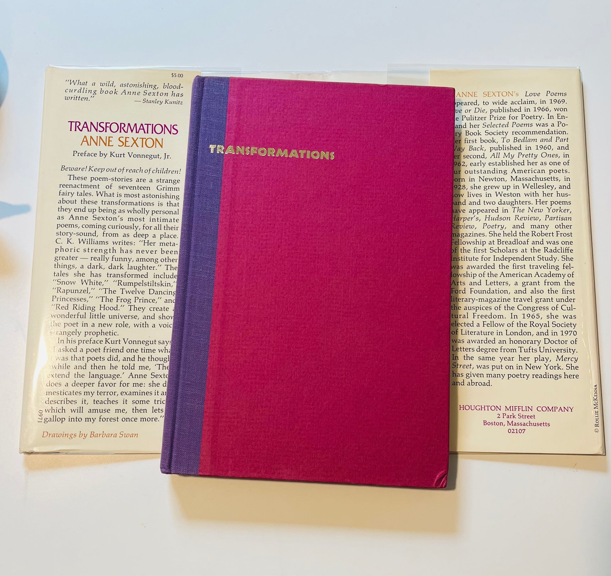 Anne Sexton. First edition, stated first printing. Dust Jacket: Near Fine. Has a smudge line but it's on mylar wrapper not jacket. An unclipped jacket with original price ($5.00) still intact. Hardcover: Near Fine. Boston: Houghton Mifflin Company, 1971. Preface written by Kurt Vonnegut, Jr. Drawings by Barbara Swan. Other than previous owner signature on flyleaf, no writing or markings in the book, 111 (112) pp. A beautiful from a beautiful poet.