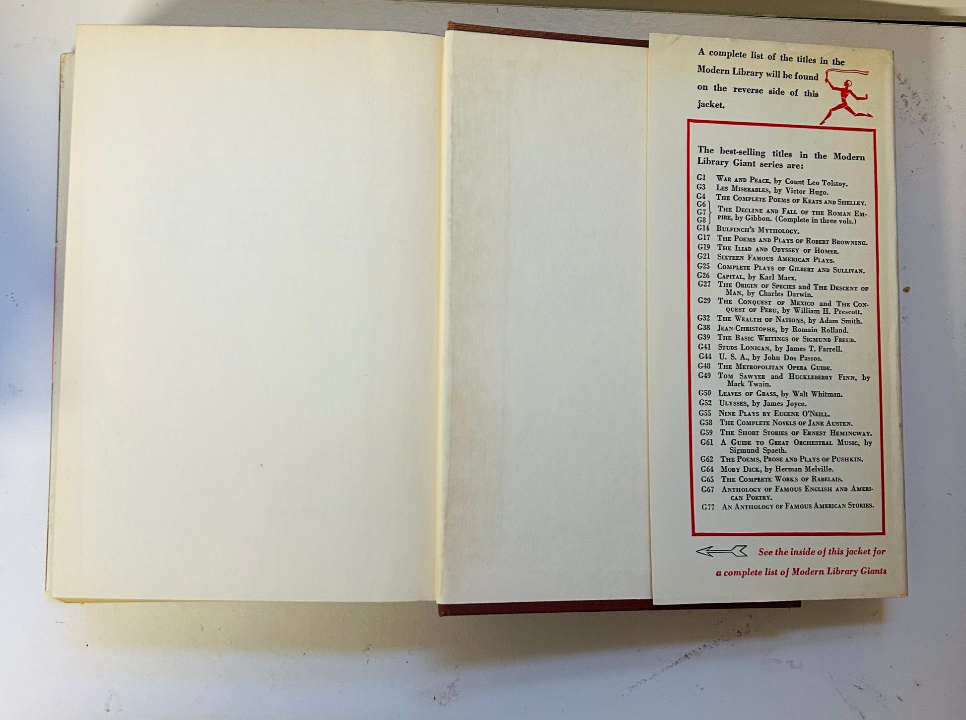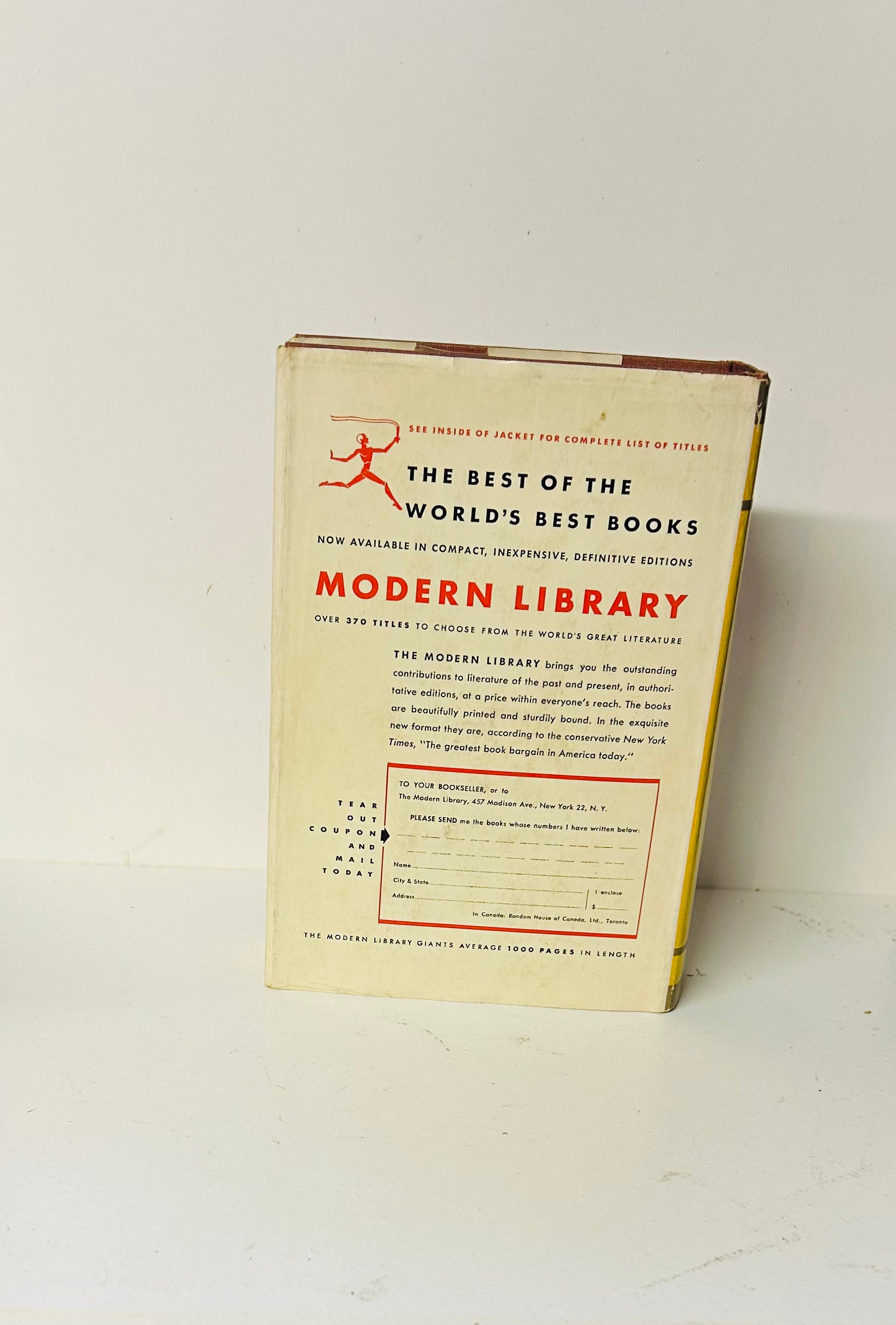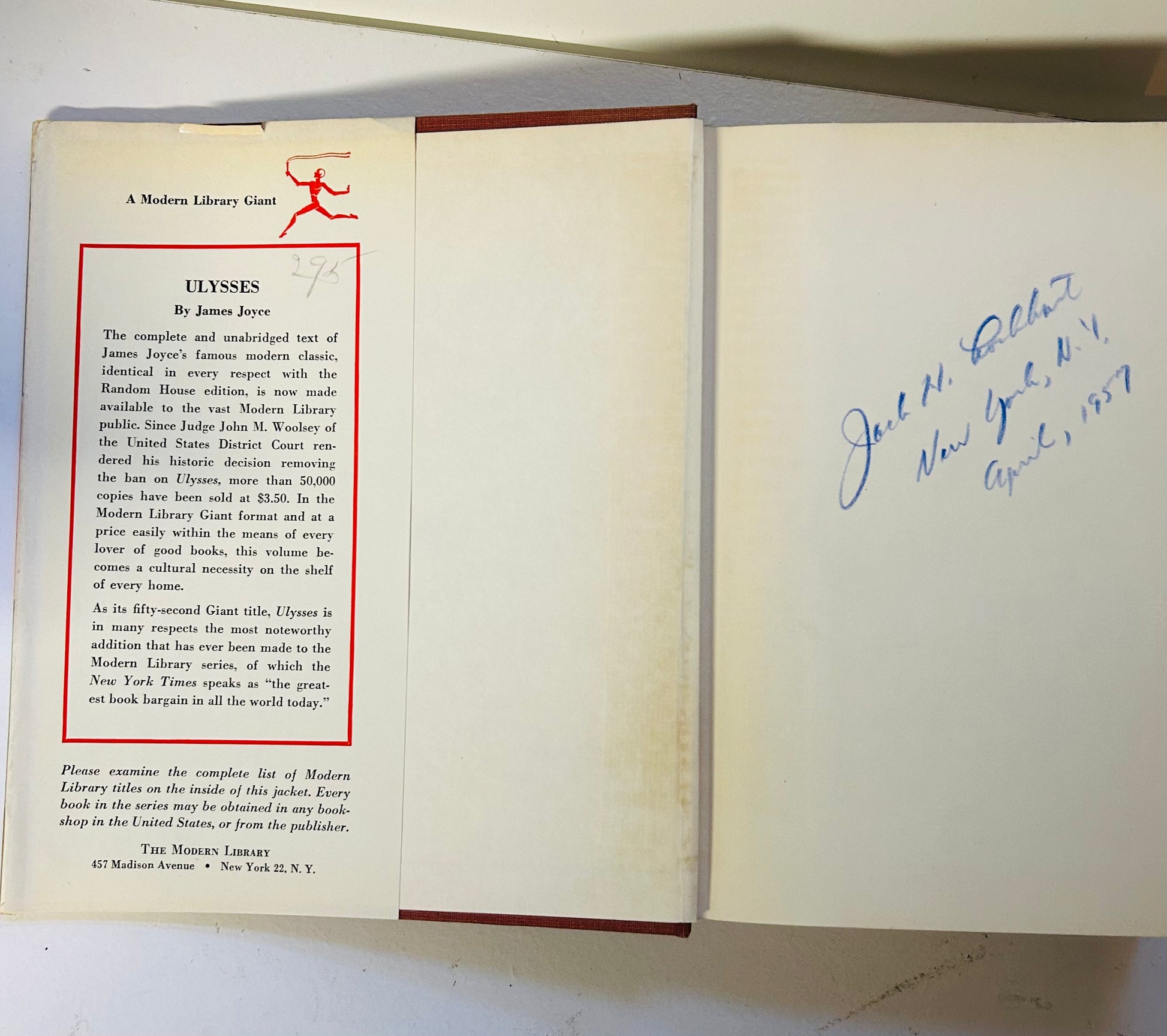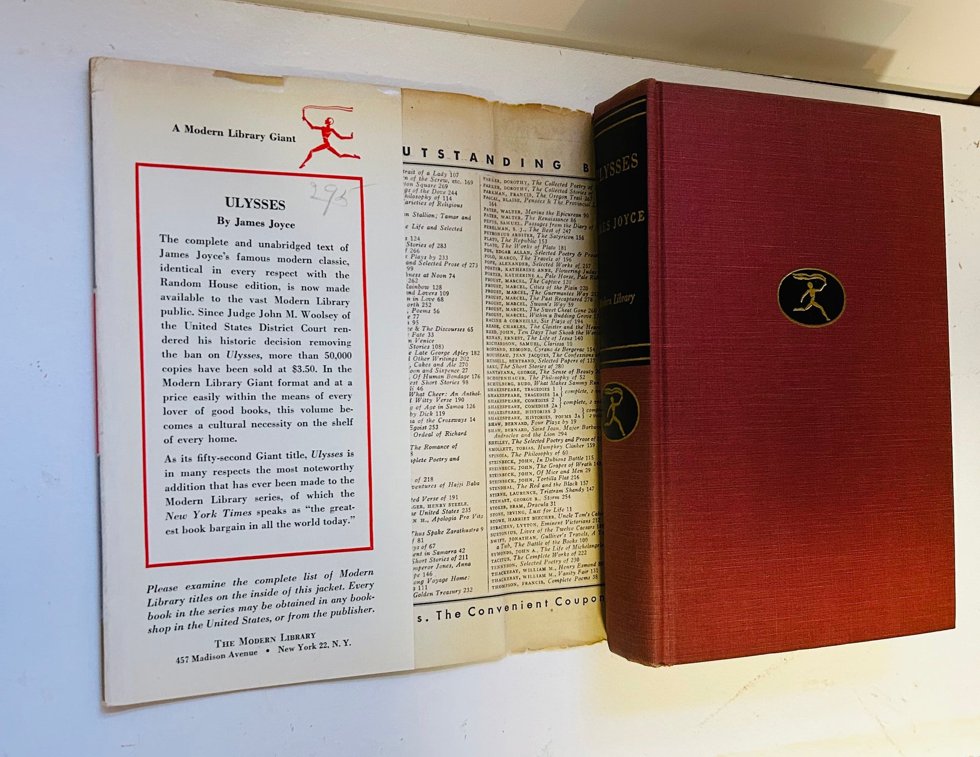 James Joyce. Modern Library Giant Edition, G52. BCE. New York: The Modern Library, 1946. Foreword by Morris L. Ernest. The unclipped dust jacket, with no price on inside flap, is in Very Good condition. Has some minor chipping on spine and edges. Hardcover is in Very Good+ condition. Other than owner signature on flyleaf, no writing or markings in the book, 768 pp.
