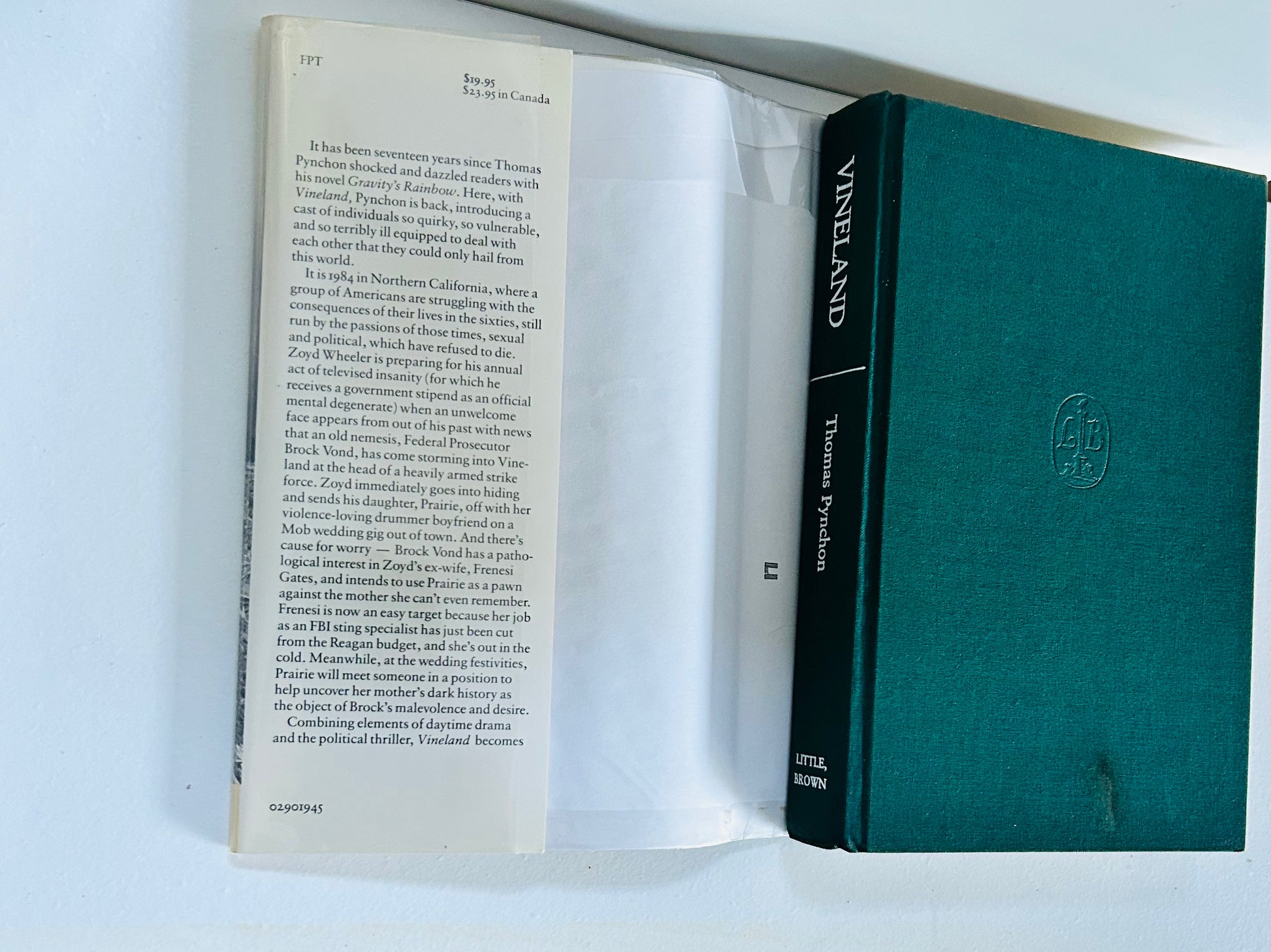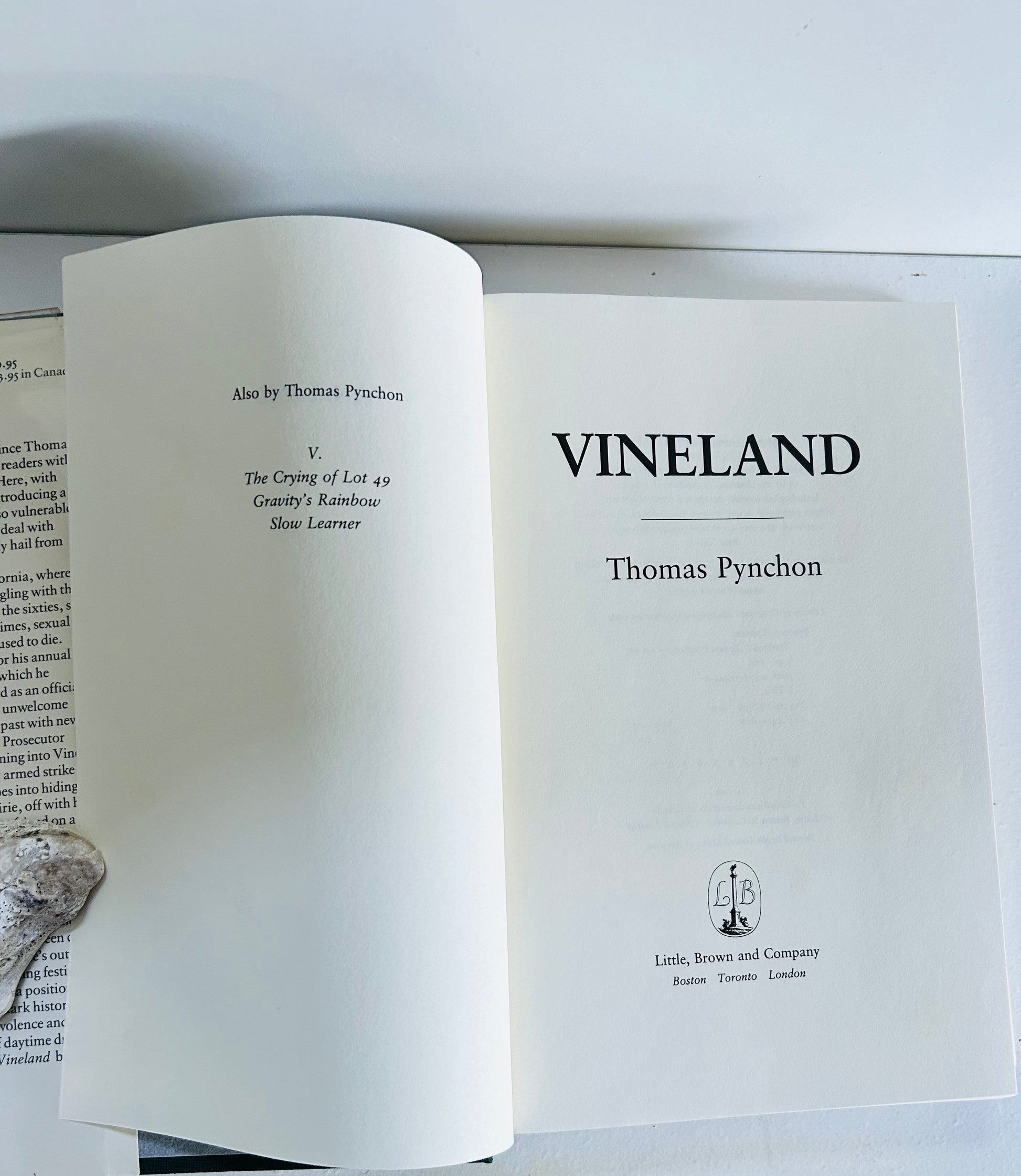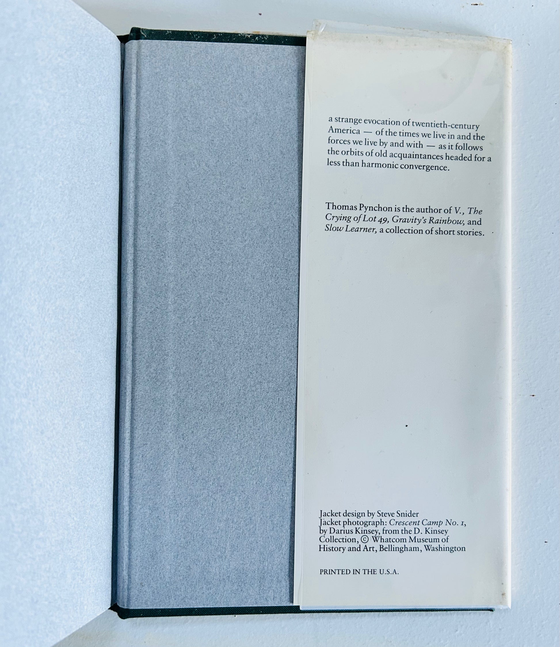 Thomas Pynchon. First American edition (stated), first printing. Boston: Little, Brown and Company, 1990. Both hardcover and dust jacket in Very Good condition. Dust jacket is unclipped, in a mylar protective wrapper, with a small burn hole found on the lower front side of jacket. Dust jacket designed by Steve Snider. No writing or markings in this well preserved edition, 385 pp. NB: There three blemishes with the book which include the following. First, a small burn hole though the jackets "N" in authors name, as a result, there is a small stain on front book cover. Thirdly, one side of the flyleaf page was removed by previous owner. The integrity of the book is solid though.