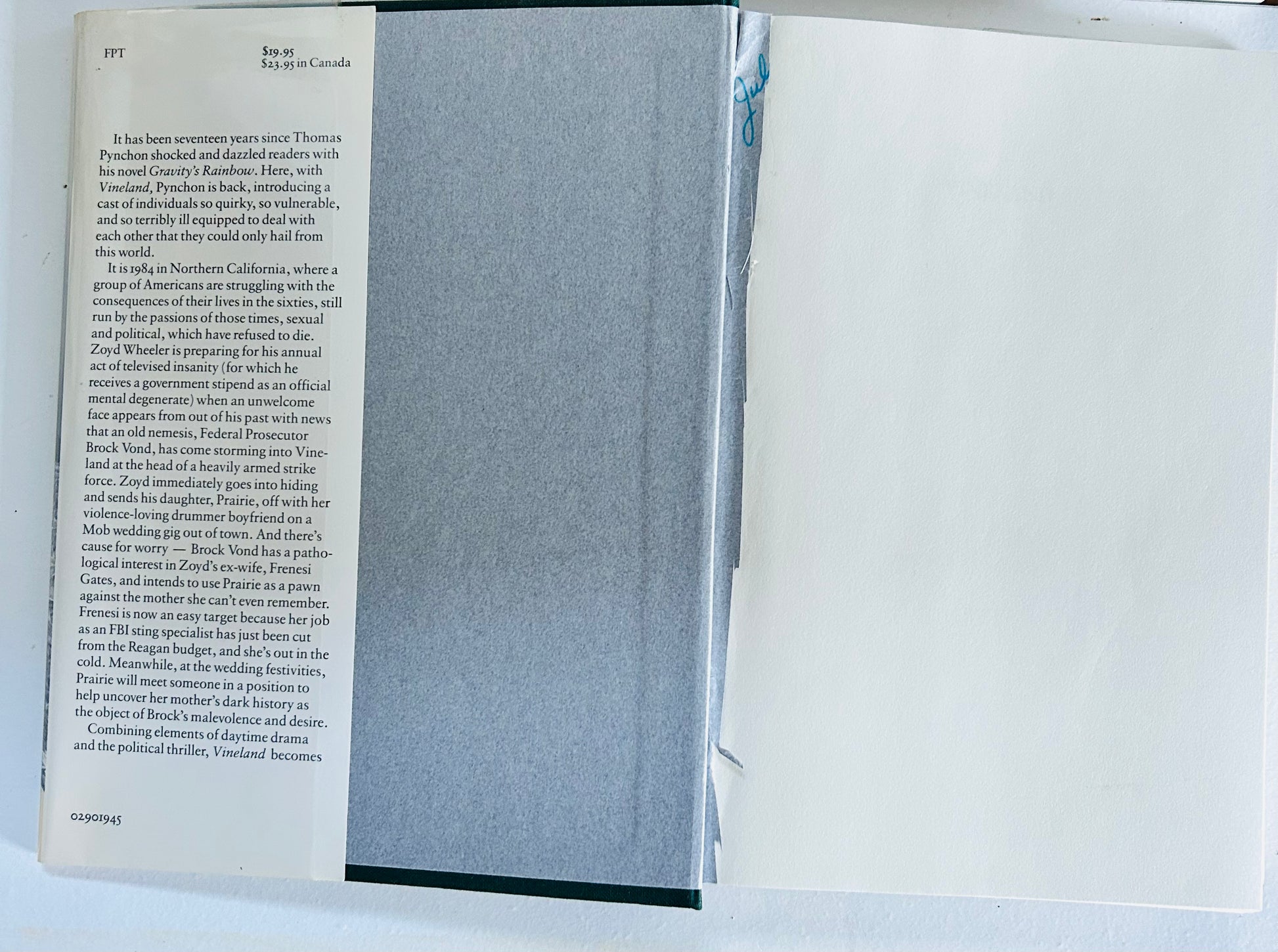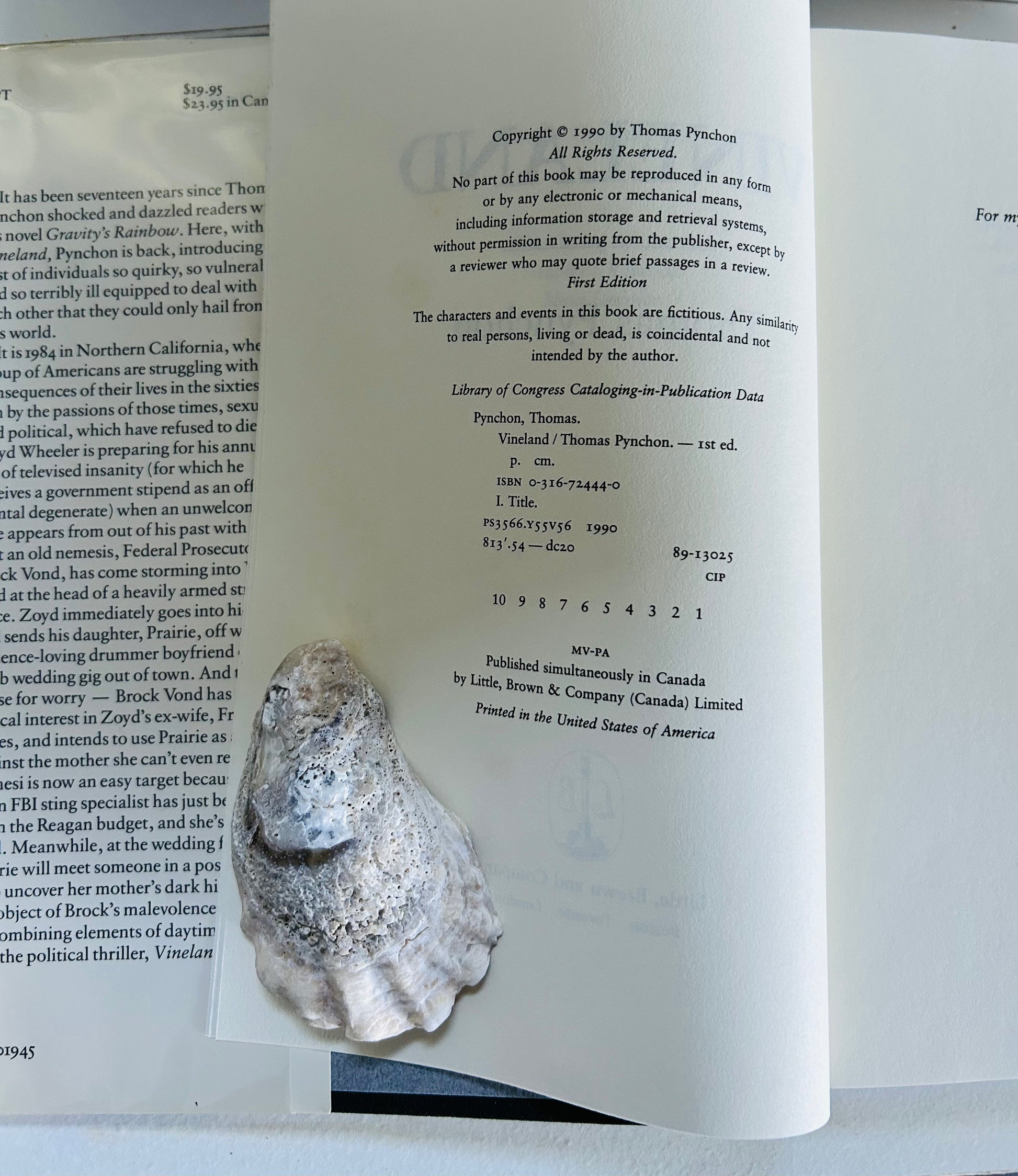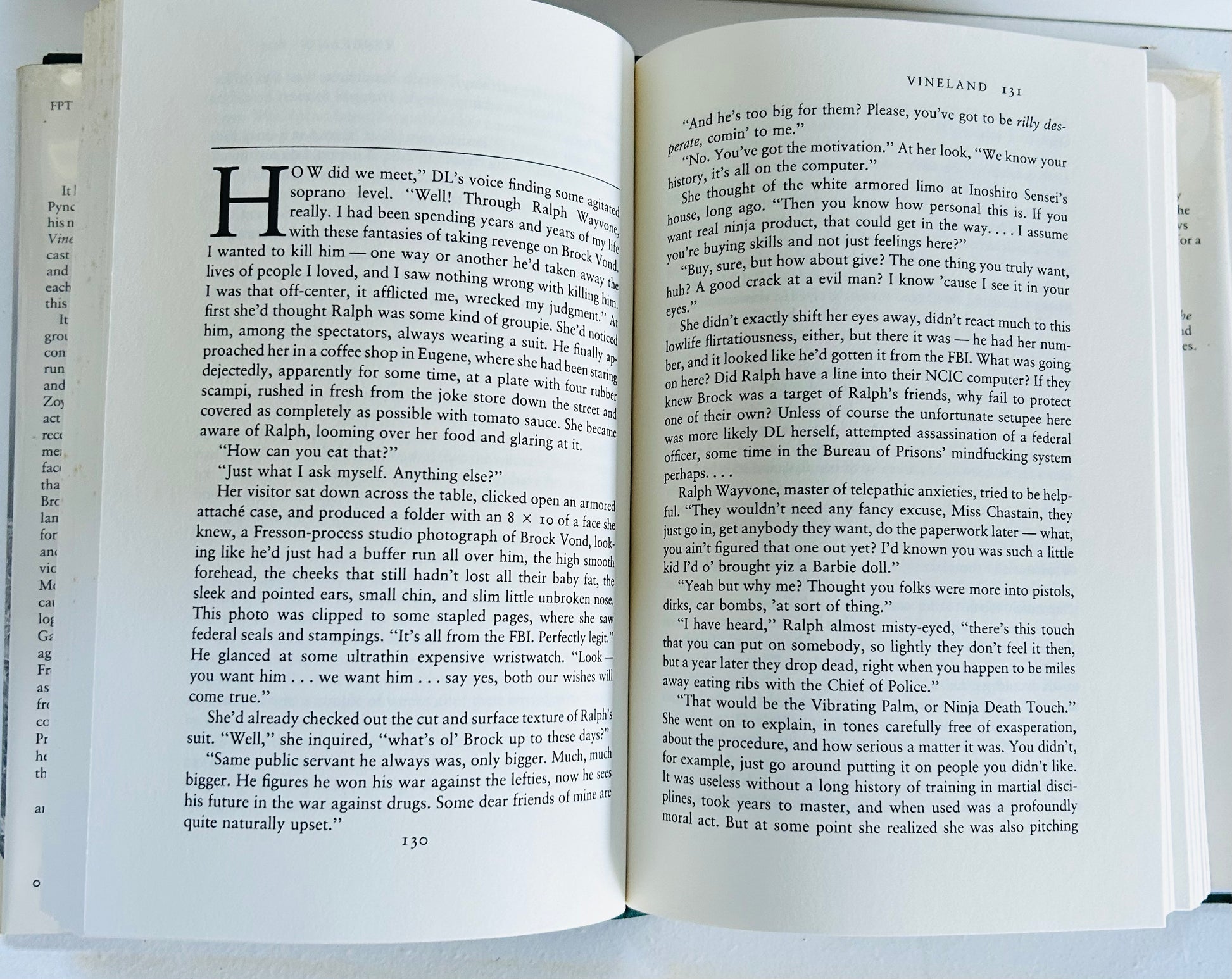 Thomas Pynchon. First American edition (stated), first printing. Boston: Little, Brown and Company, 1990. Both hardcover and dust jacket in Very Good condition. Dust jacket is unclipped, in a mylar protective wrapper, with a small burn hole found on the lower front side of jacket. Dust jacket designed by Steve Snider. No writing or markings in this well preserved edition, 385 pp. NB: There three blemishes with the book which include the following. First, a small burn hole though the jackets "N" in authors name, as a result, there is a small stain on front book cover. Thirdly, one side of the flyleaf page was removed by previous owner. The integrity of the book is solid though.